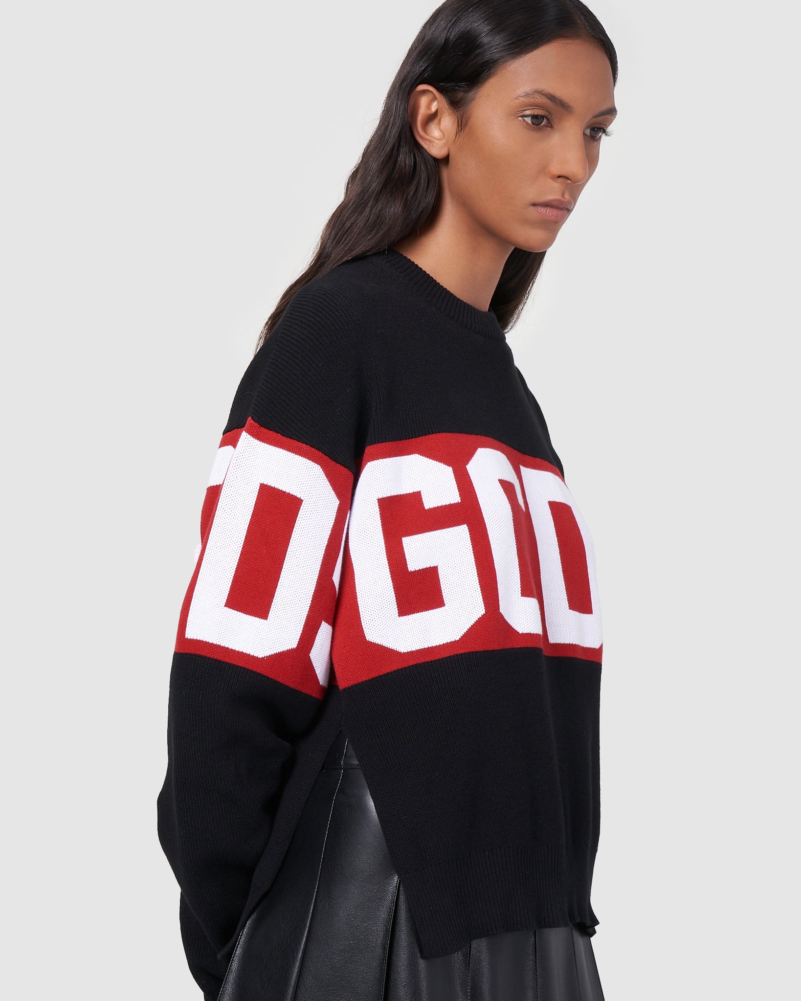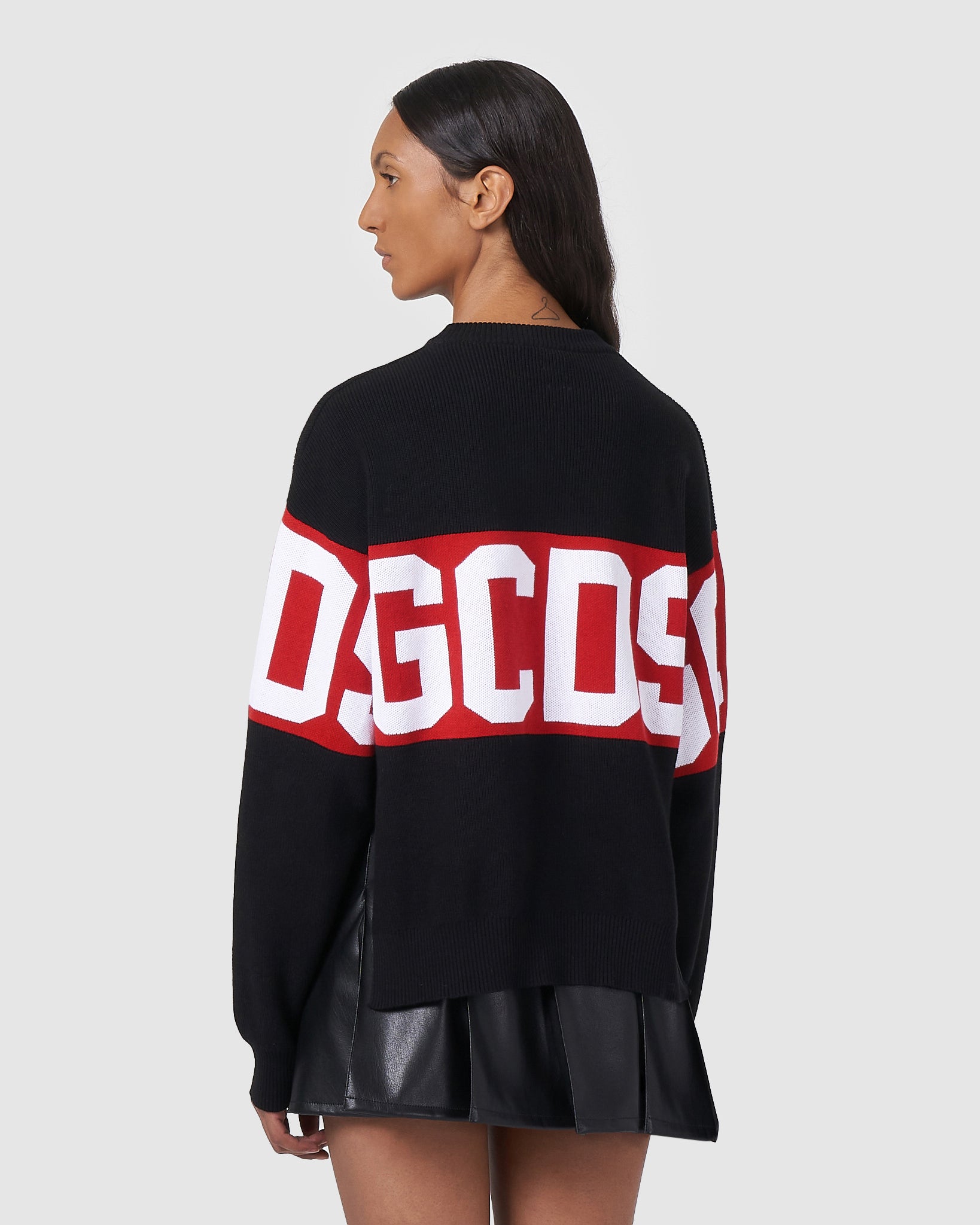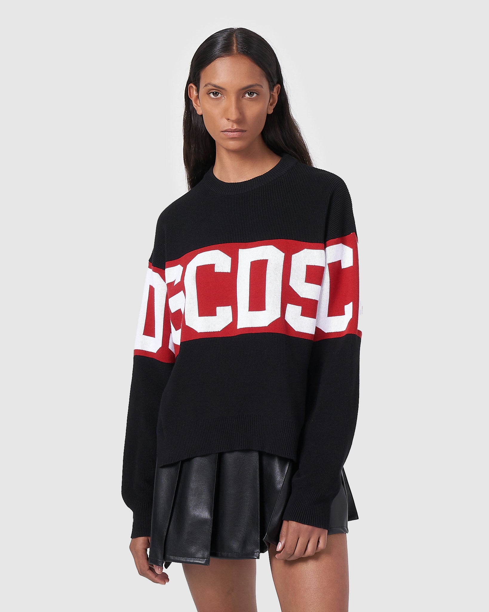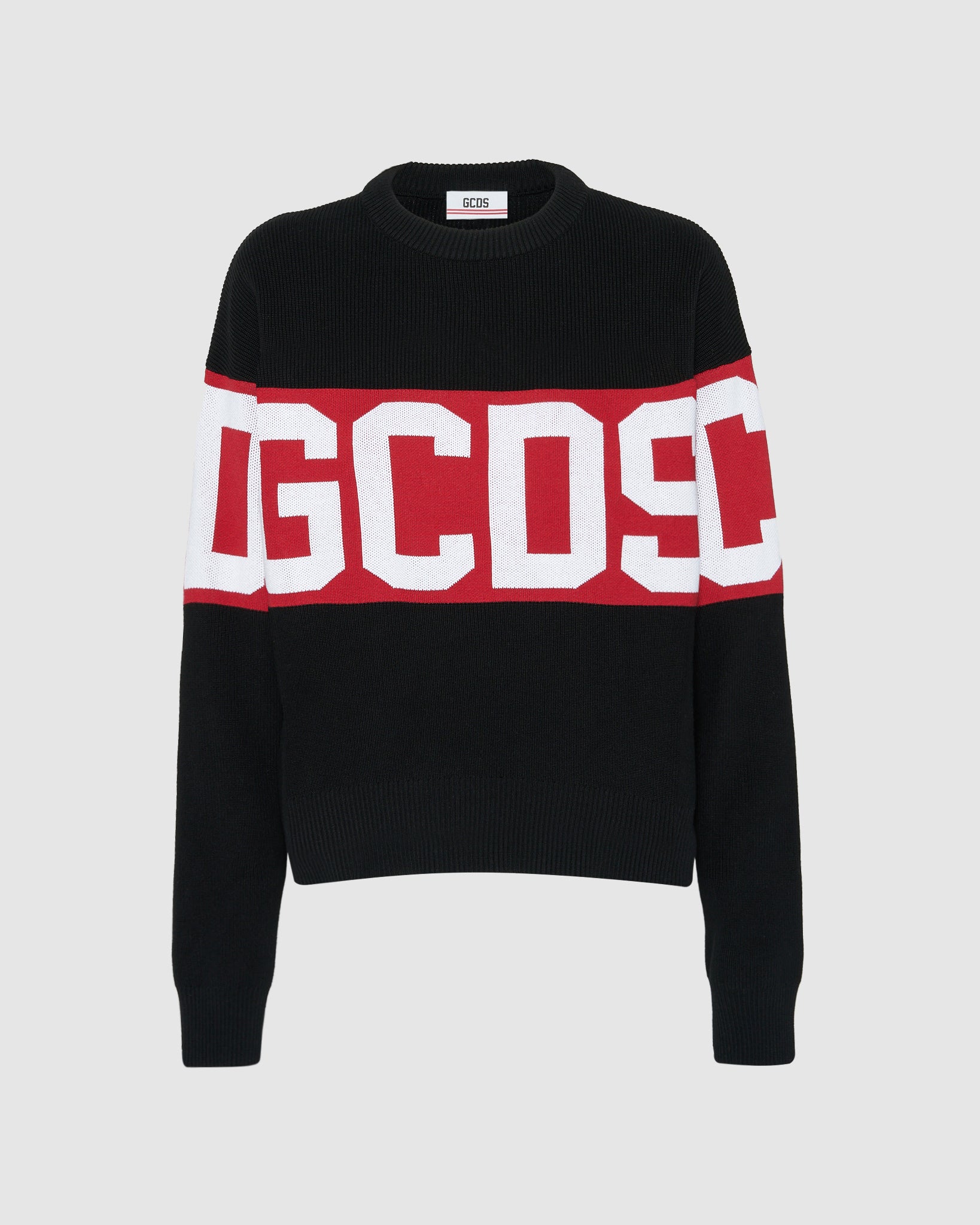 English rib stitch GCDS cotton crew neck sweater with iconic inlaid logo band on the front, back and sleeves. Side slits. Boxy fit.