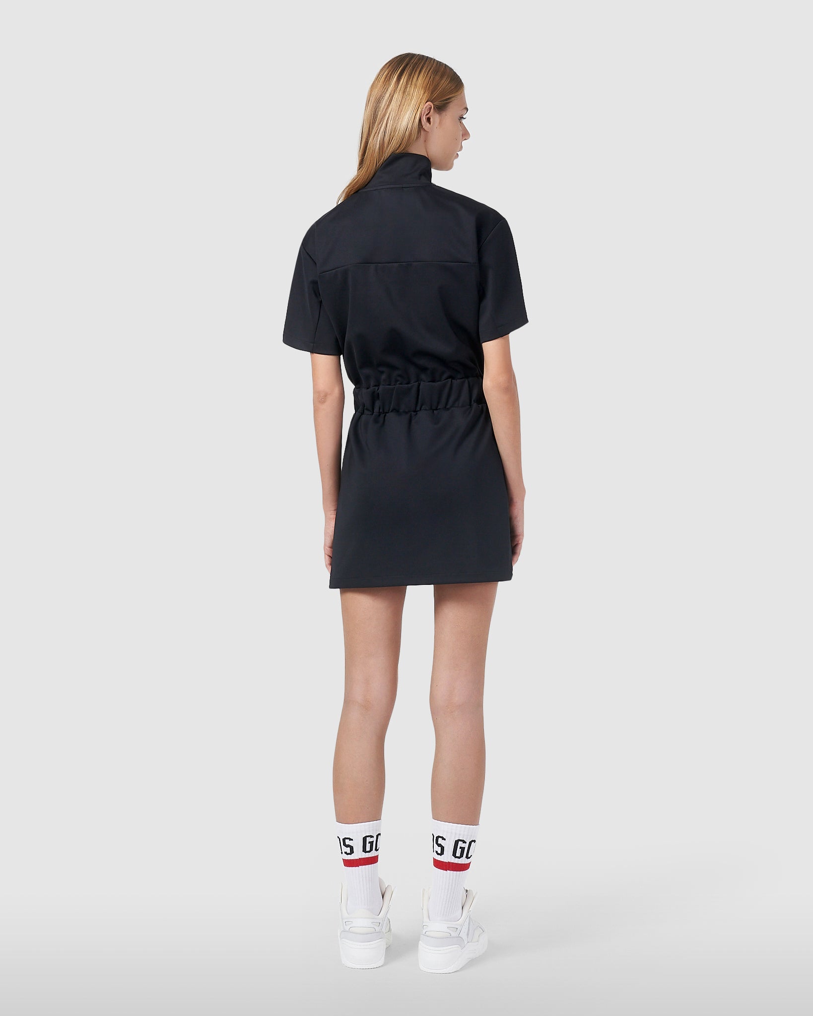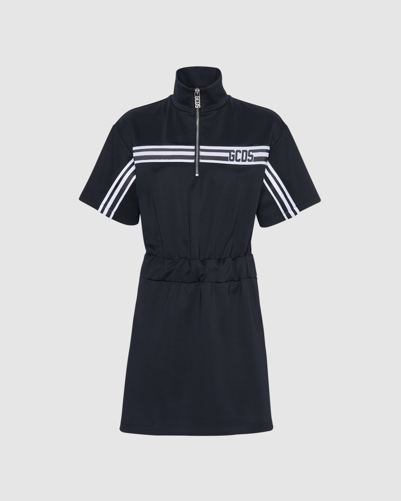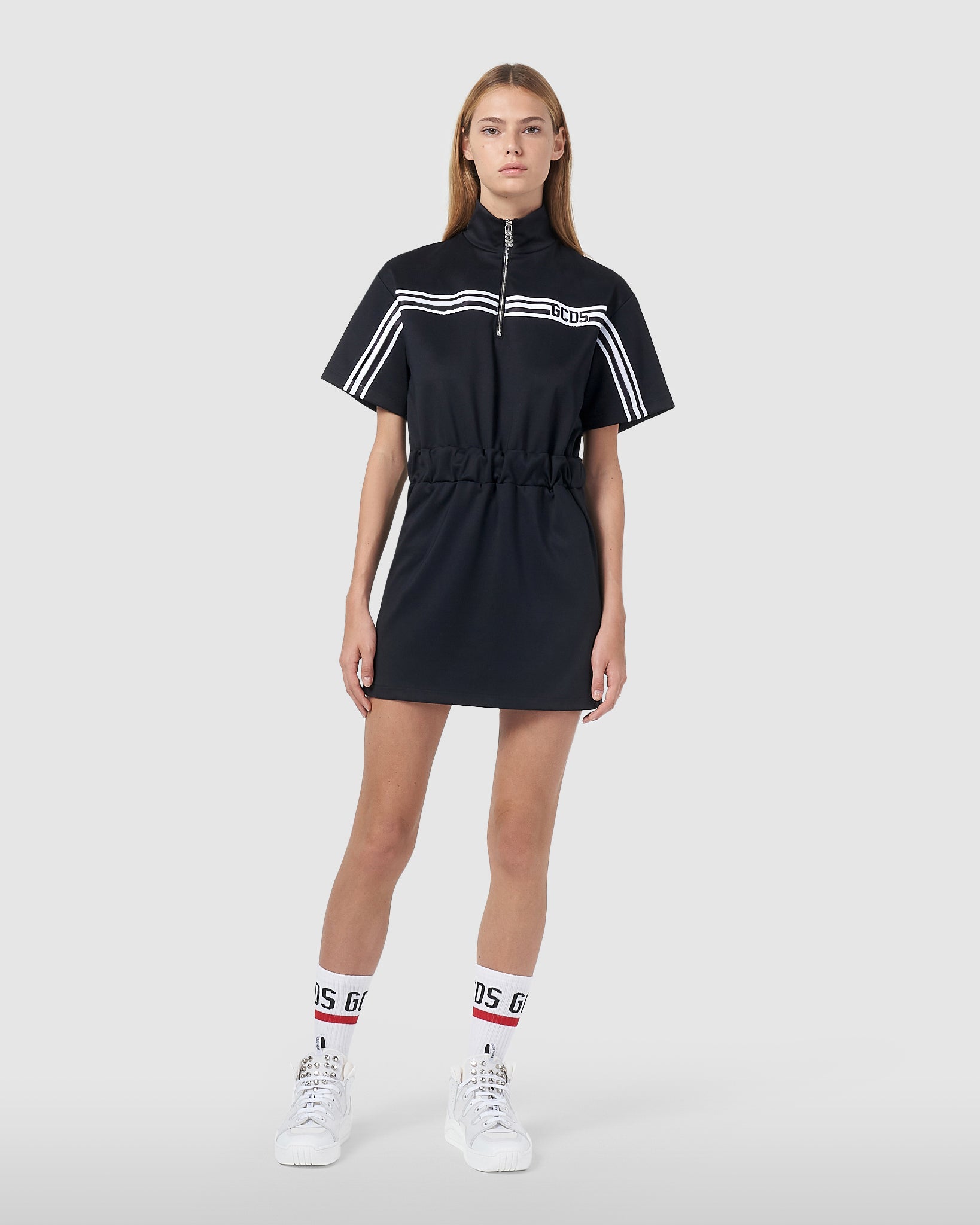GCDS short-sleeved polyester dress and logo band appliquéd on the front and sleeves. High neckline with zipper in the center. Elastic waistband.