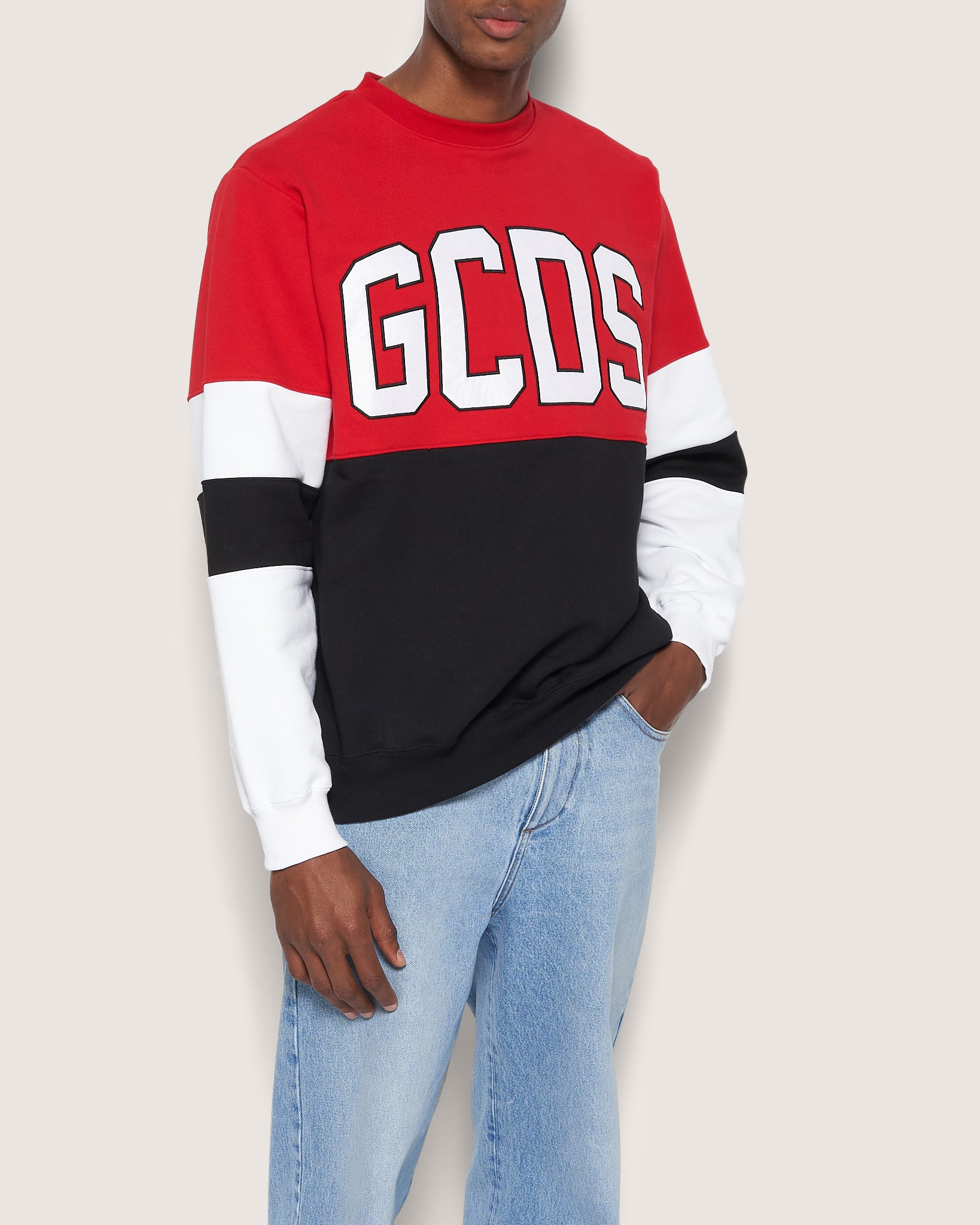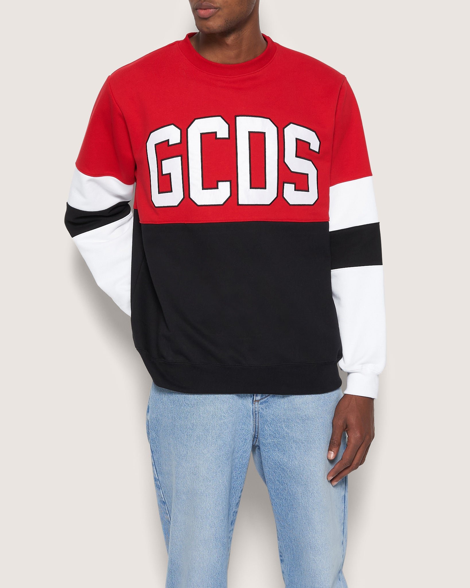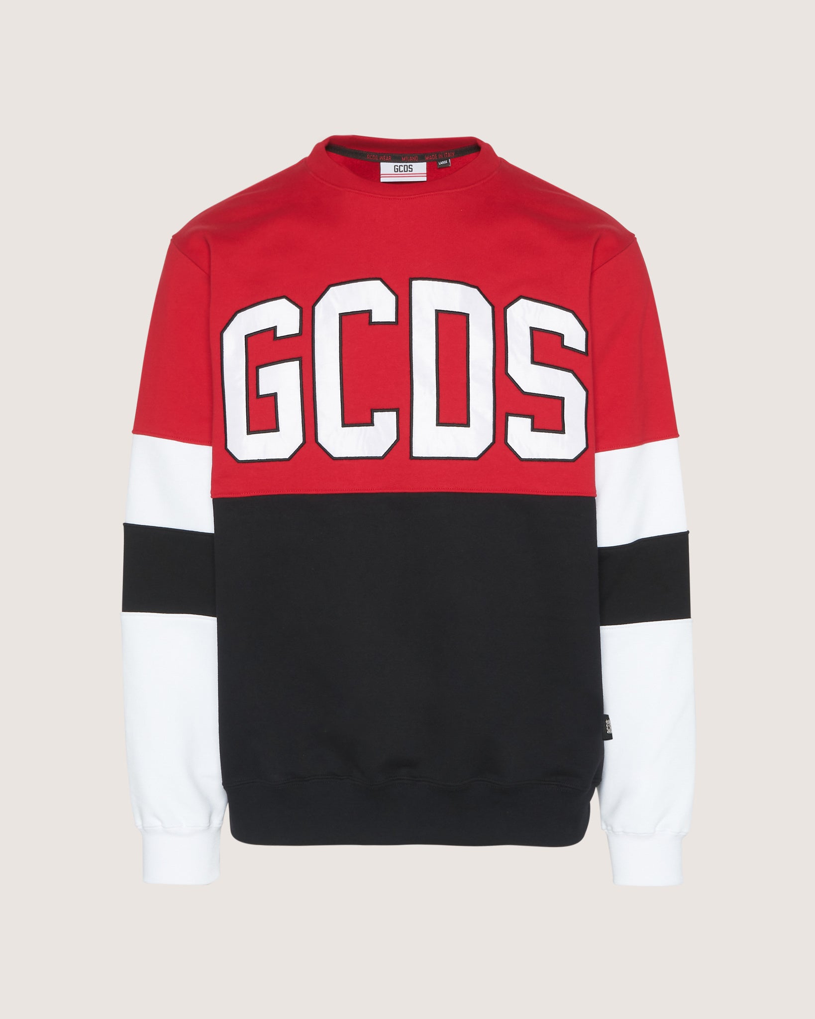 Three-color GCDS crew neck sweatshirt with satin logo embroidered on the front with cording. On the back of the neck, silicone logo patch. Regular fit.