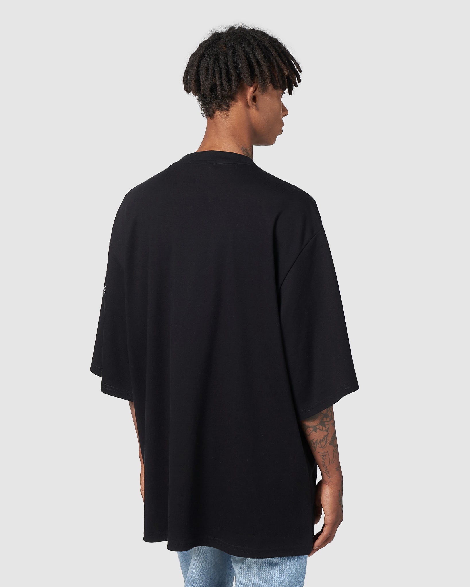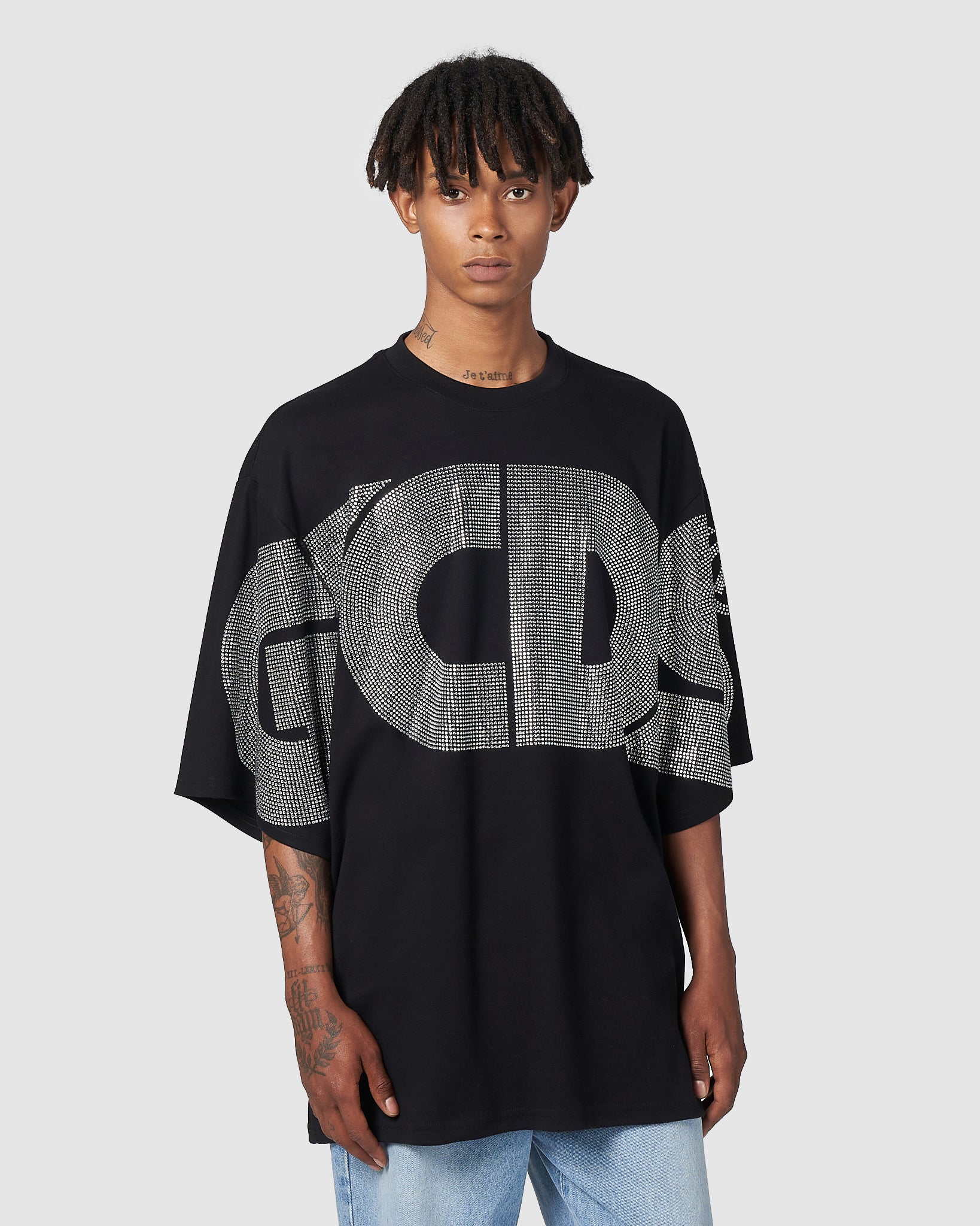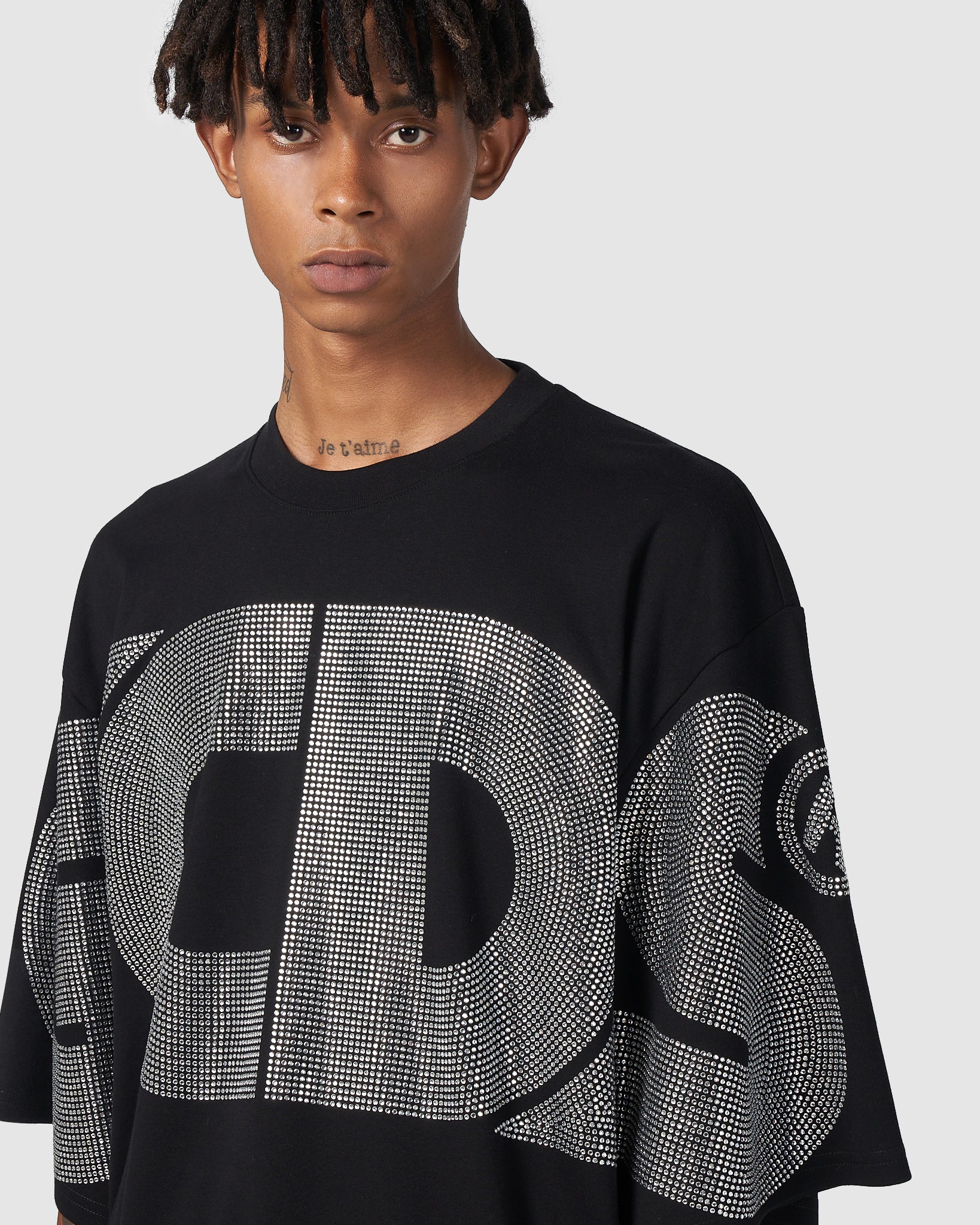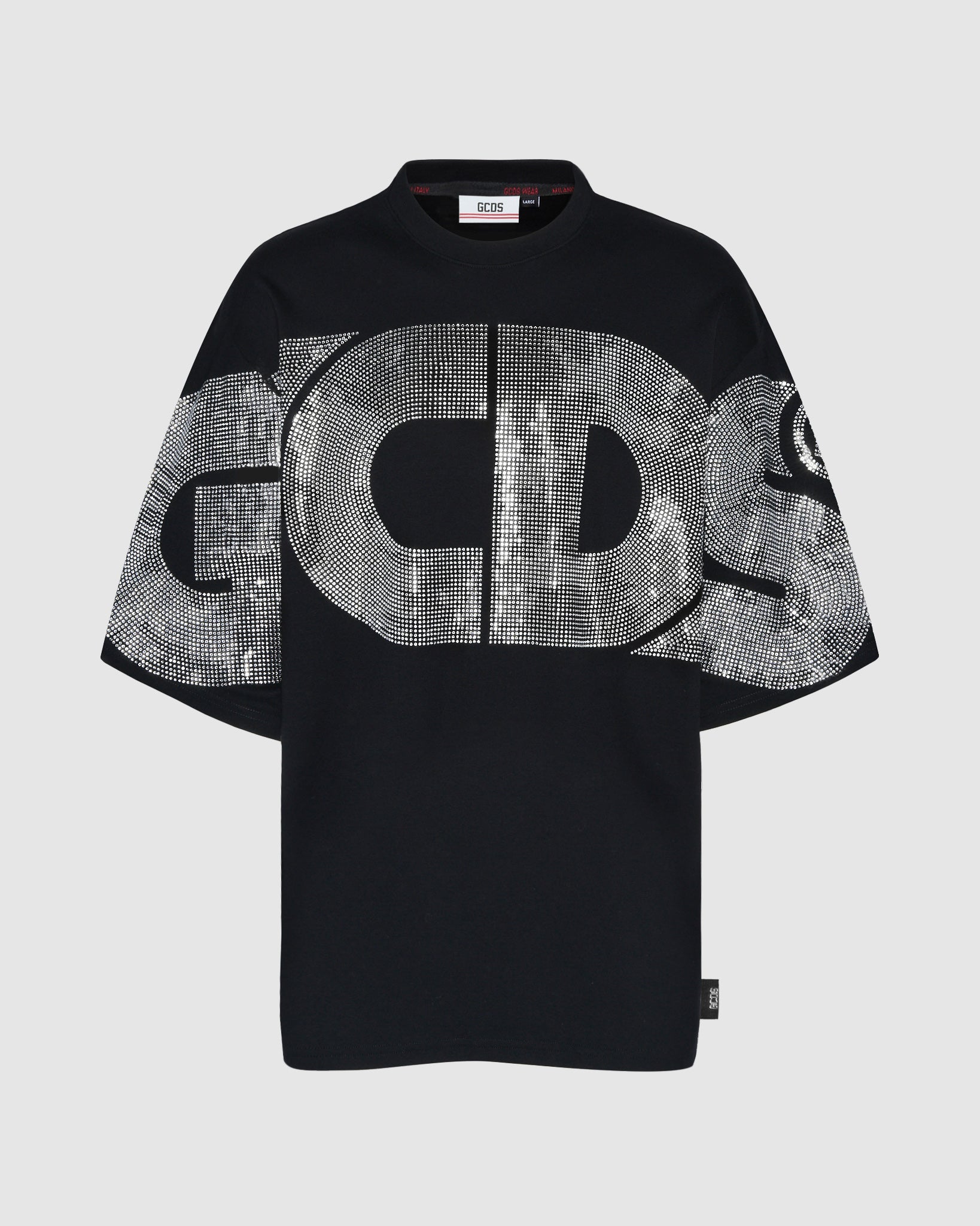 GCDS cotton T-shirt with full rhinestone logo, on the front and sleeves. Over-sized.