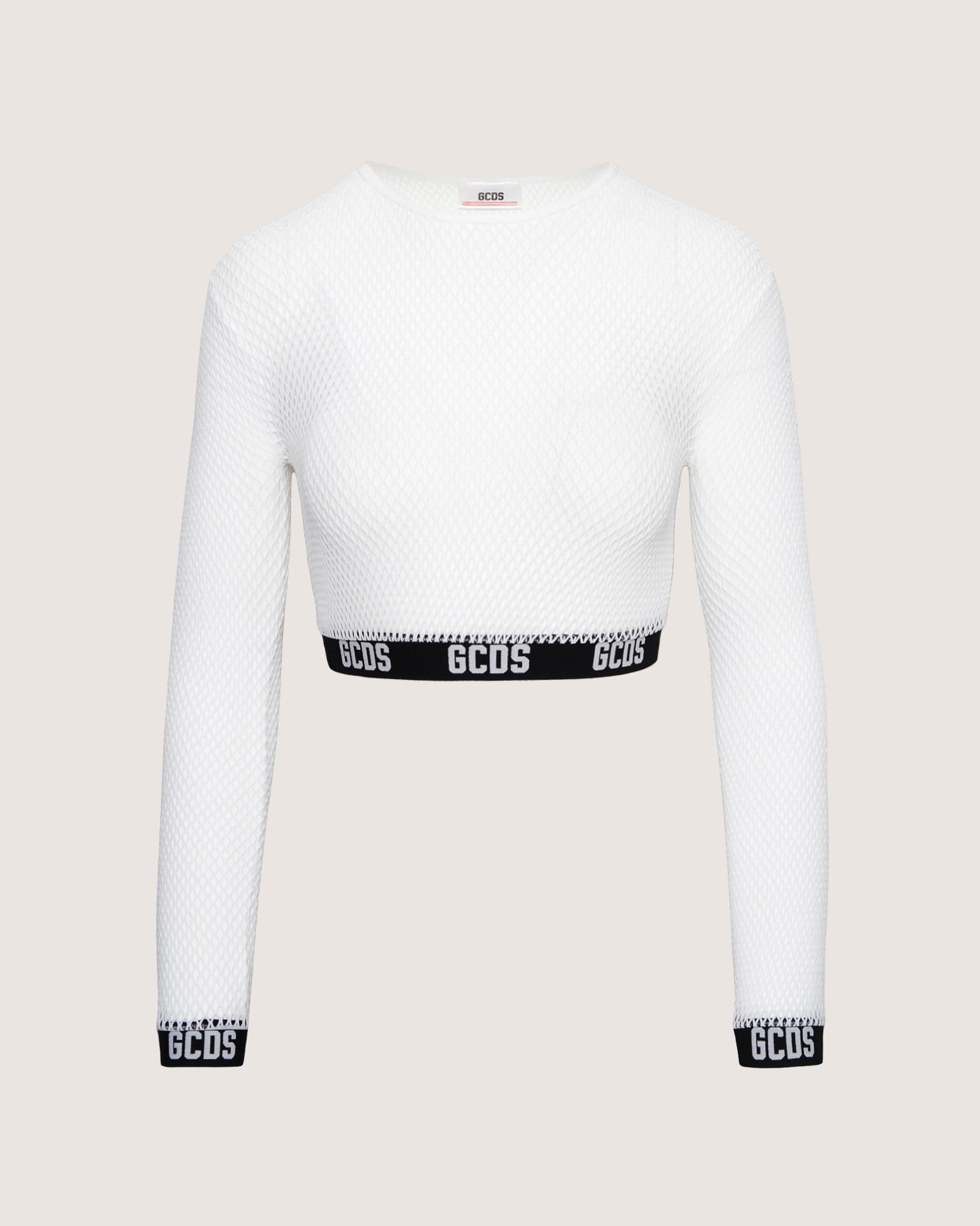 Fishnet Cropped Top with long sleeves and elastic logo band.