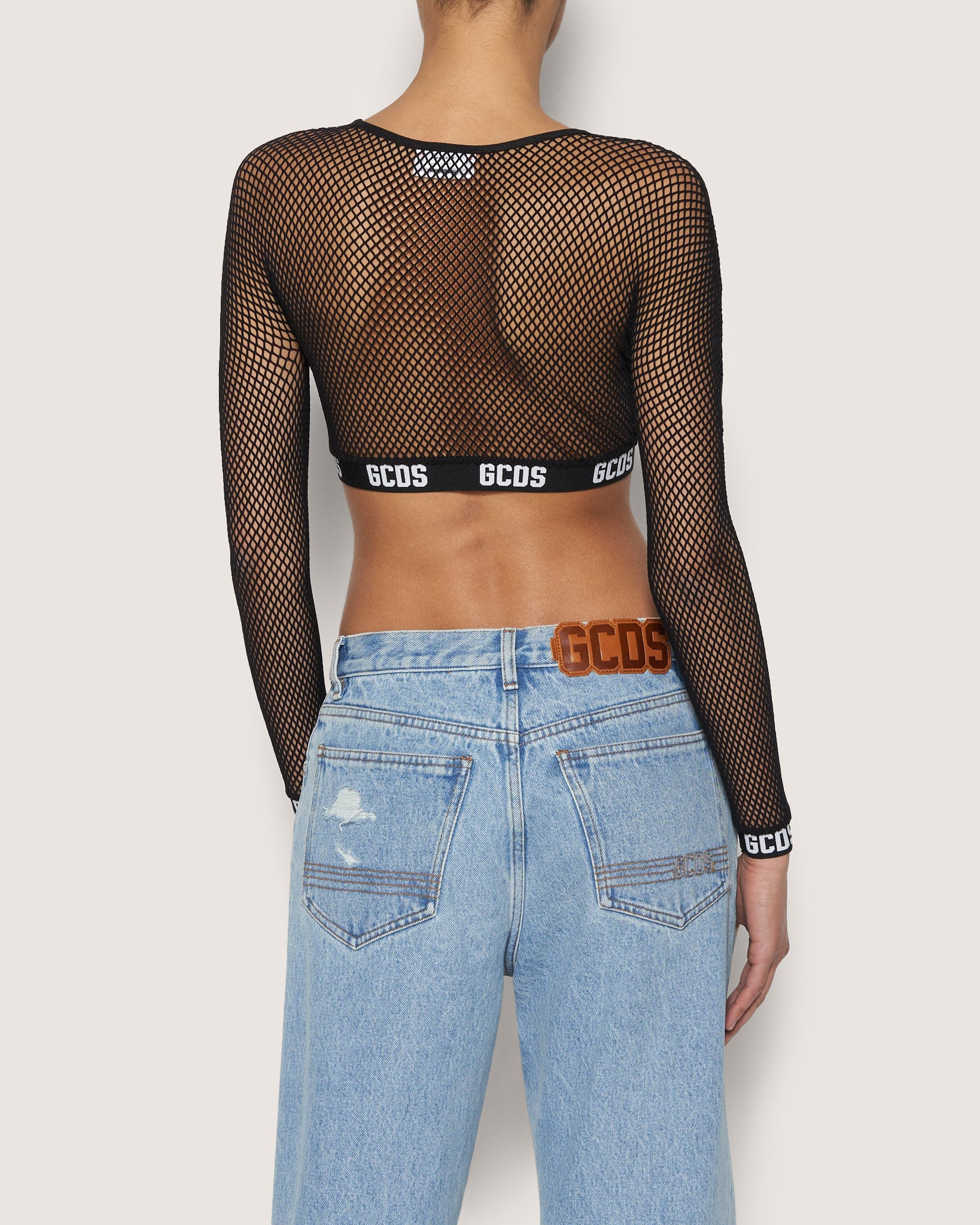 Fishnet Cropped Top with long sleeves and elastic logo band.