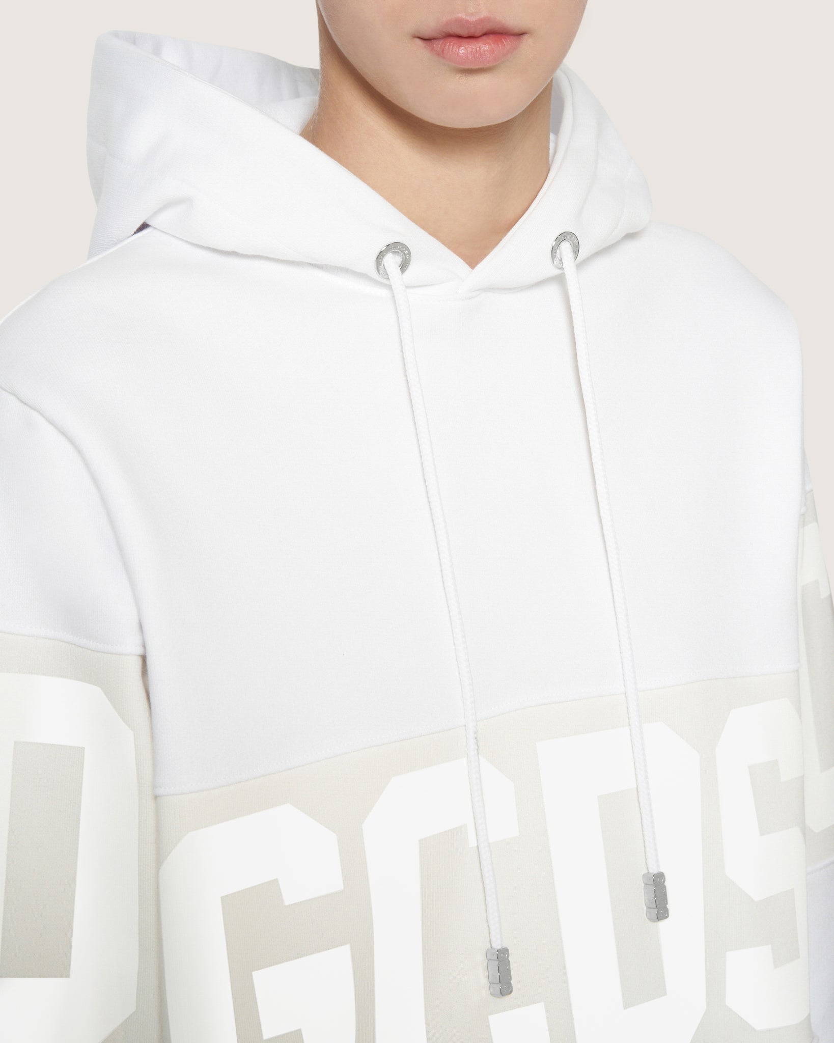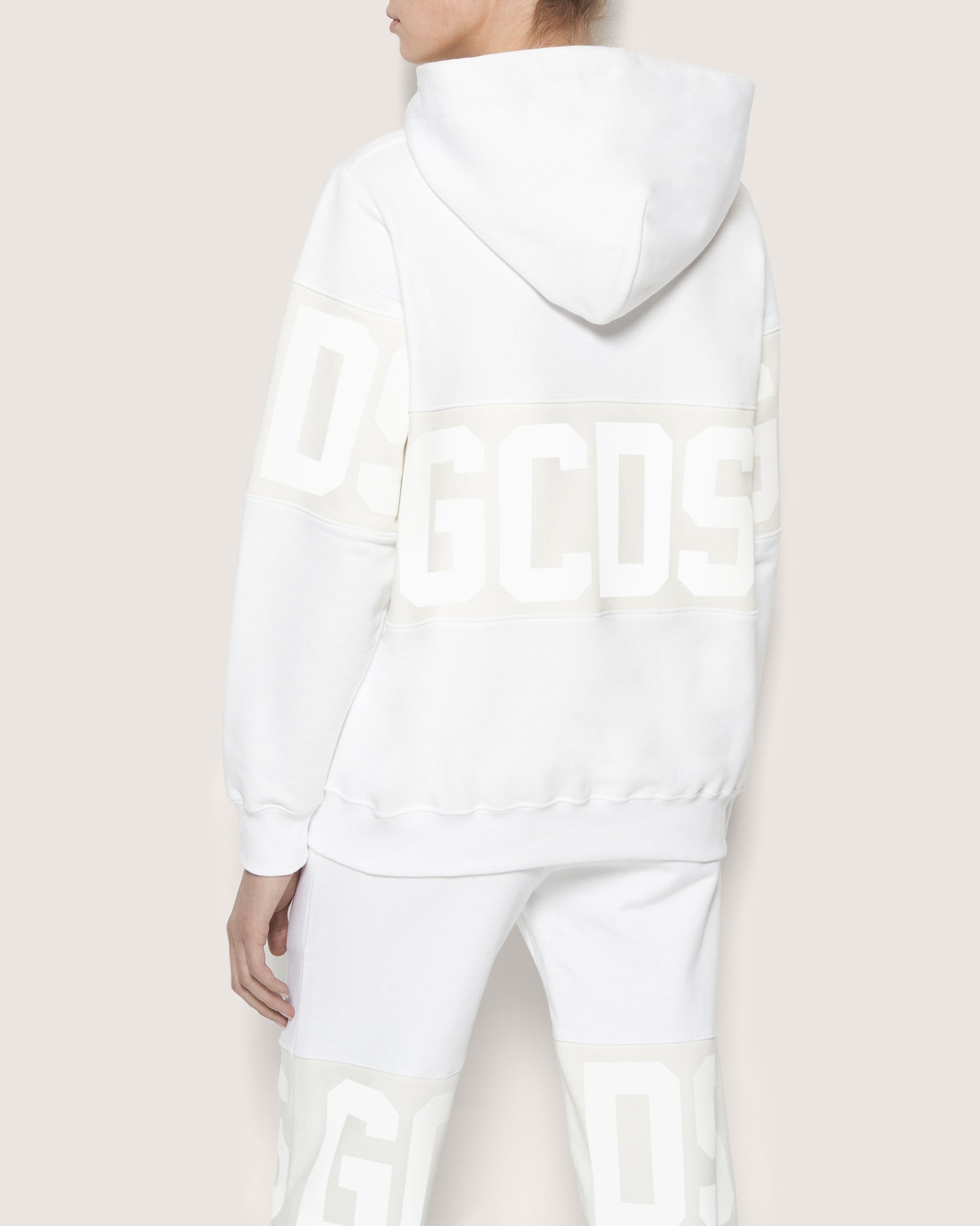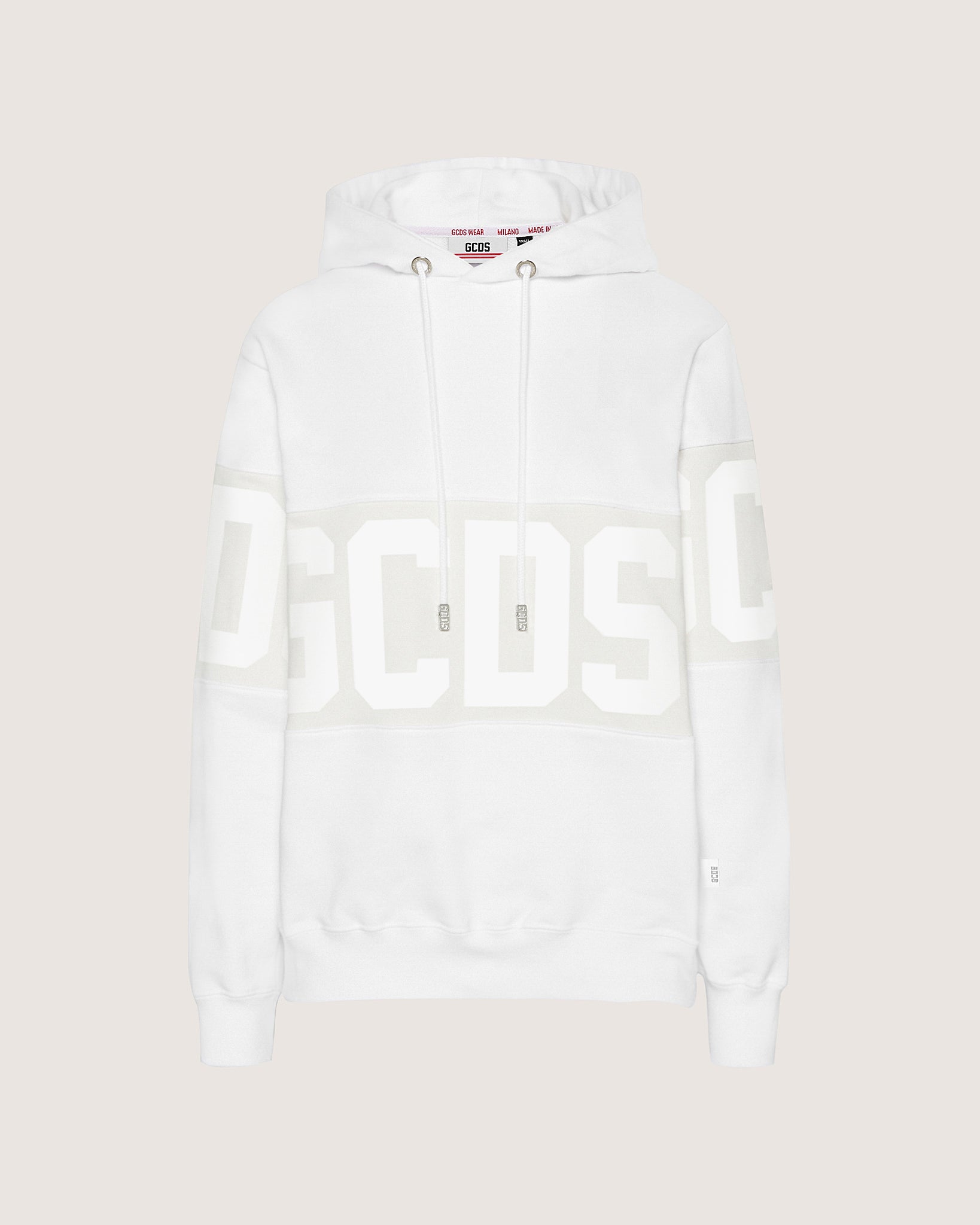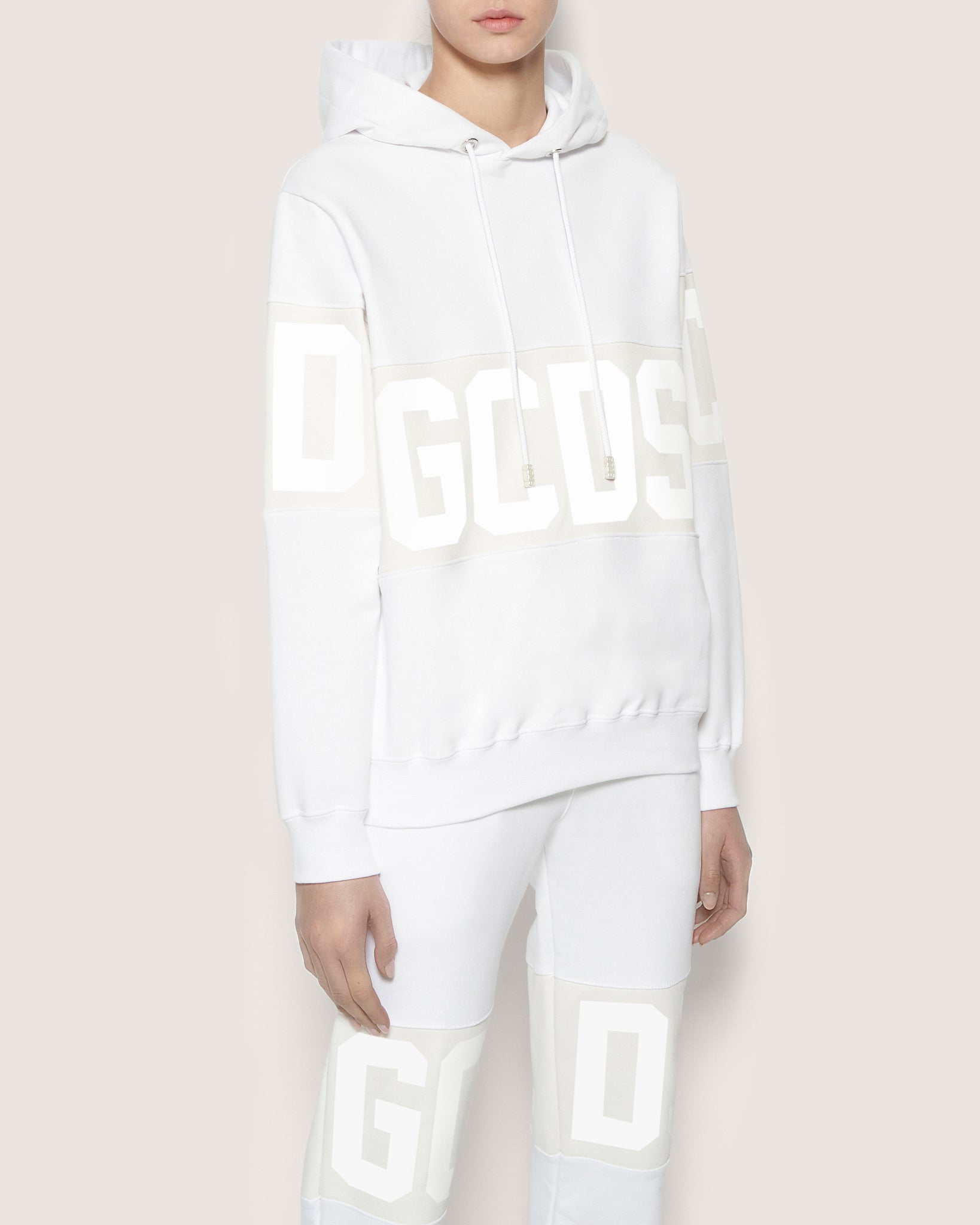 Long sleeves GCDS sweatshirt, adjustable hood with drawstring and cord aglet. Tone-on-tone inlaid logo band, silk-screen print, on front and back and sleeves. Regular fit.