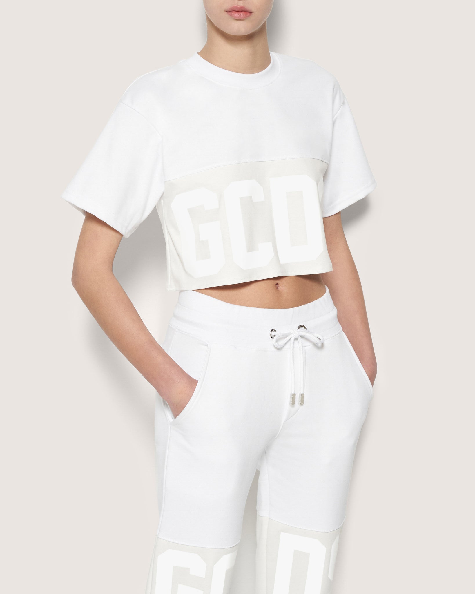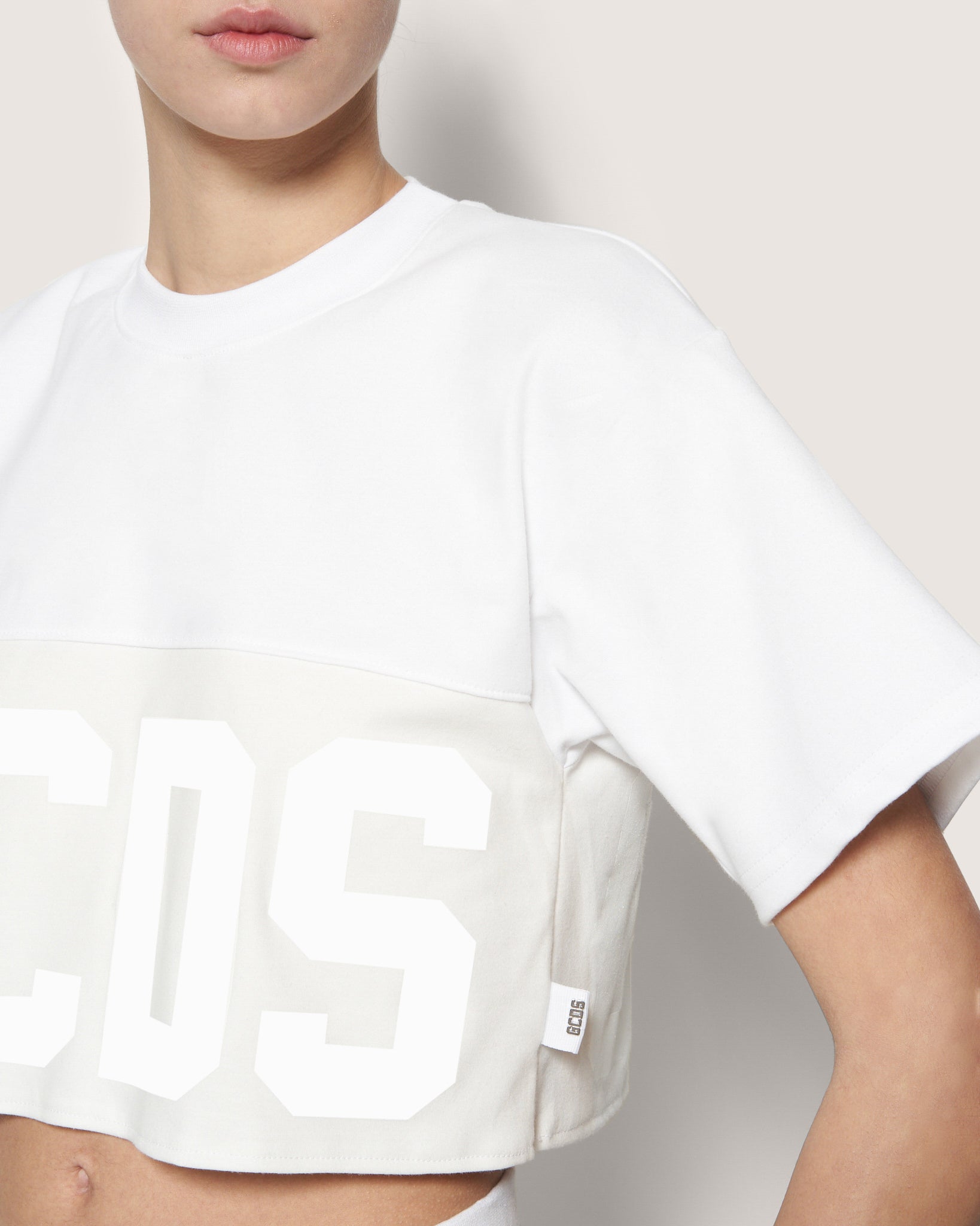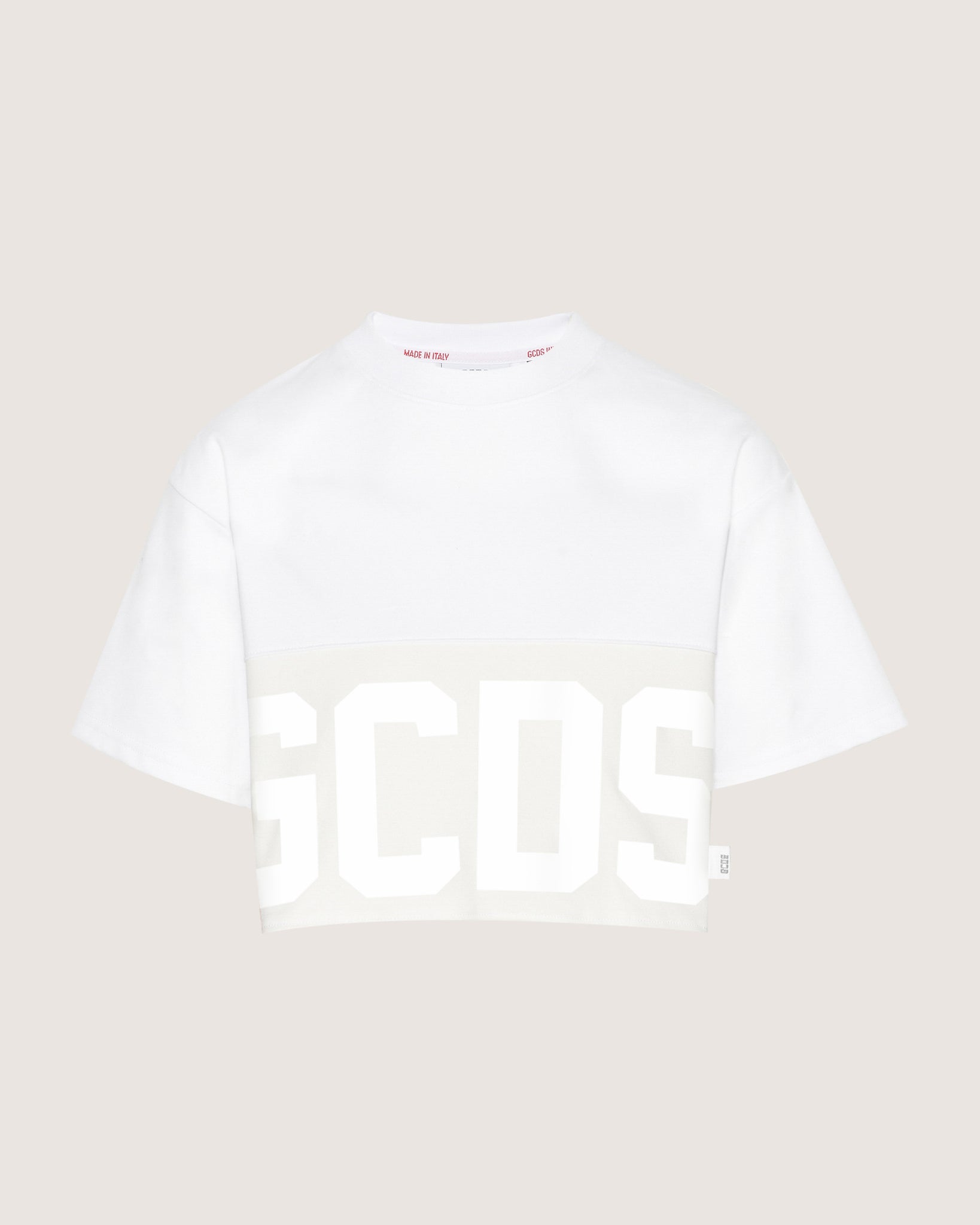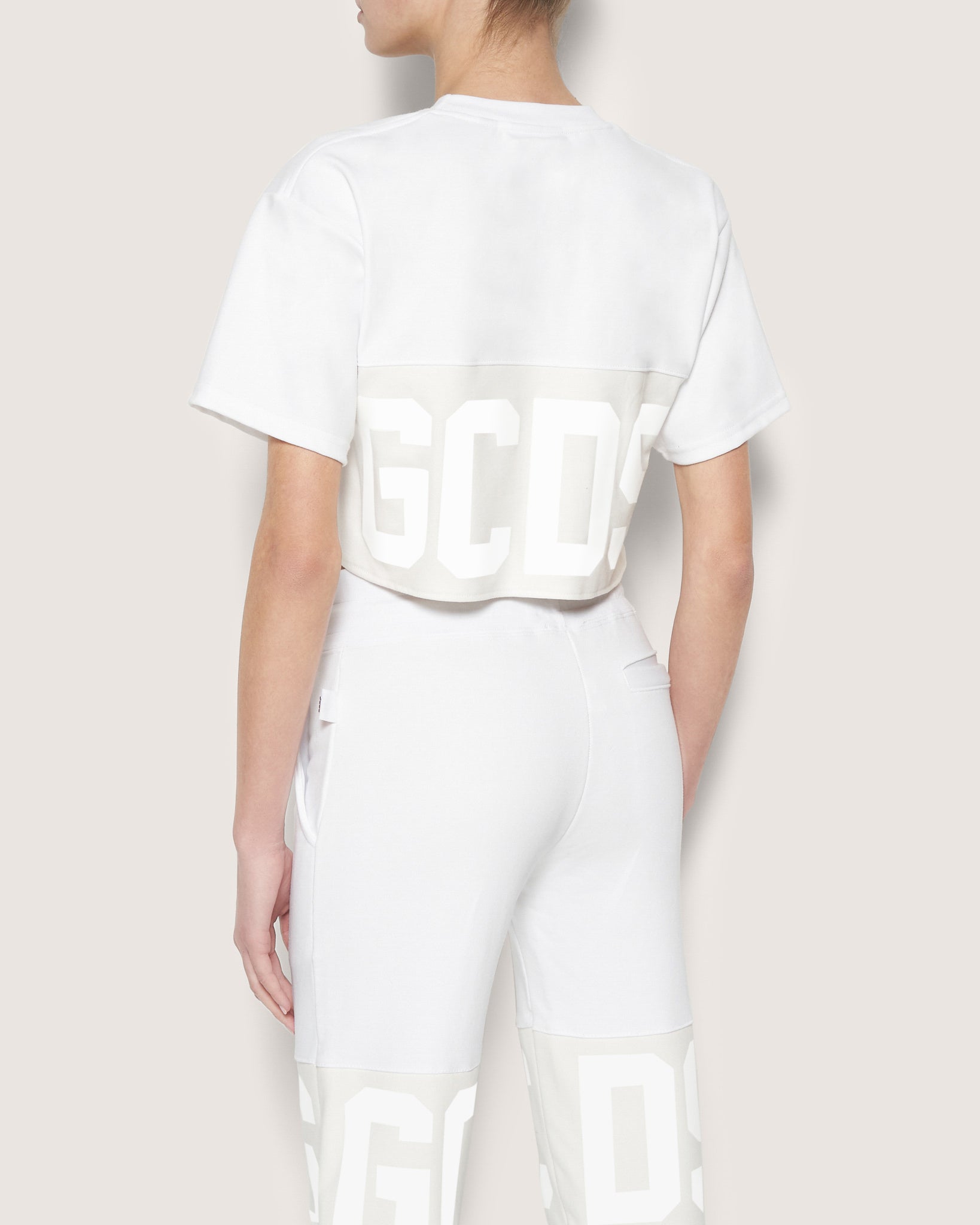 Cotton crop GCDS T-shirt with tone-on-tone inlaid logo band on front and back. Wide ribbed neckline characteristic of GCDS garments. Regular fit.