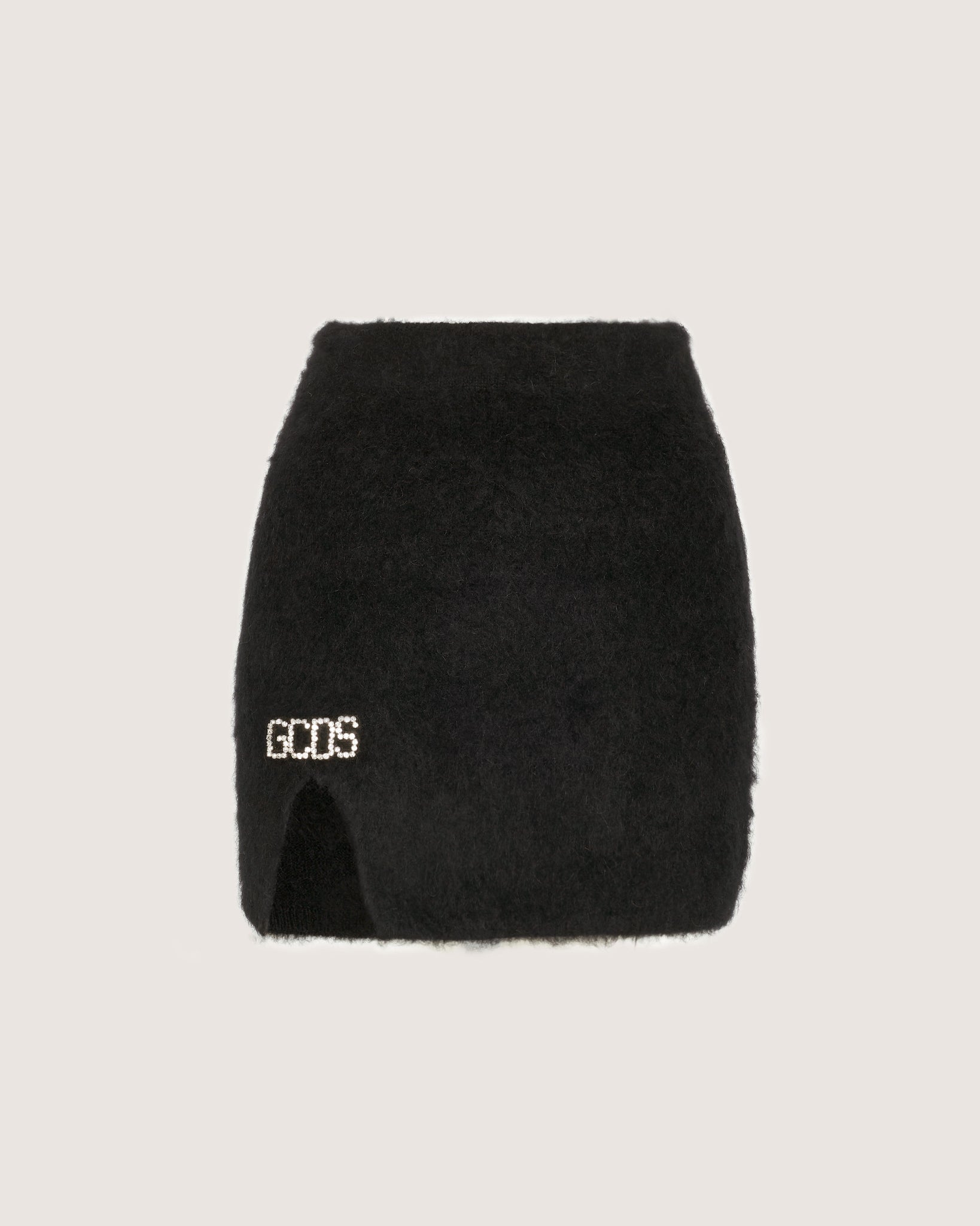 High-waisted GCDS mohair mini skirt. Above the slit, logo patch in Preciosa crystals. Available in collection colors.