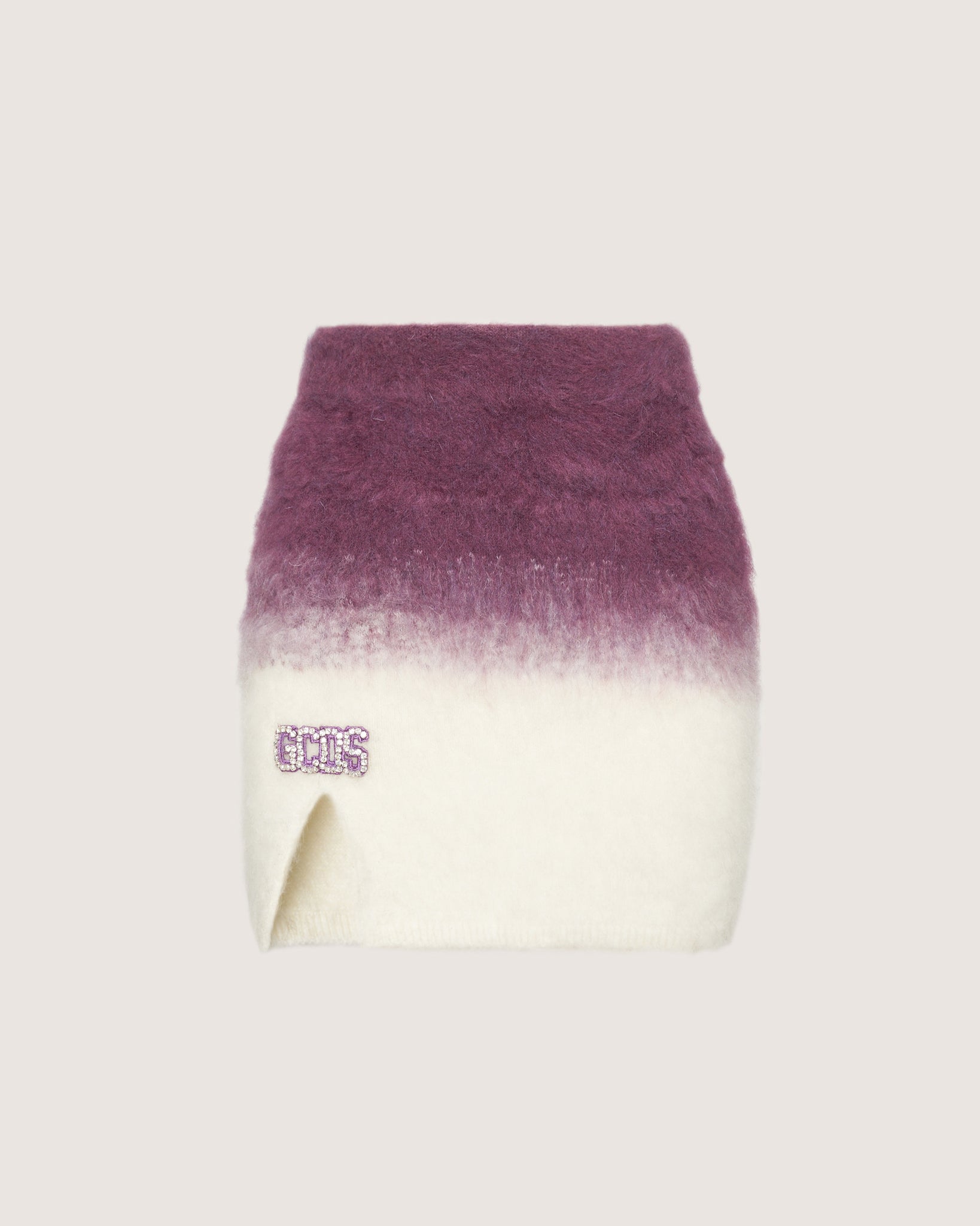 High-waisted mohair GCDS degradé mini skirt. Above the slit, logo patch in Preciosa crystals. Designed in the seasonal colors of the Alcantara collection.
