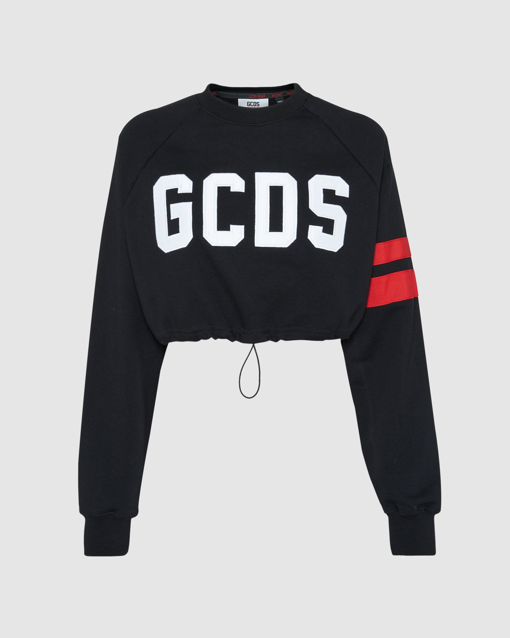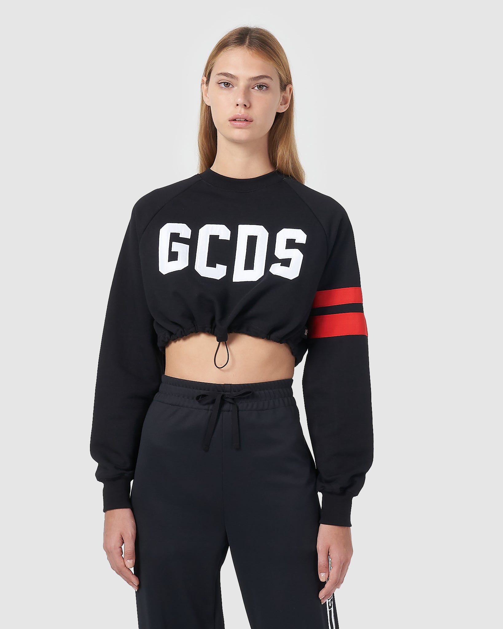 GCDS long-sleeved cropped raglan cut crew neck with adjustable cord tie at the bottom. Contrasting satin logo appliquéd with cording on the center front. Double grosgrain band on the left sleeve.