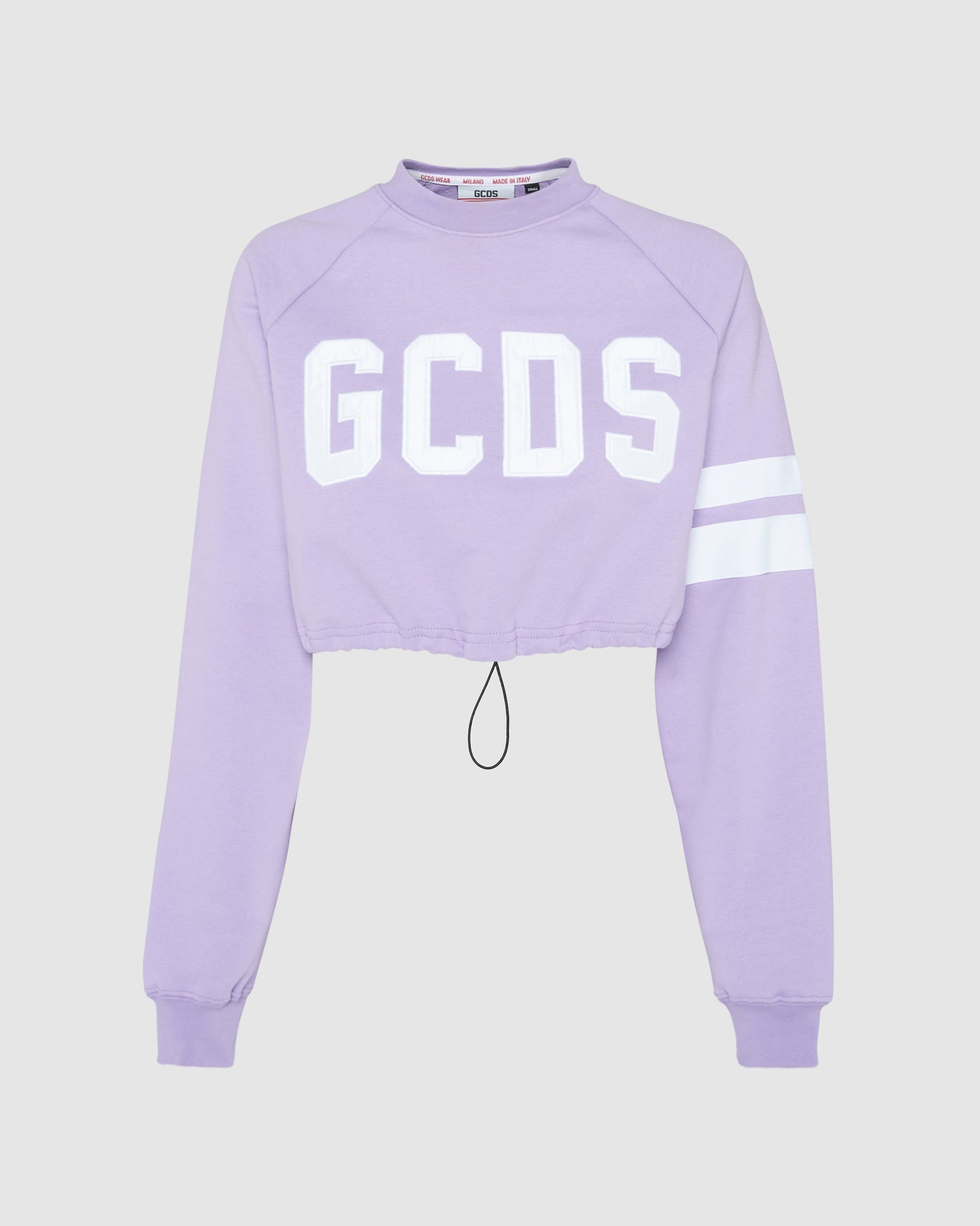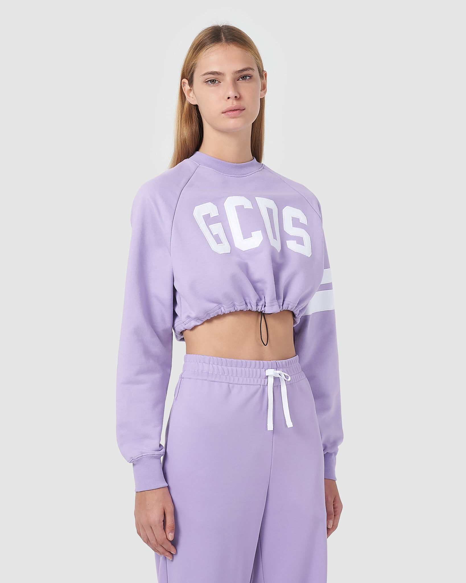 GCDS long-sleeved cropped raglan cut crew neck with adjustable cord tie at the bottom. Contrasting satin logo appliquéd with cording on the center front. Double grosgrain band on the left sleeve.