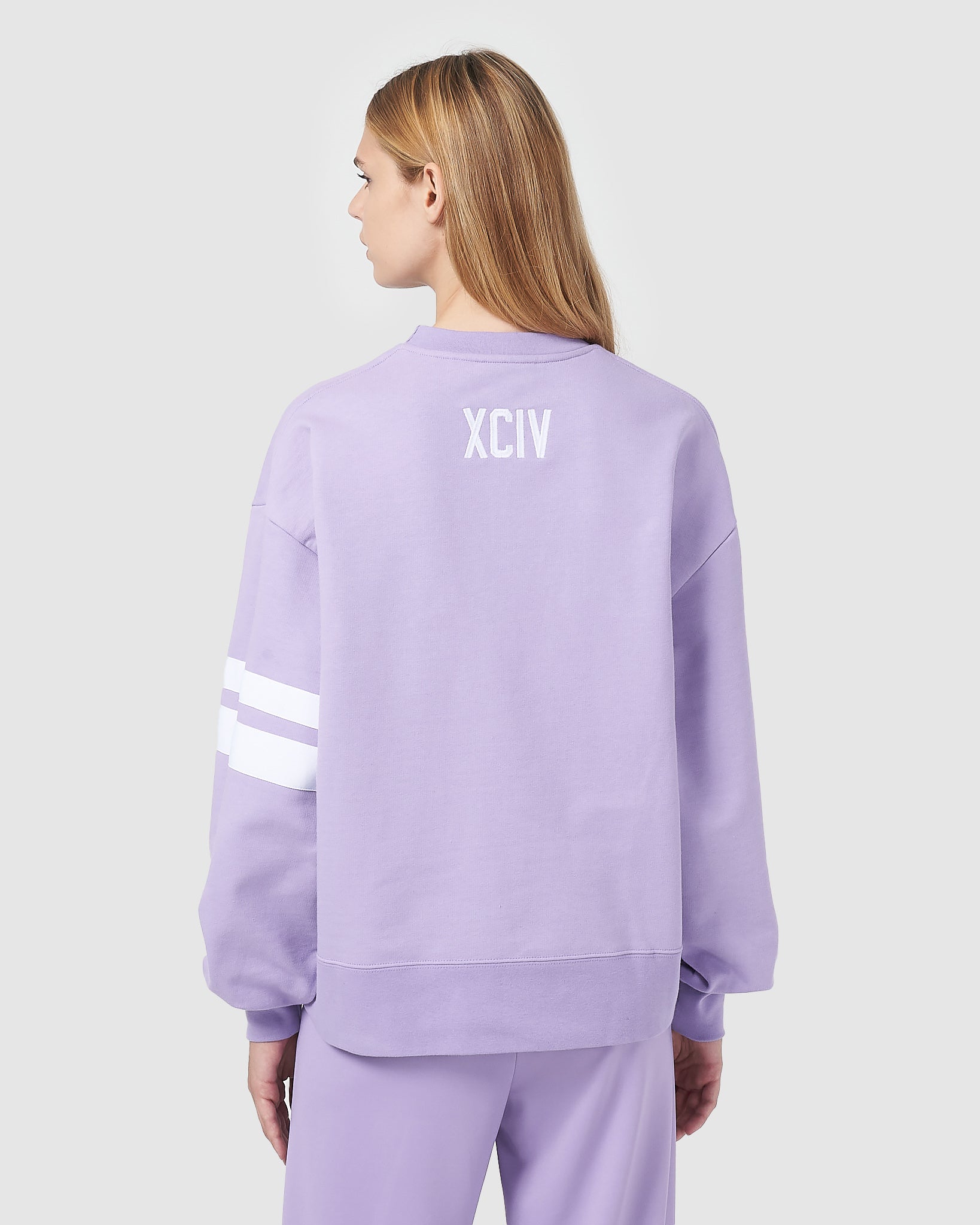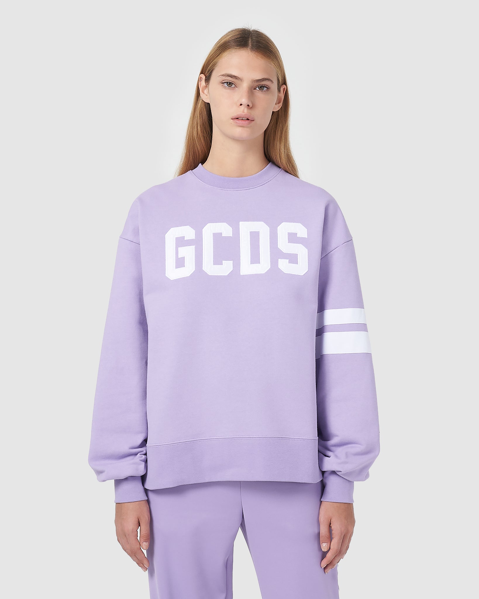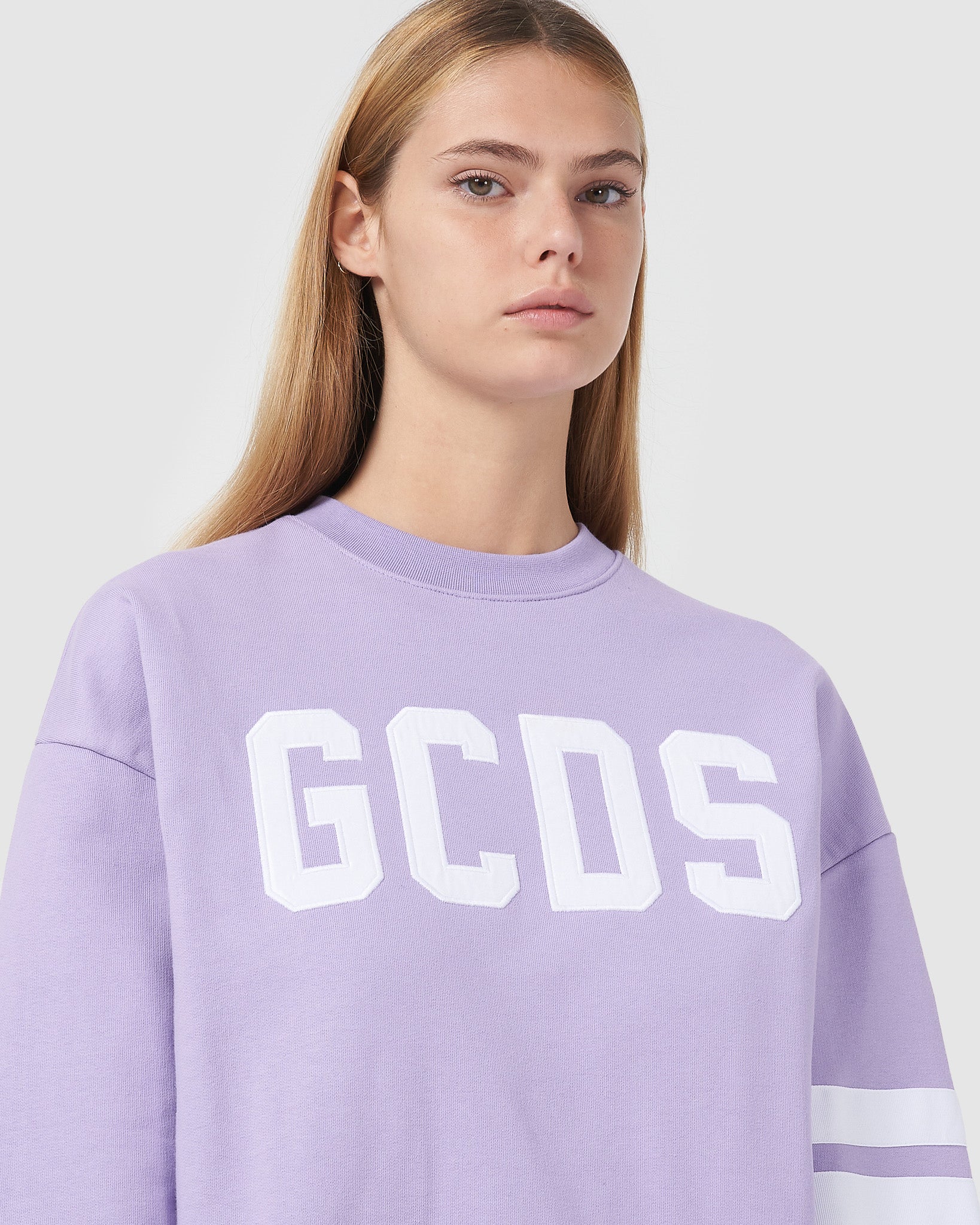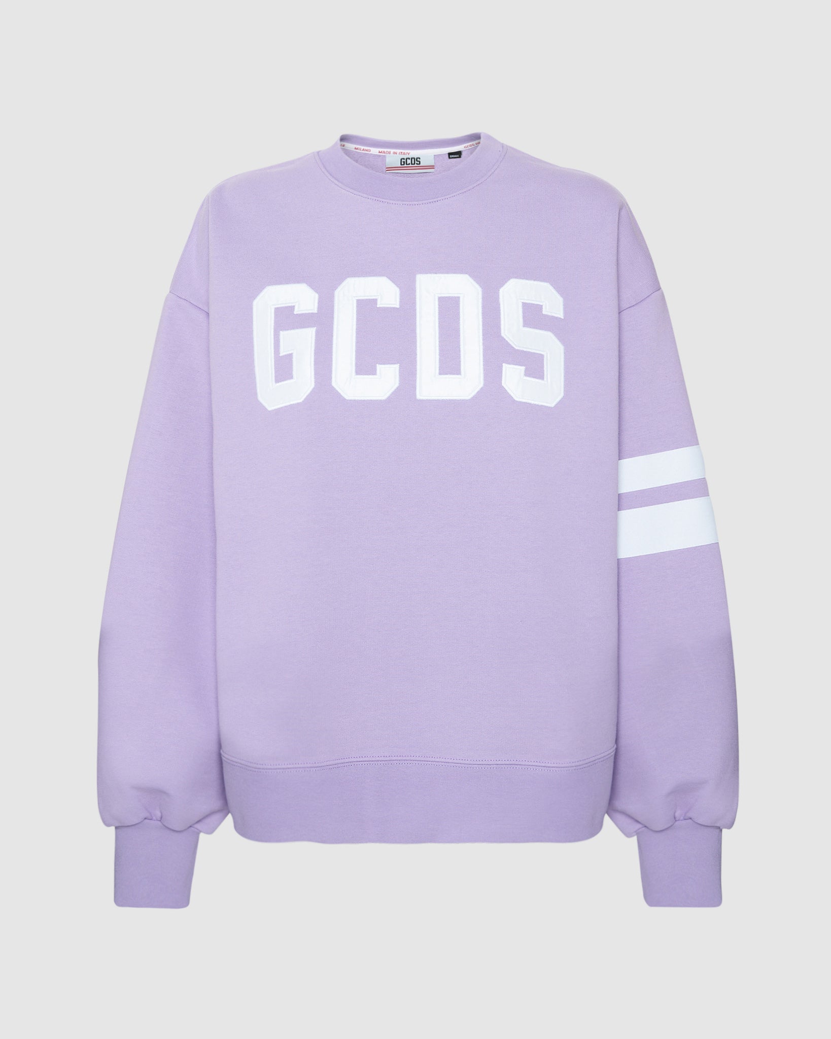 GCDS long-sleeved sweatshirt with contrasting satin logo appliquéd with cording on the center front. Double grosgrain band on the left sleeve. Over-sized.