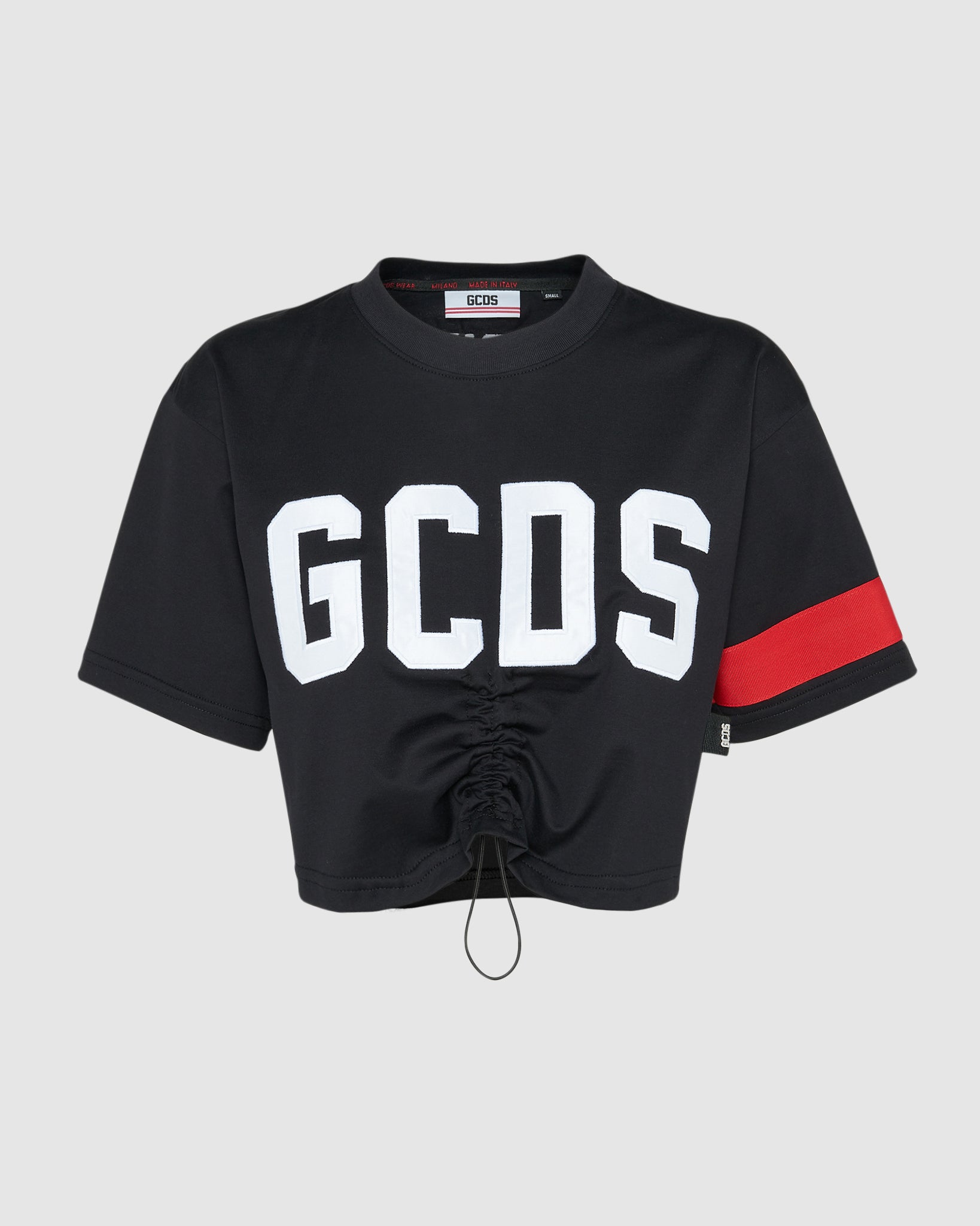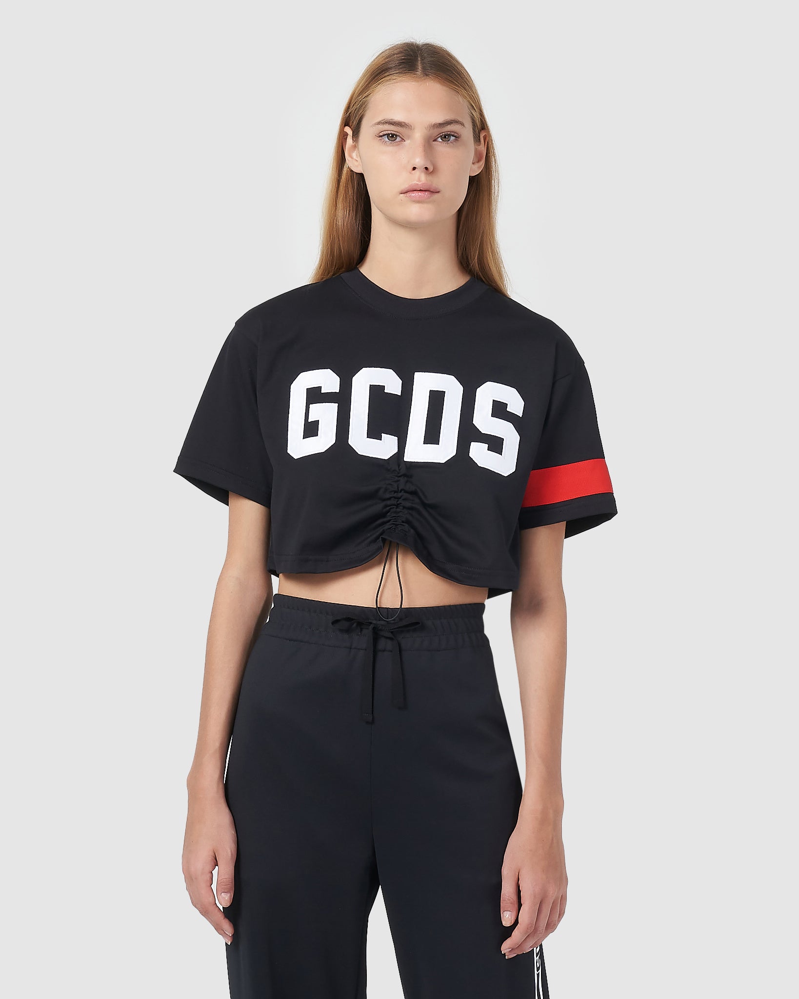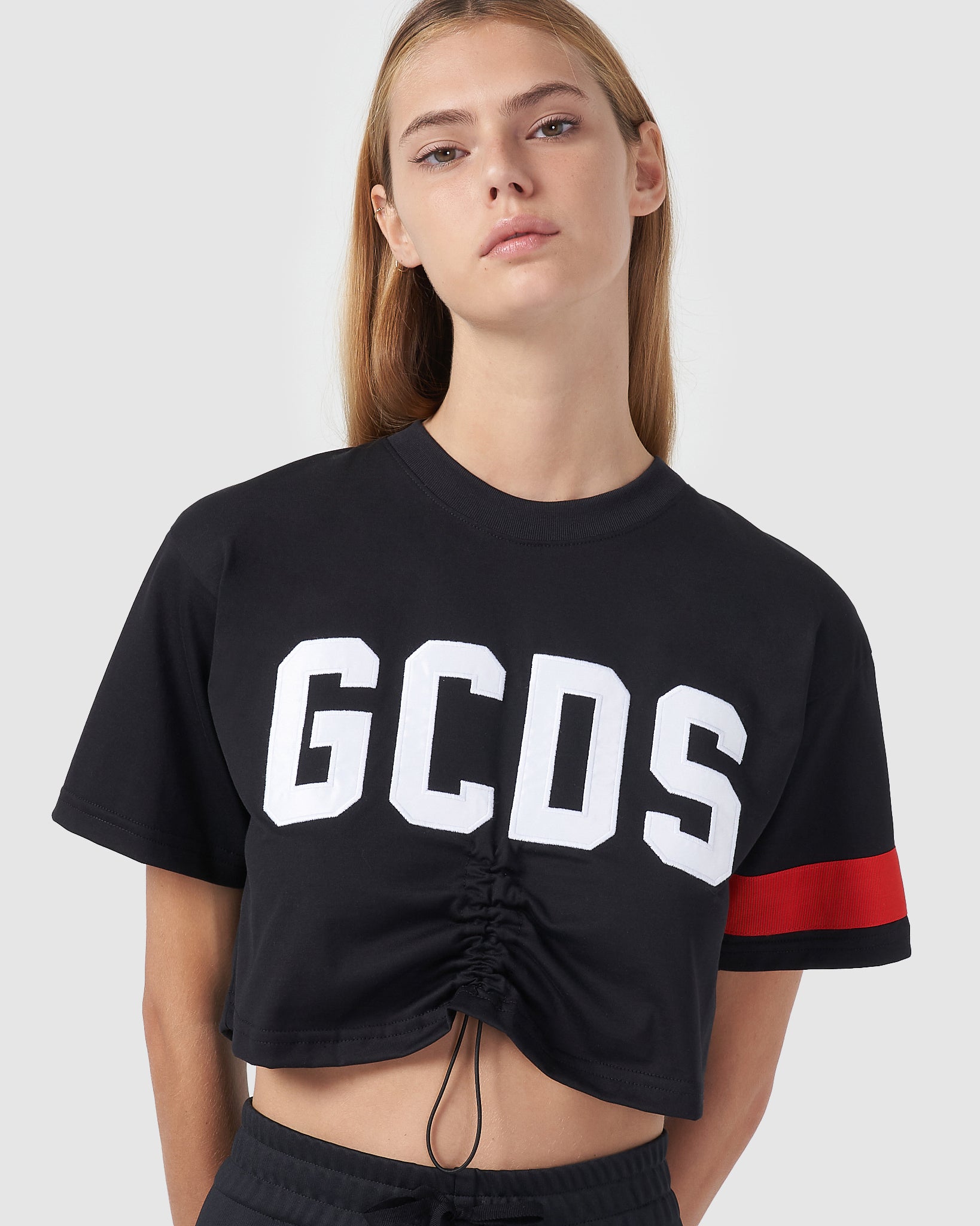 GCDS cropped cotton T-shirt with contrasting satin logo appliquéd with cording on the center front. Adjustable cord tie. Contrasting grosgrain band appliquéd on the left sleeve.