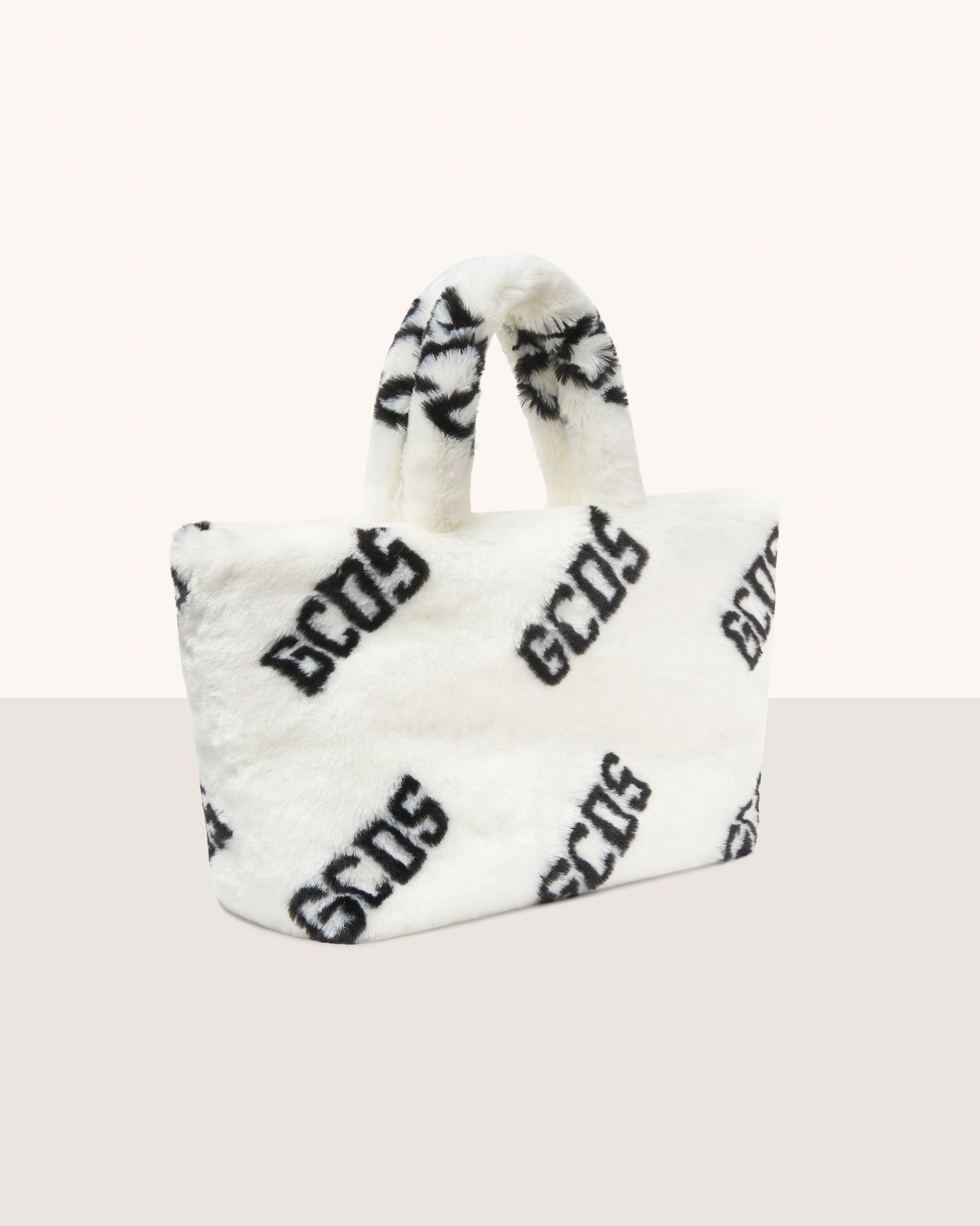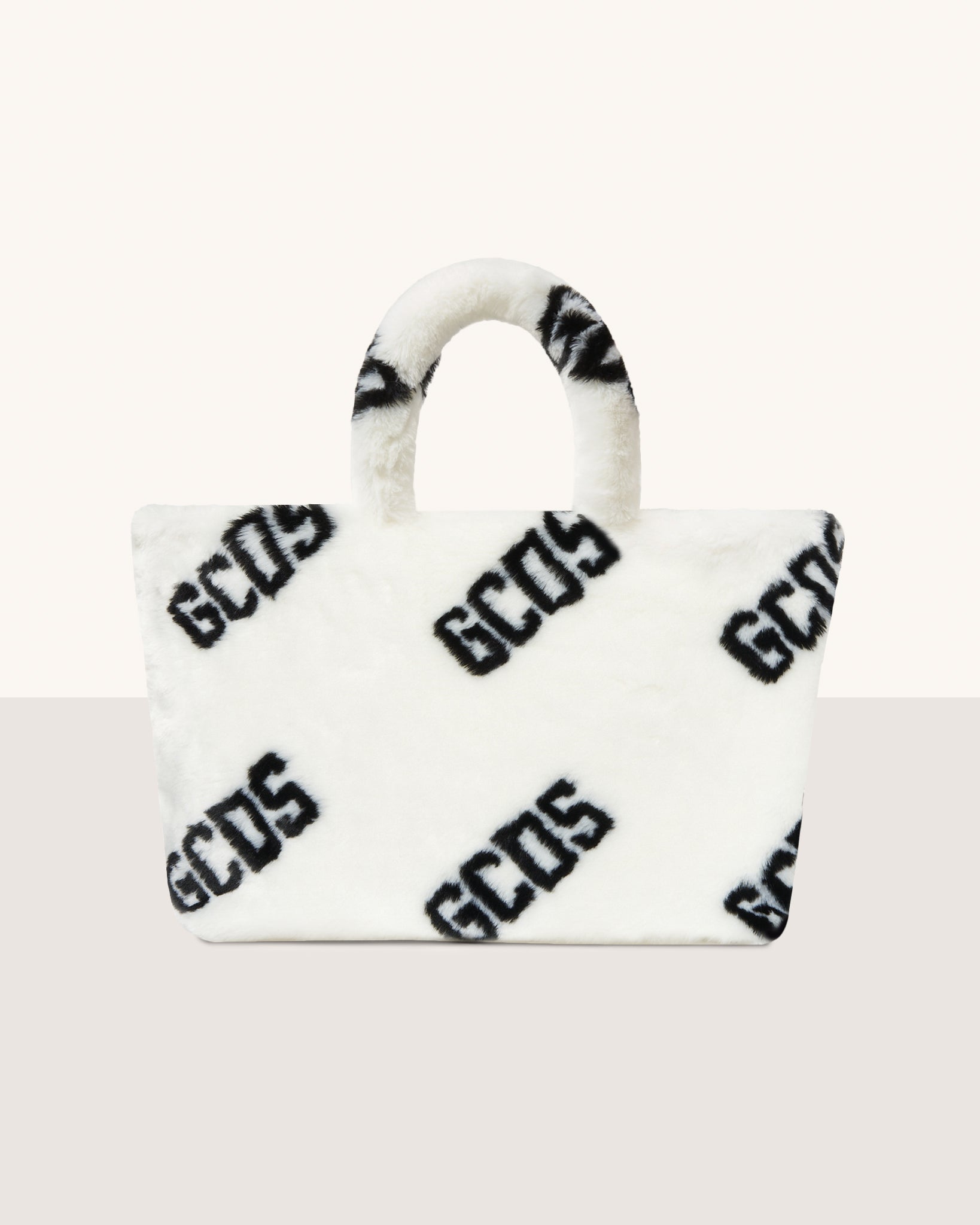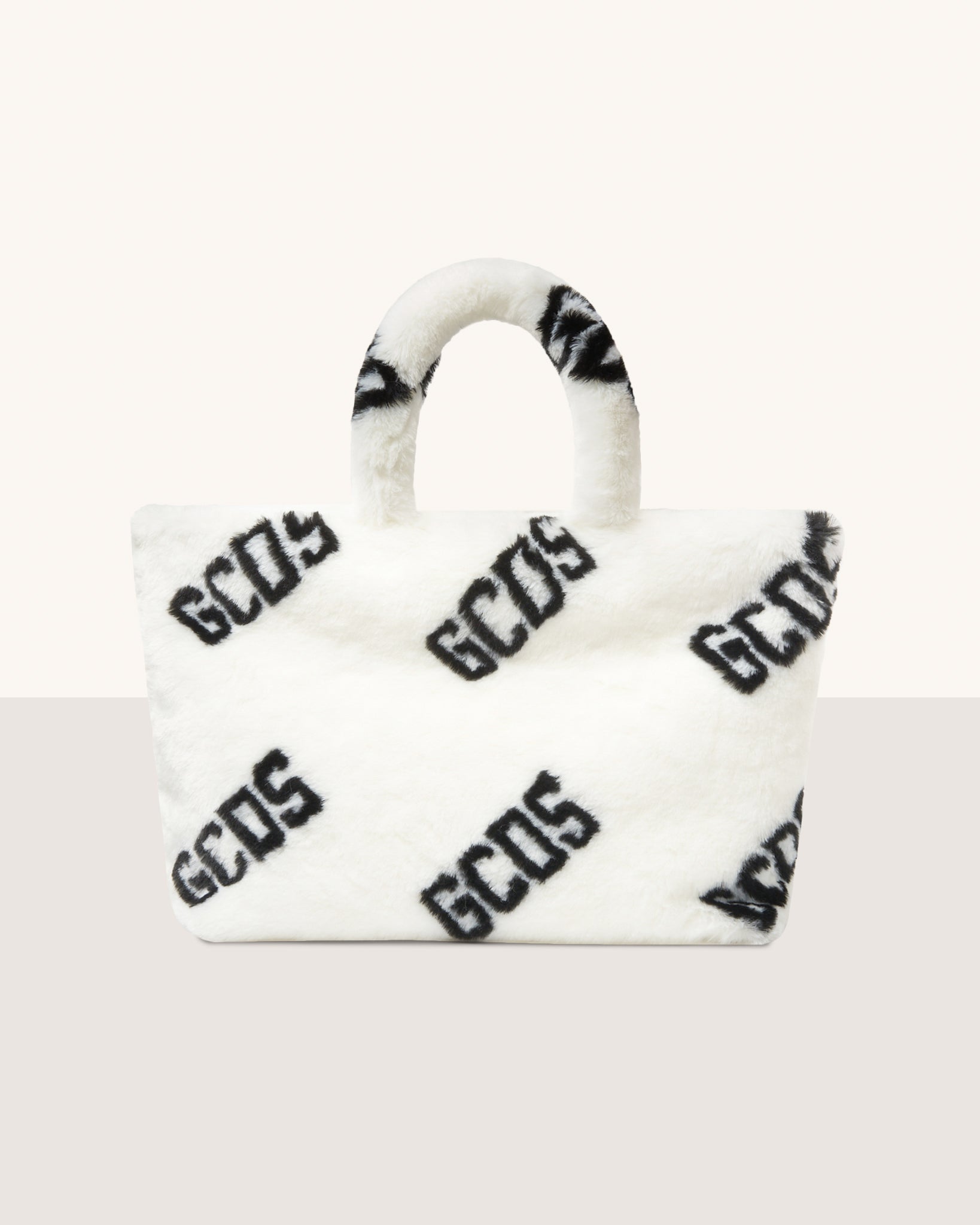 Faux fur GCDS maxi bag with all-over logo. Semi-rigid bottom. Inside, cotton lining and handy zipped pocket with a zipper pull.