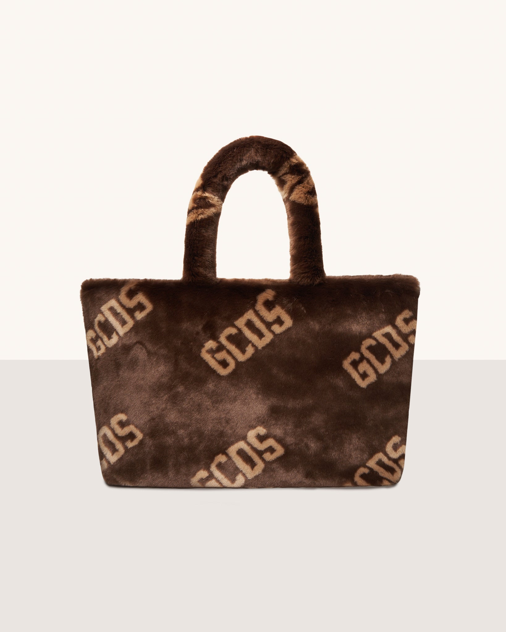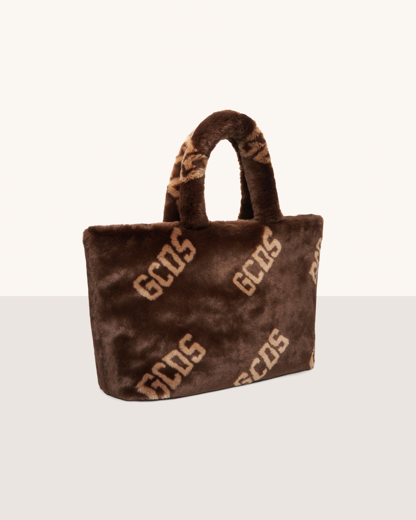 Faux fur GCDS maxi bag with all-over logo. Semi-rigid bottom. Inside, cotton lining and handy zipped pocket with a zipper pull.