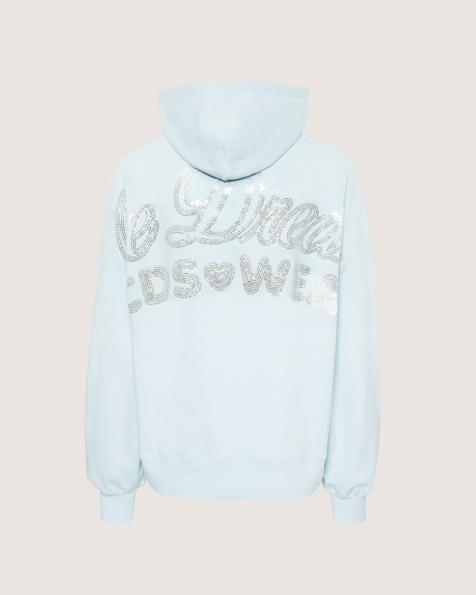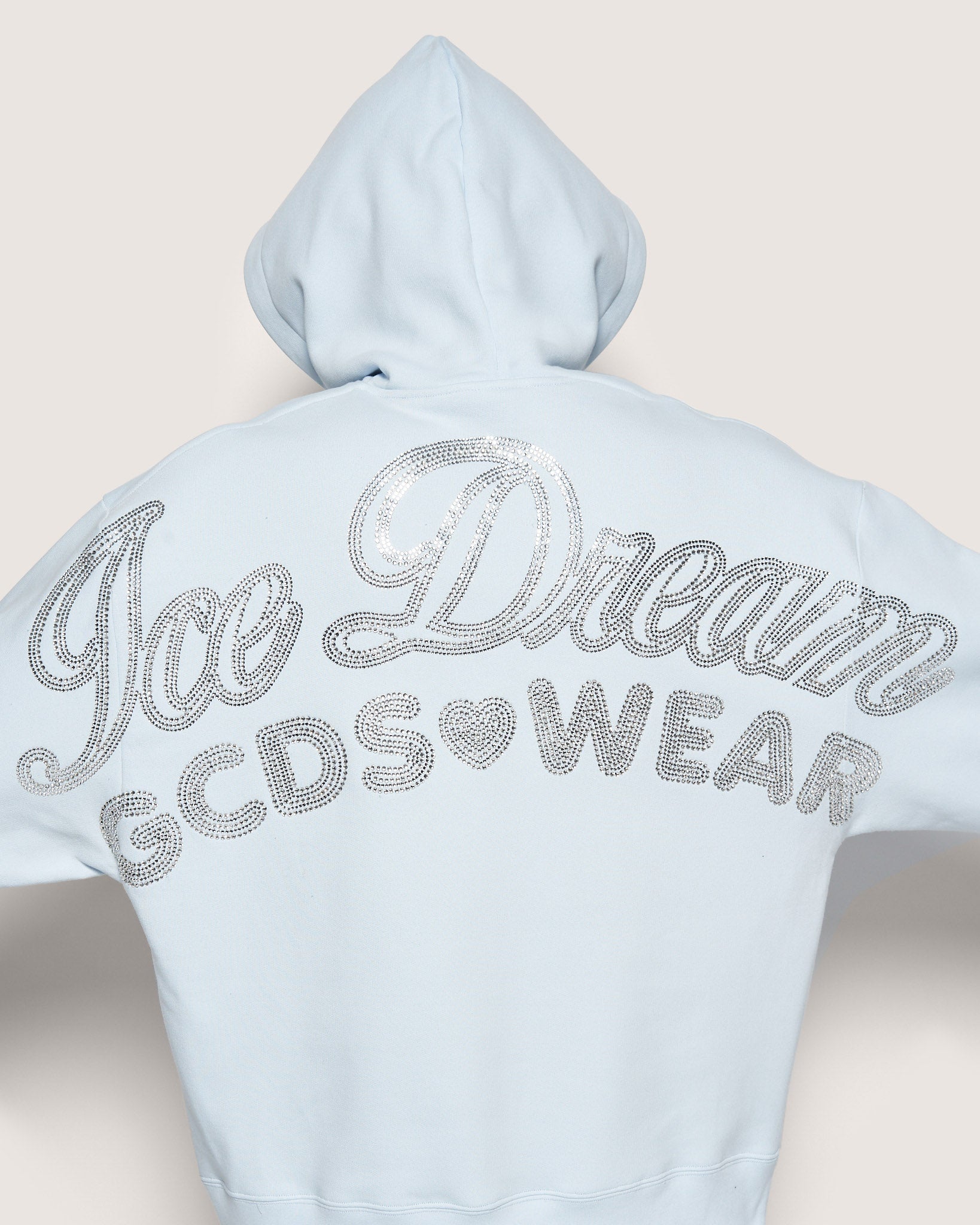 Long sleeves GCDS sweatshirt, adjustable hood with drawstring and cord aglet. Pouch pocket. On the back, Icedream artwork with thermo appliqué rhinestone GCDS Cute logo. Over-sized.