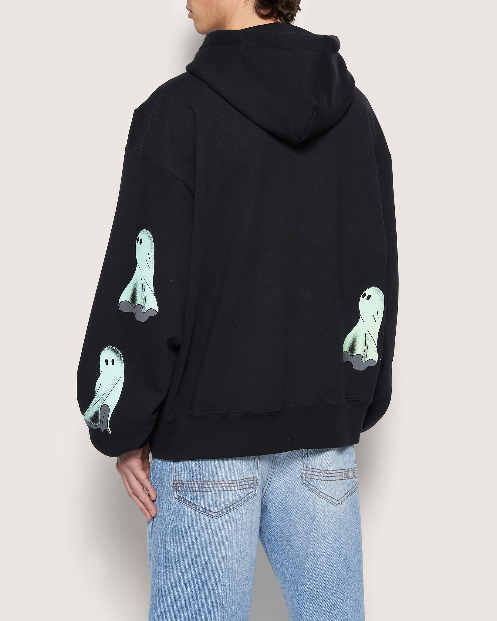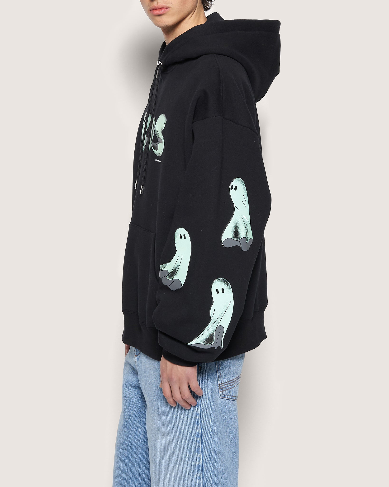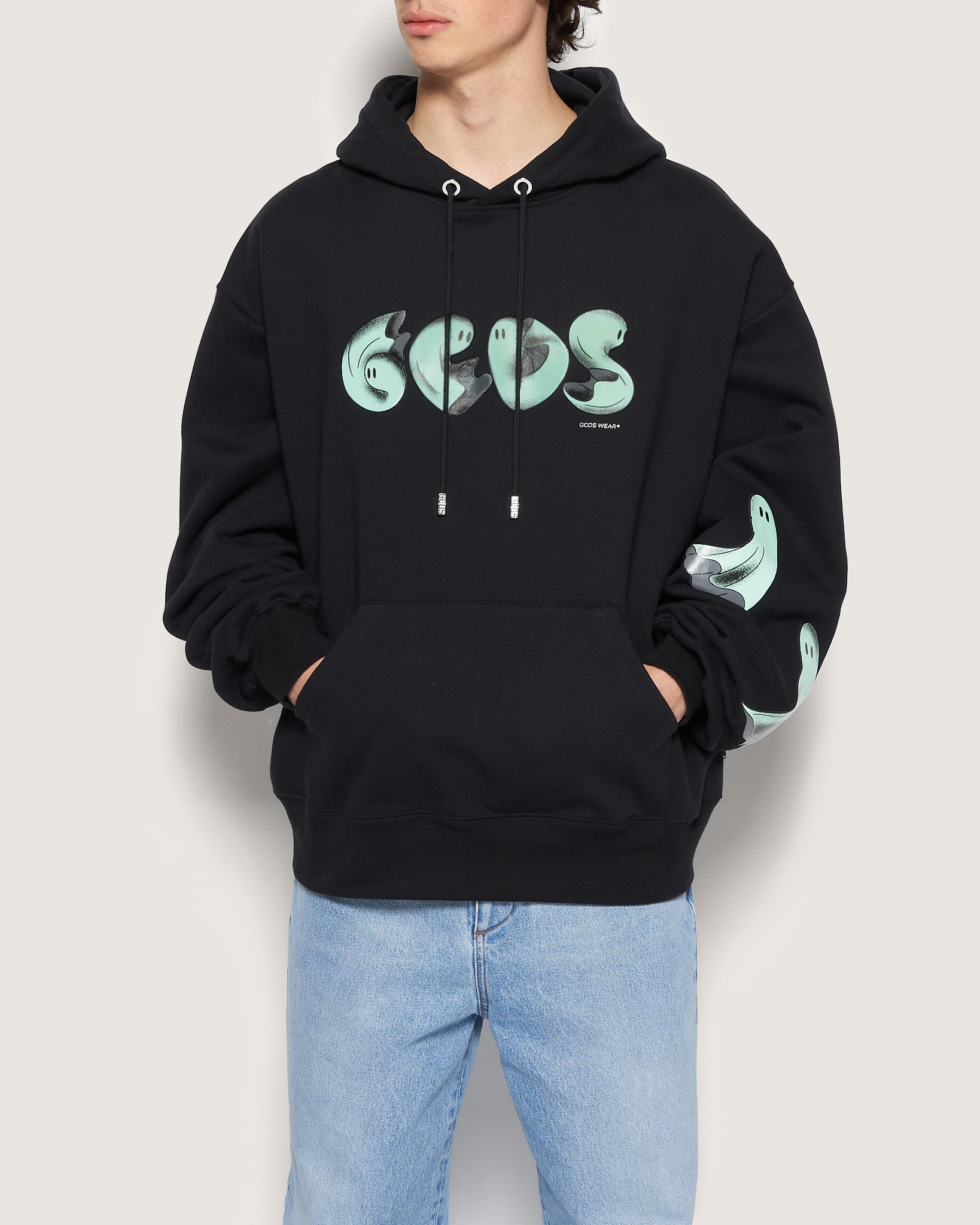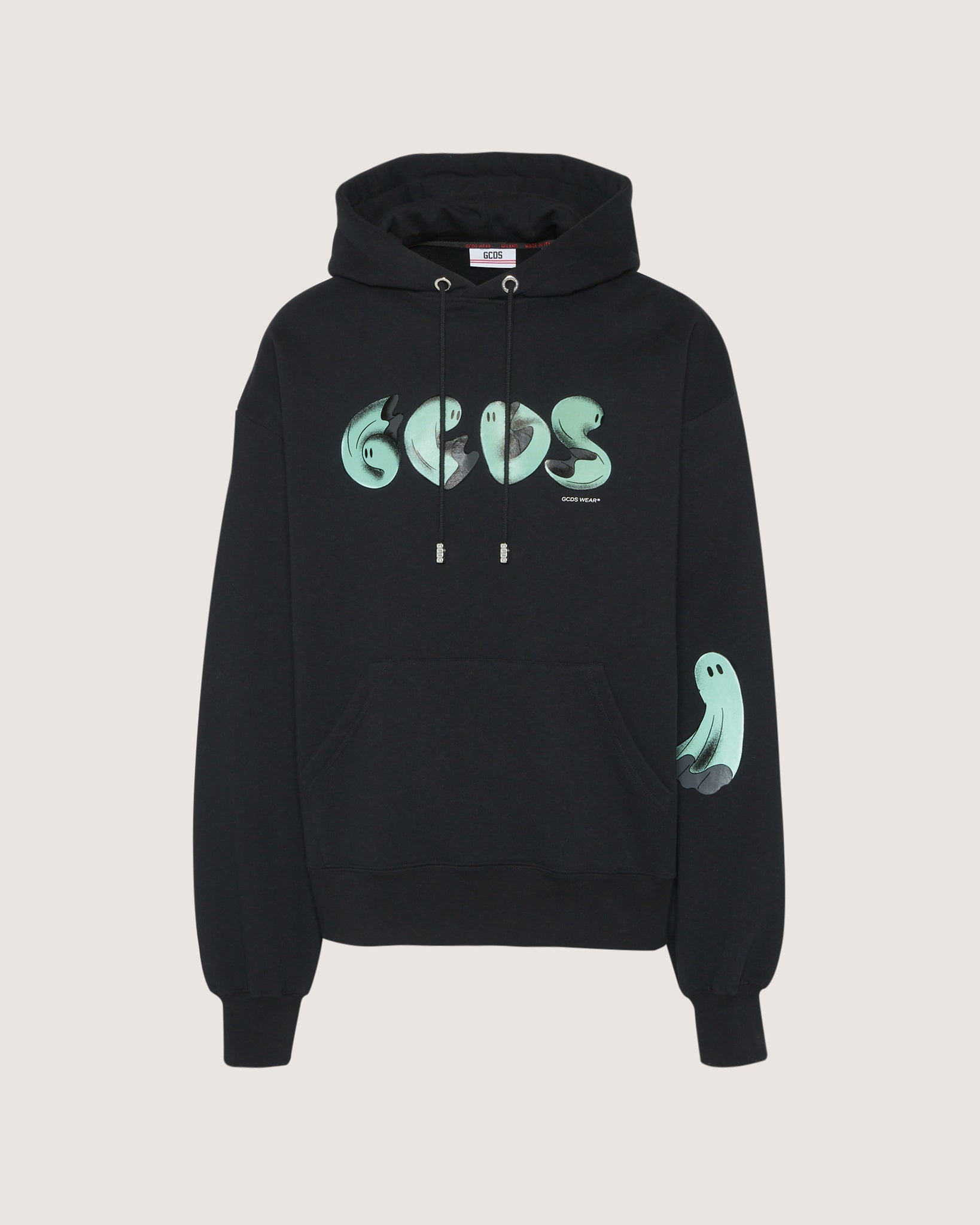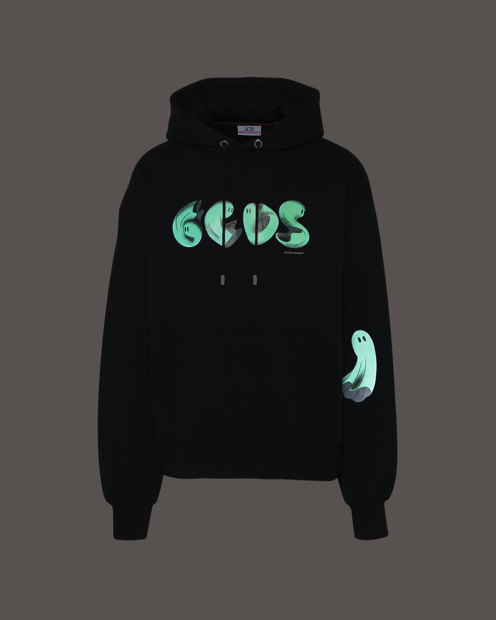 Long sleeves GCDS sweatshirt, adjustable hood with drawstring and cord aglet. Glow-in-the-dark silk-screen printed logo on the front. Pouch pocket. On the back and left sleeve, silk-screen printed artwork. Over-sized.