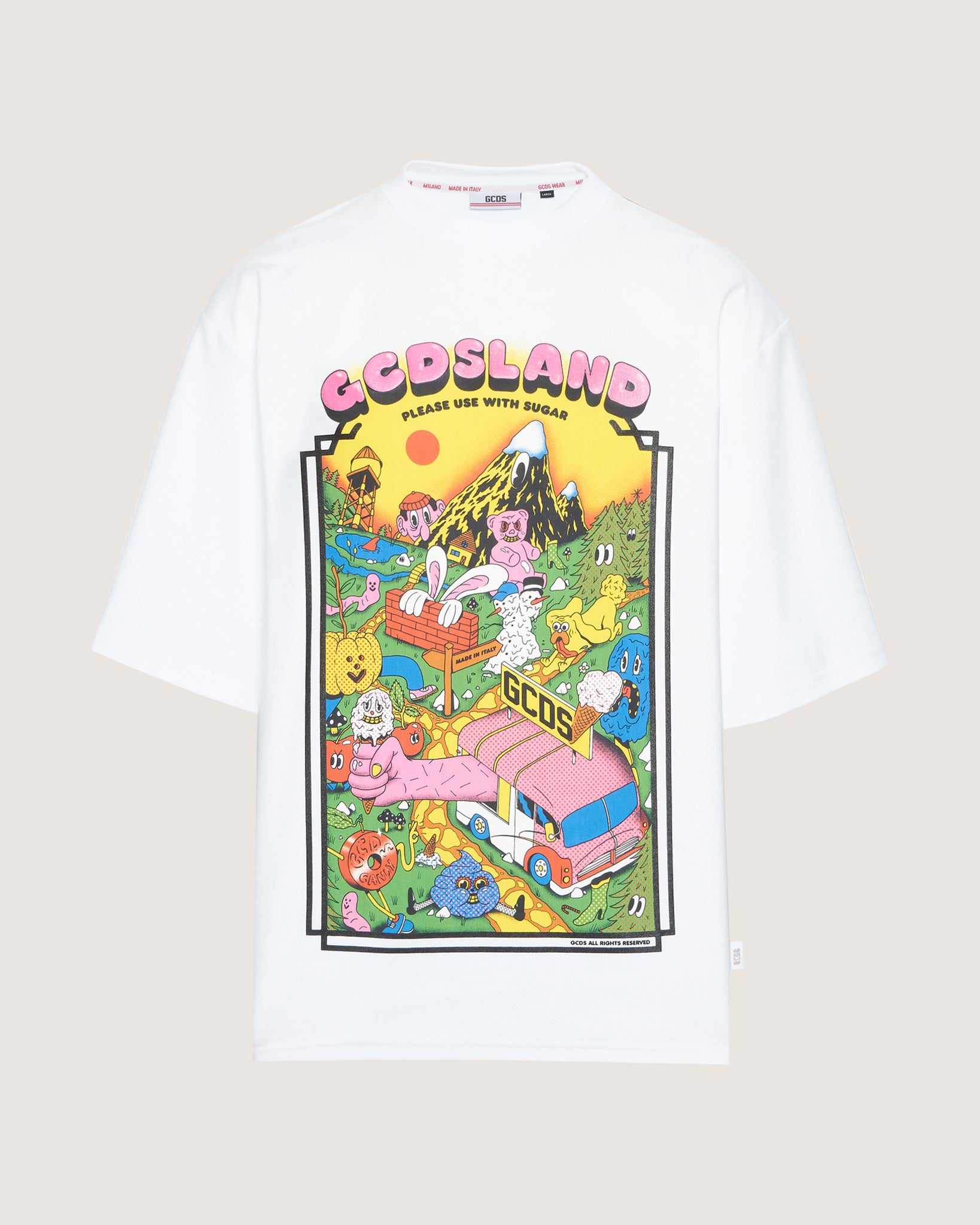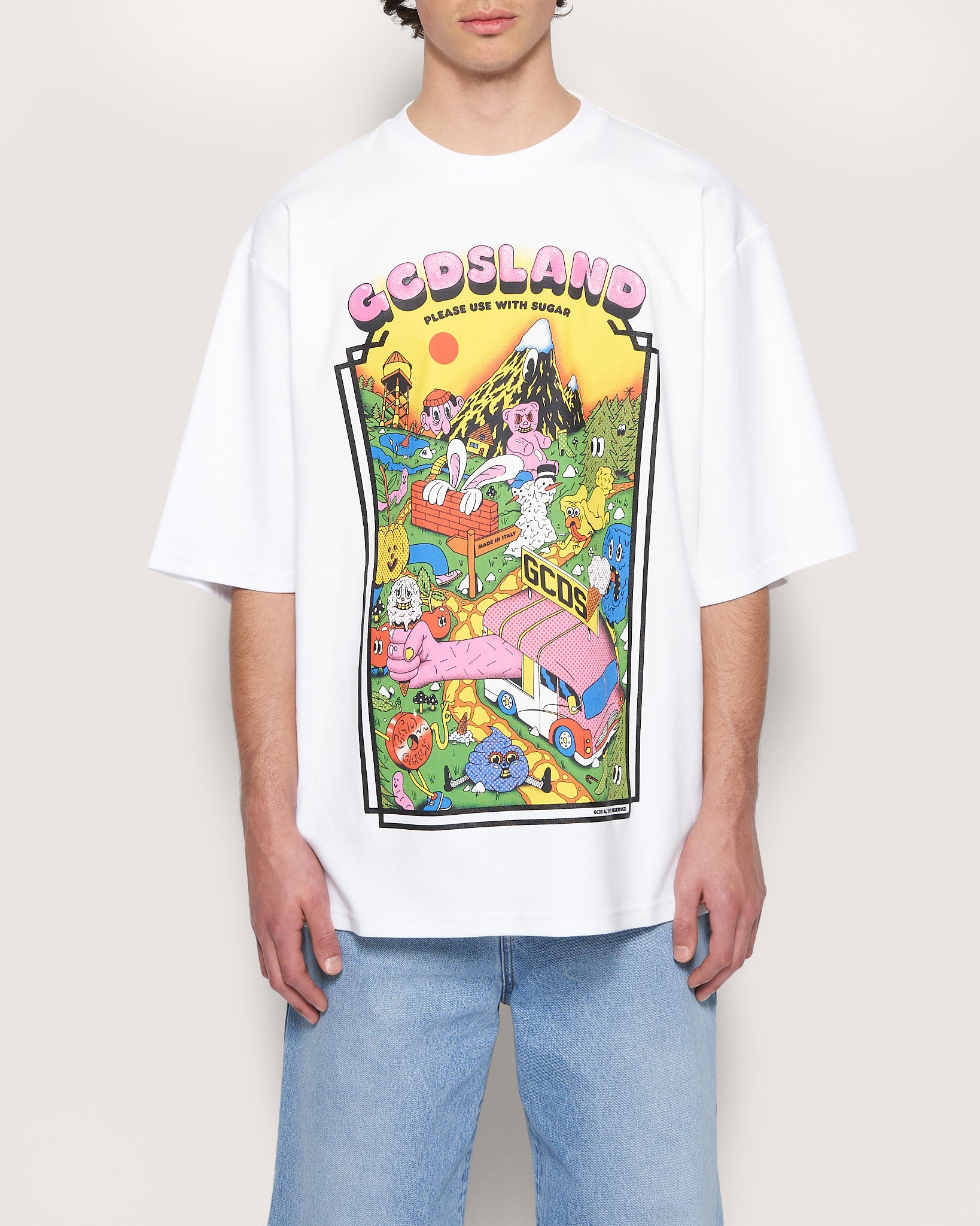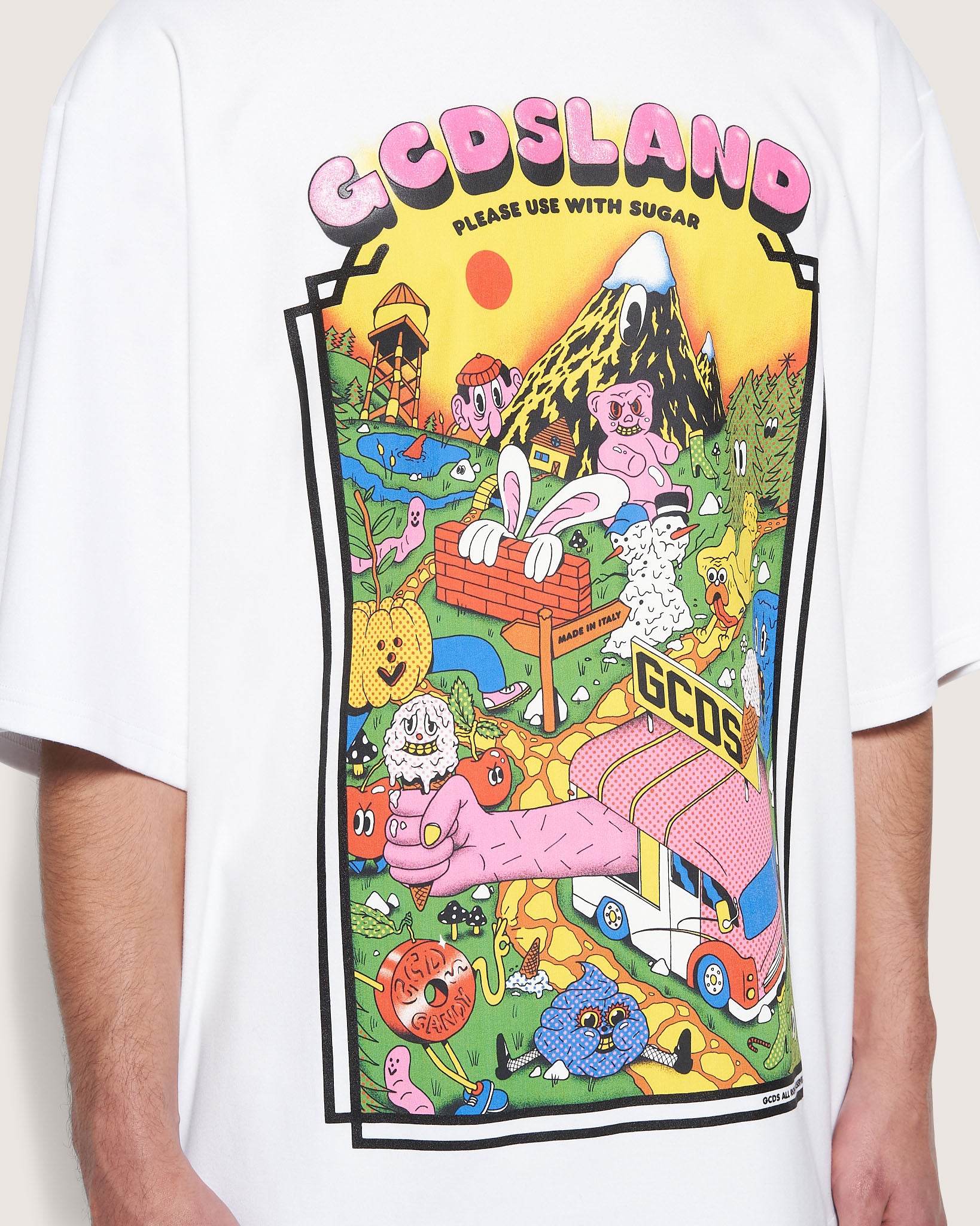 Cotton GCDS T-shirt. On the front, GCDSLAND artwork with puffy silkscreen logo. Over-sized.