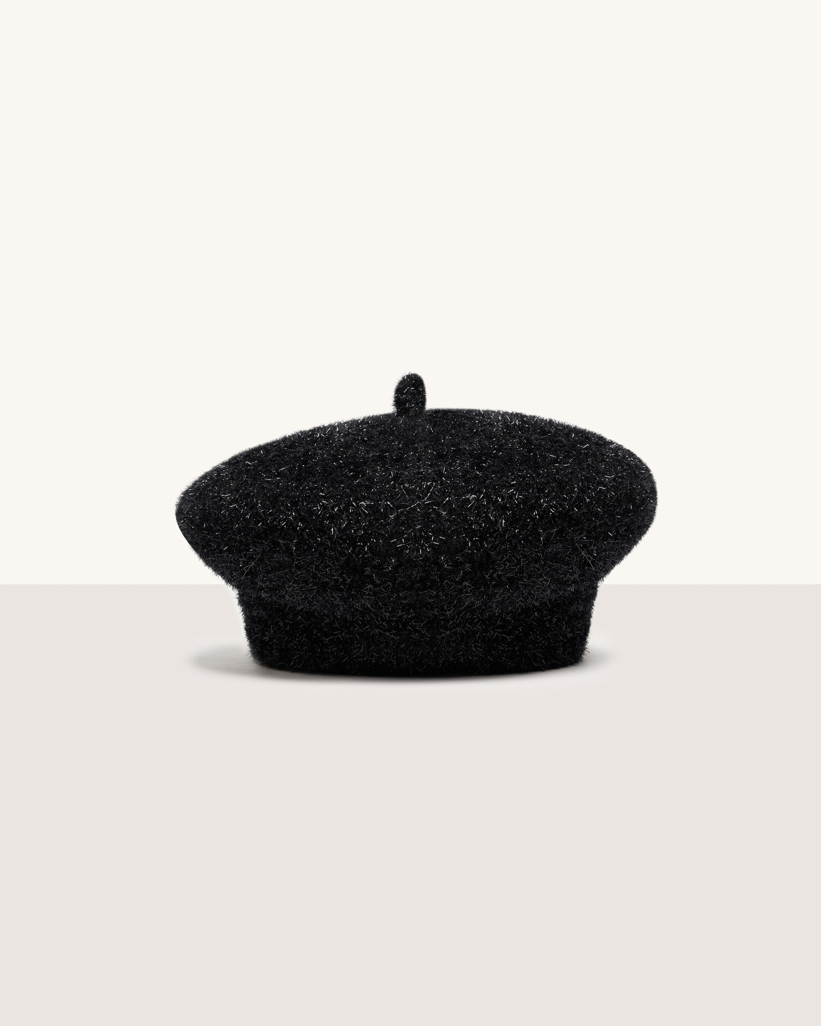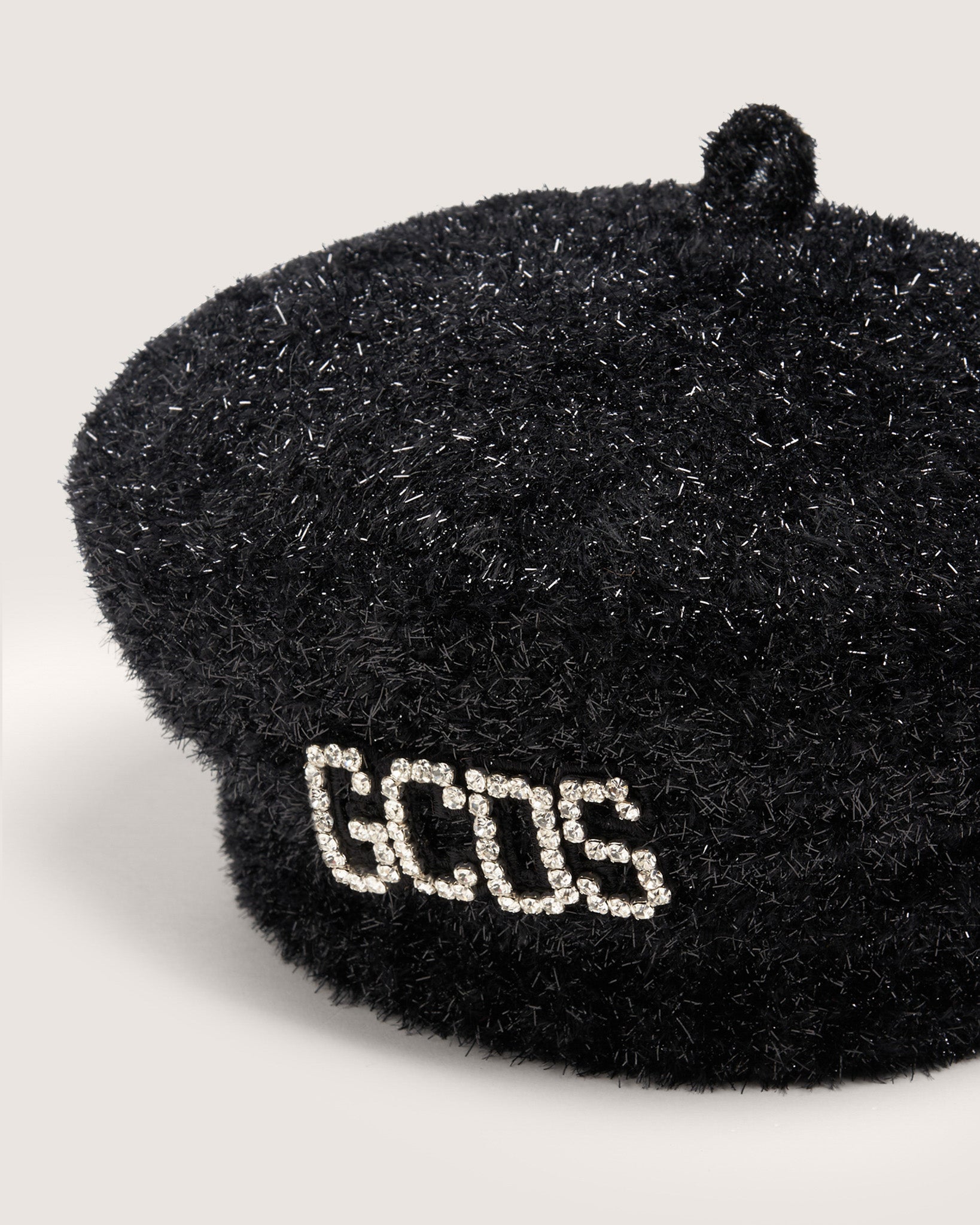 Glittery yarn knitted GCDS French beret with GCDS rhinestone logo patch on the side.