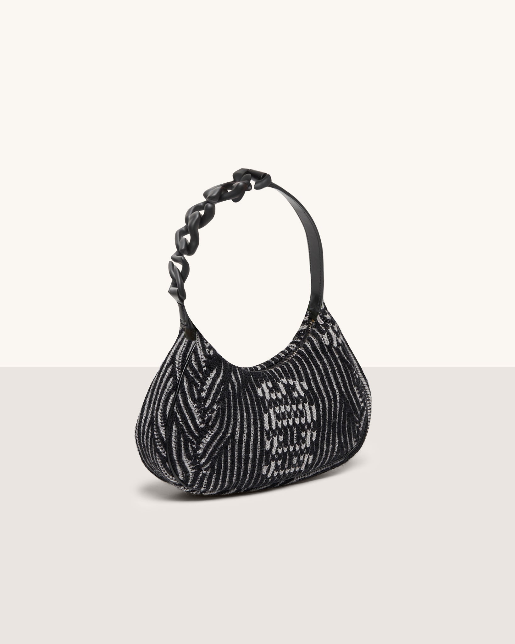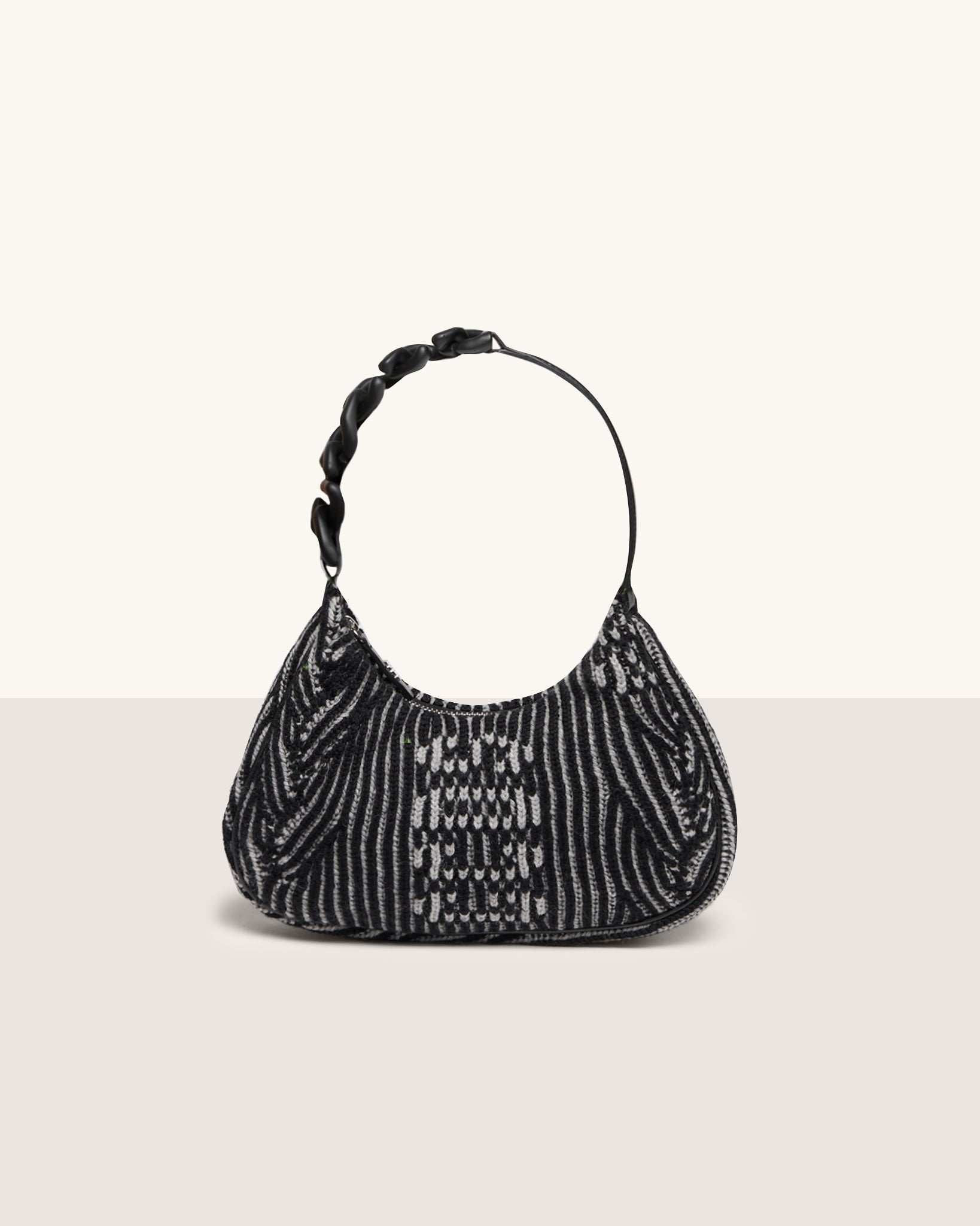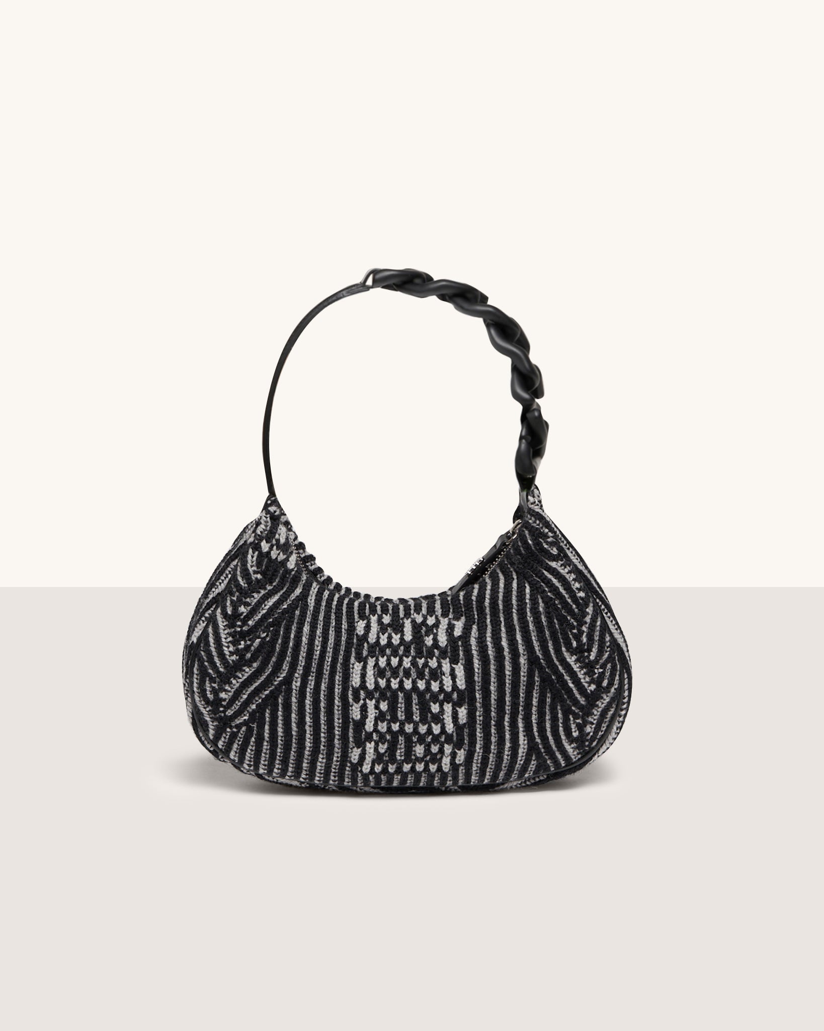 Skip to contentGCDS baguette bag with vanisè braid knitted mezzaluna with logo. ABS maxi logo chain on the handle.