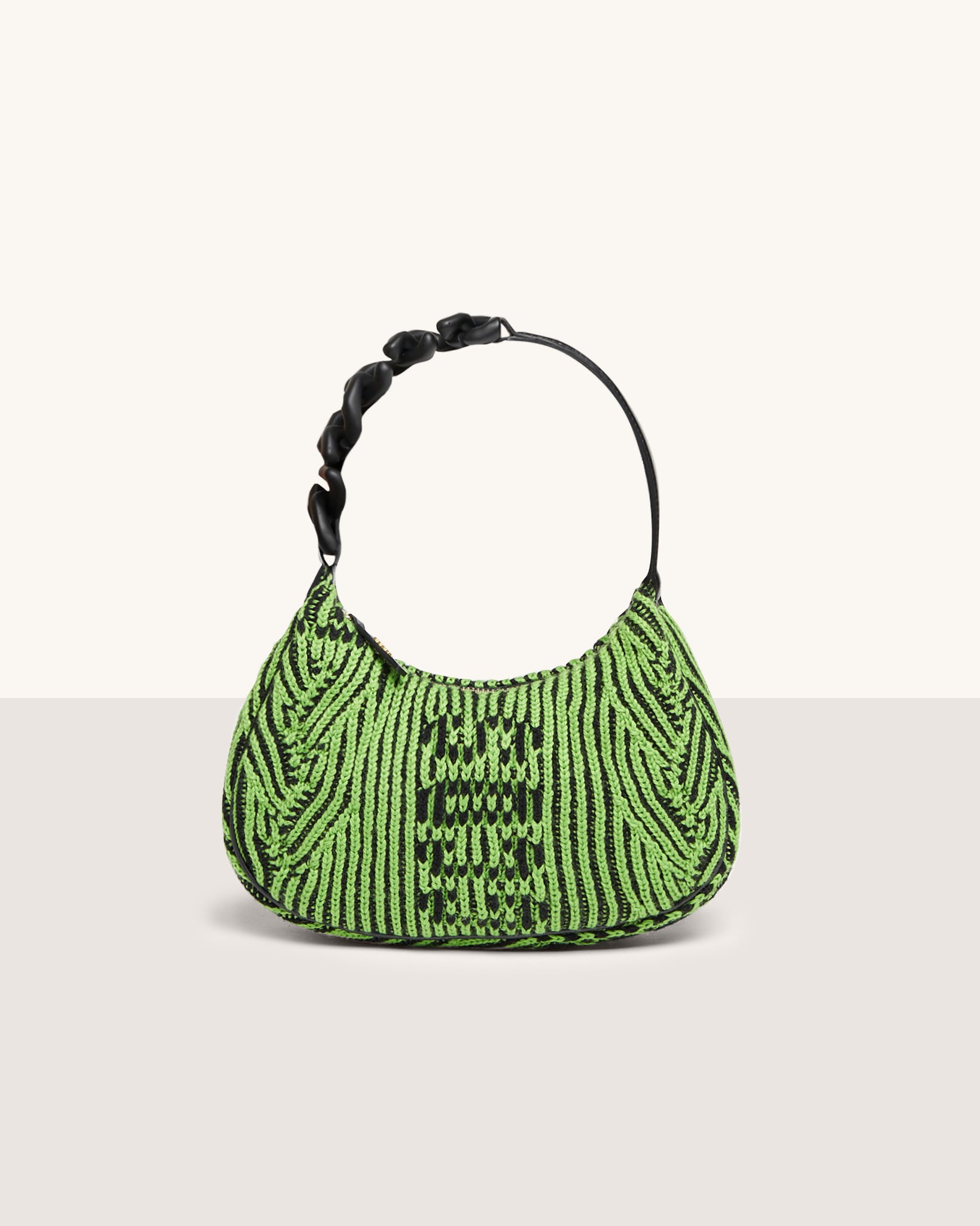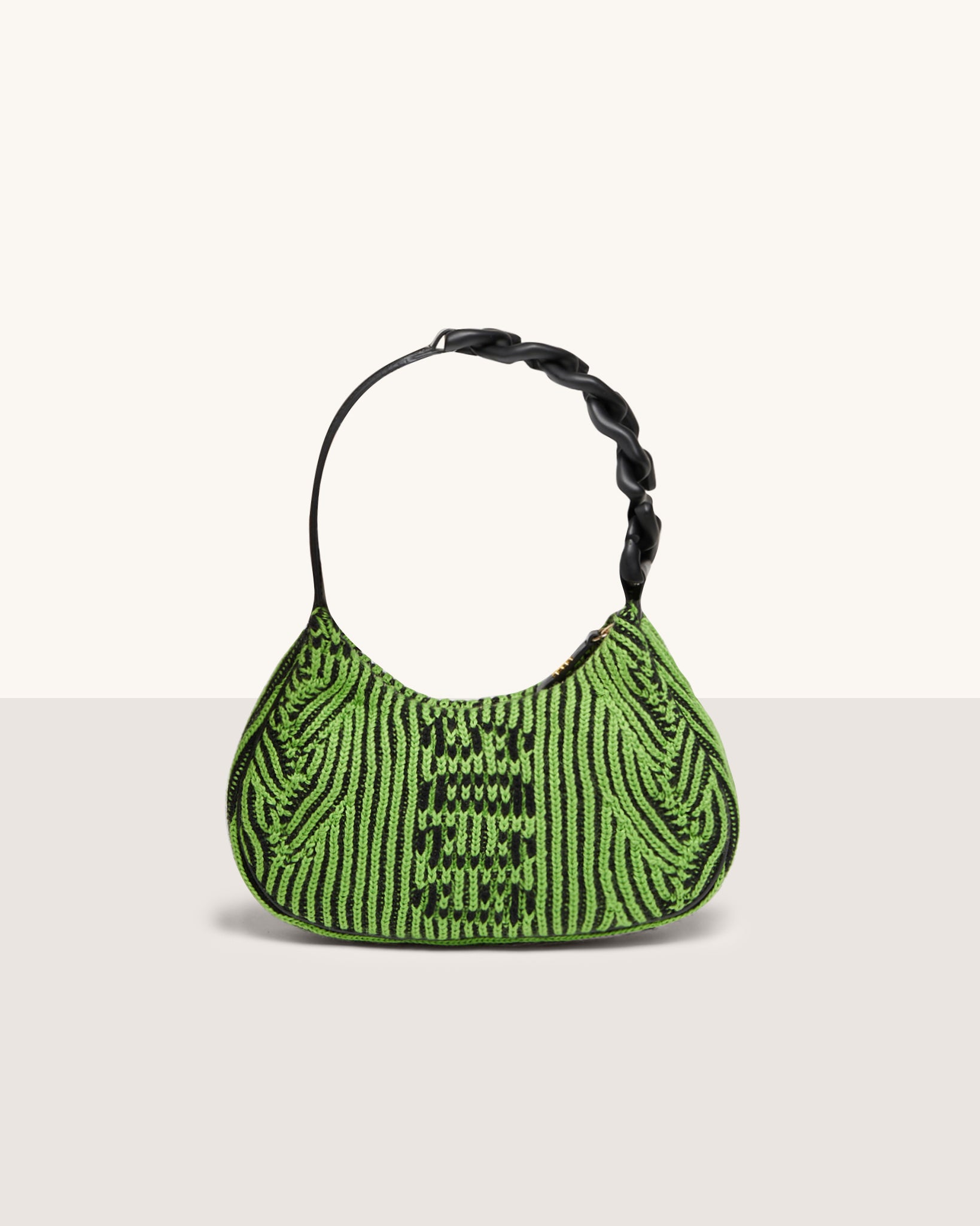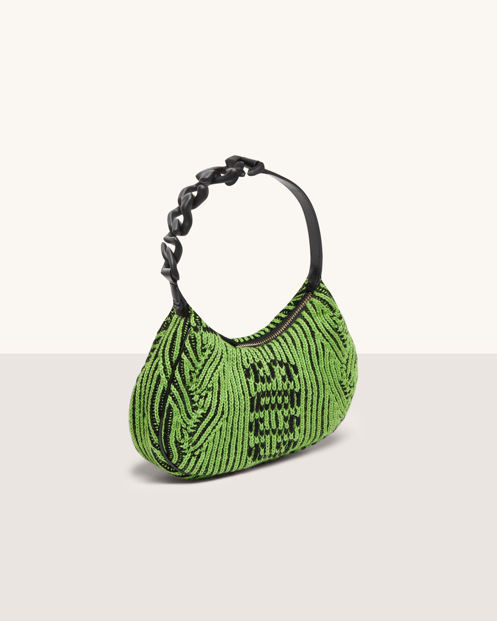 GCDS baguette bag with vanisè braid knitted mezzaluna with logo. ABS maxi logo chain on the handle.