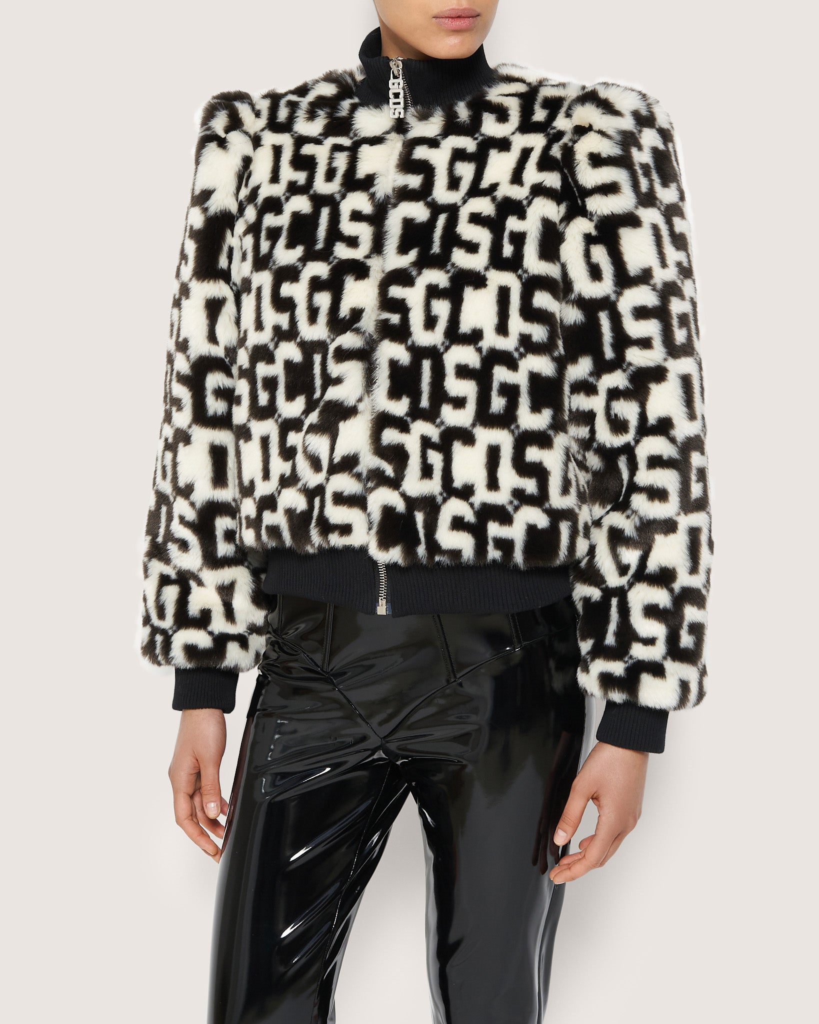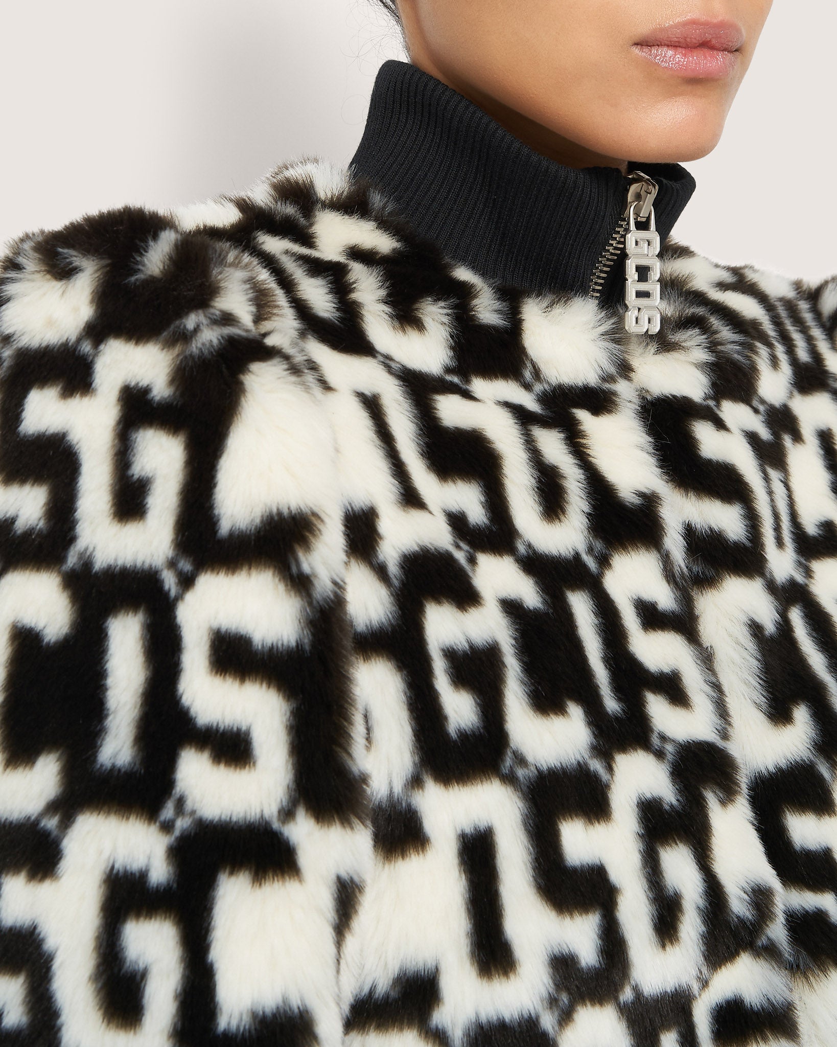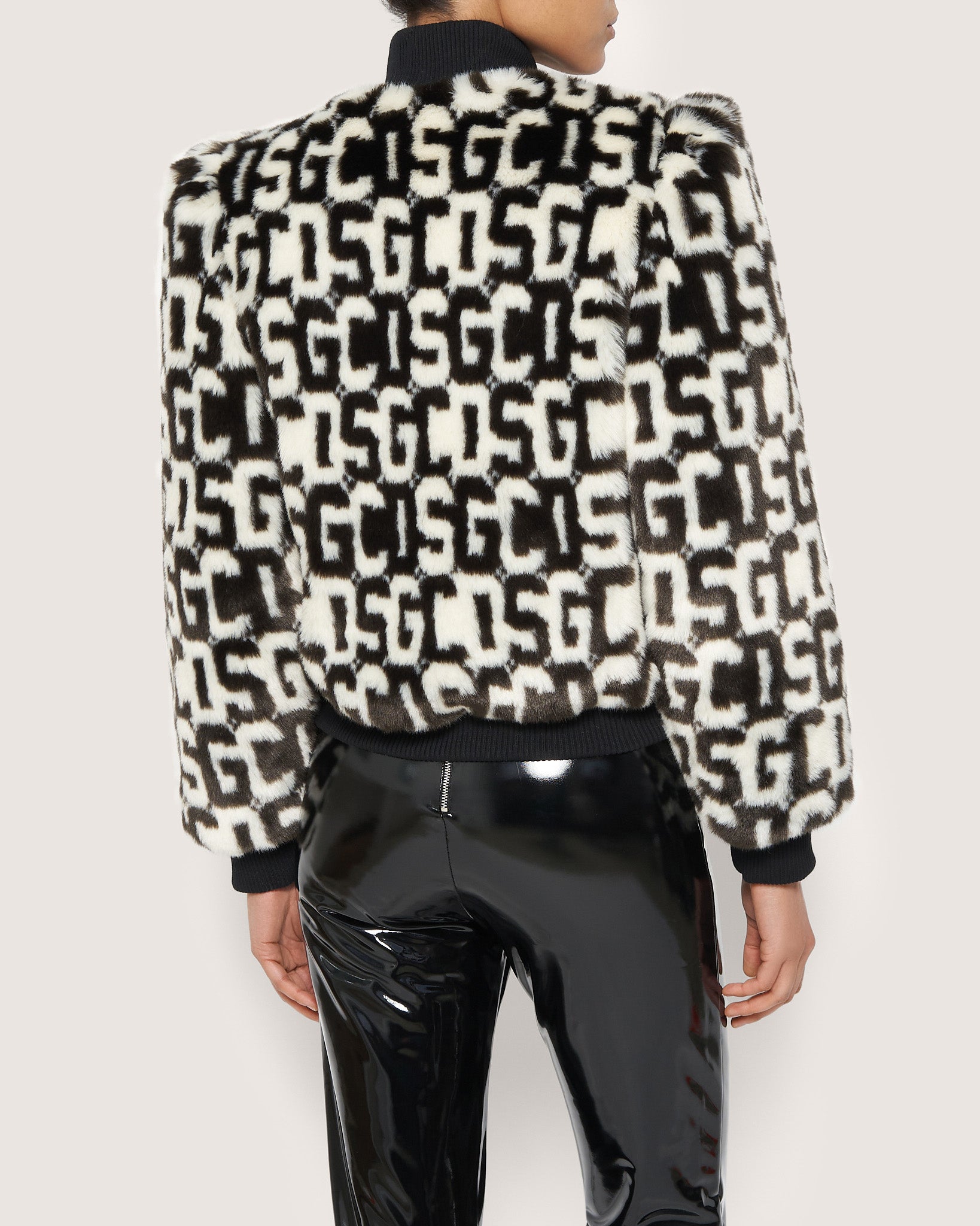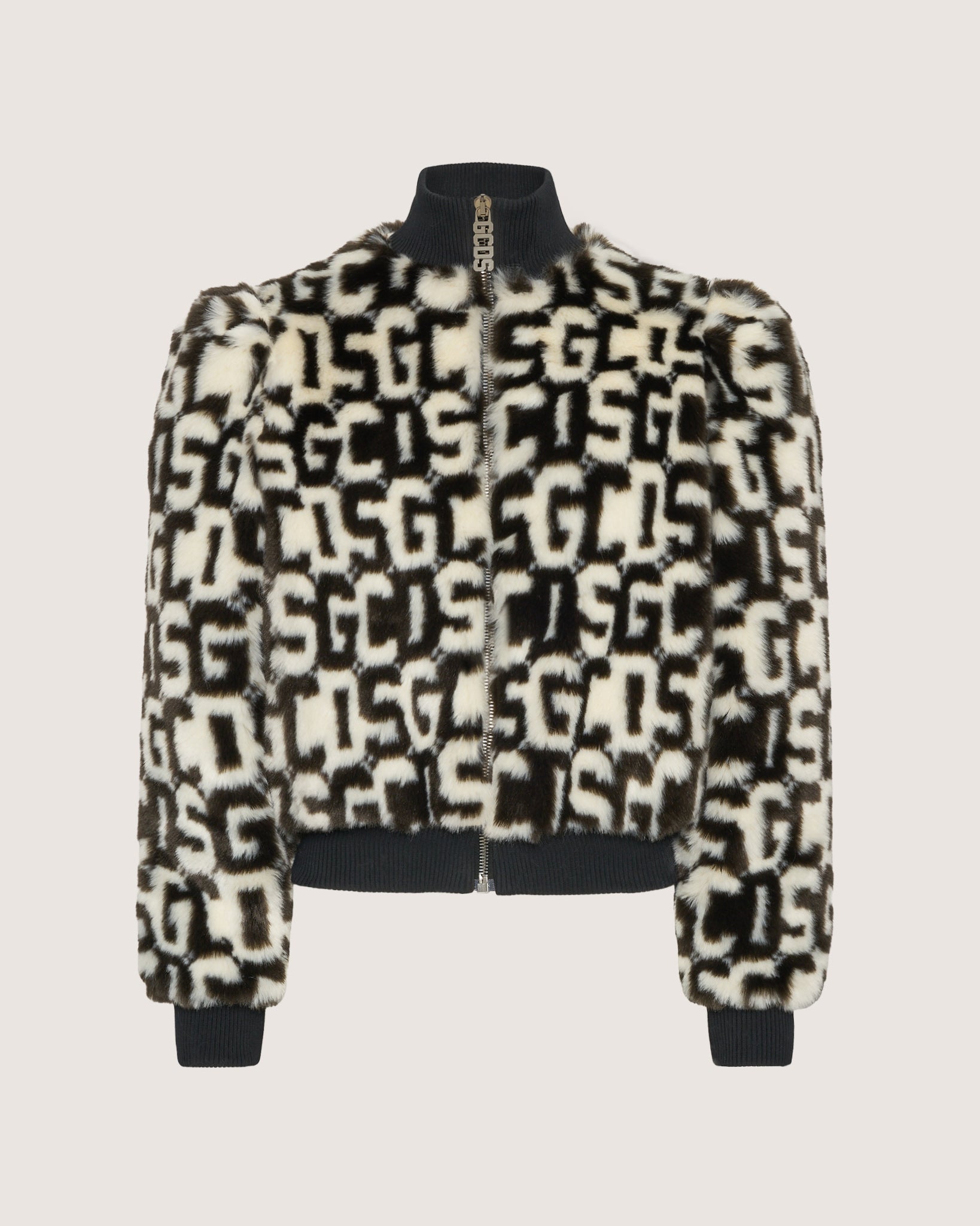 GCDS all-over monogrammed printed faux fur bomber jacket with pronounced shoulder pads and generous sleeves. Zipper closure. 80s inspired cut.