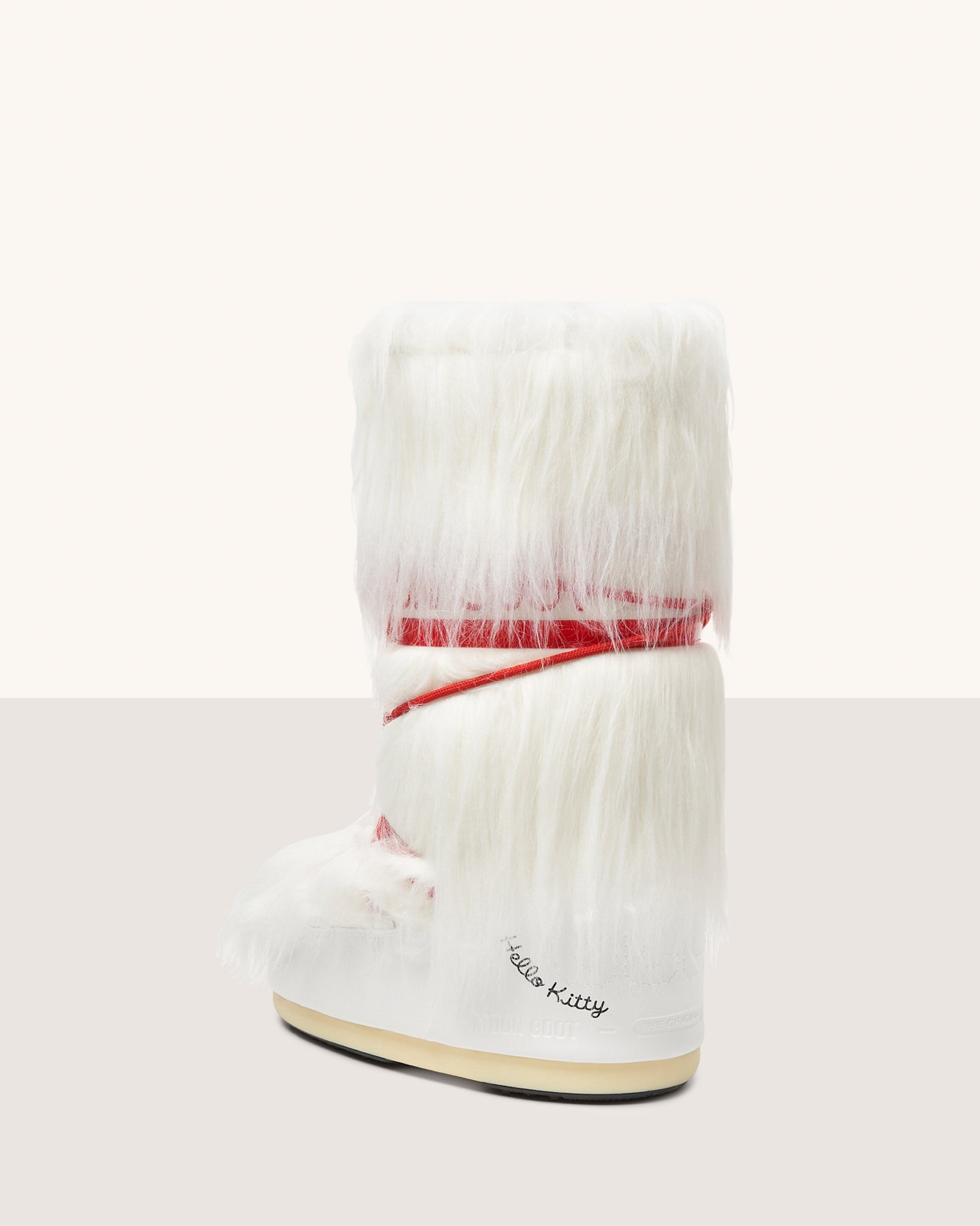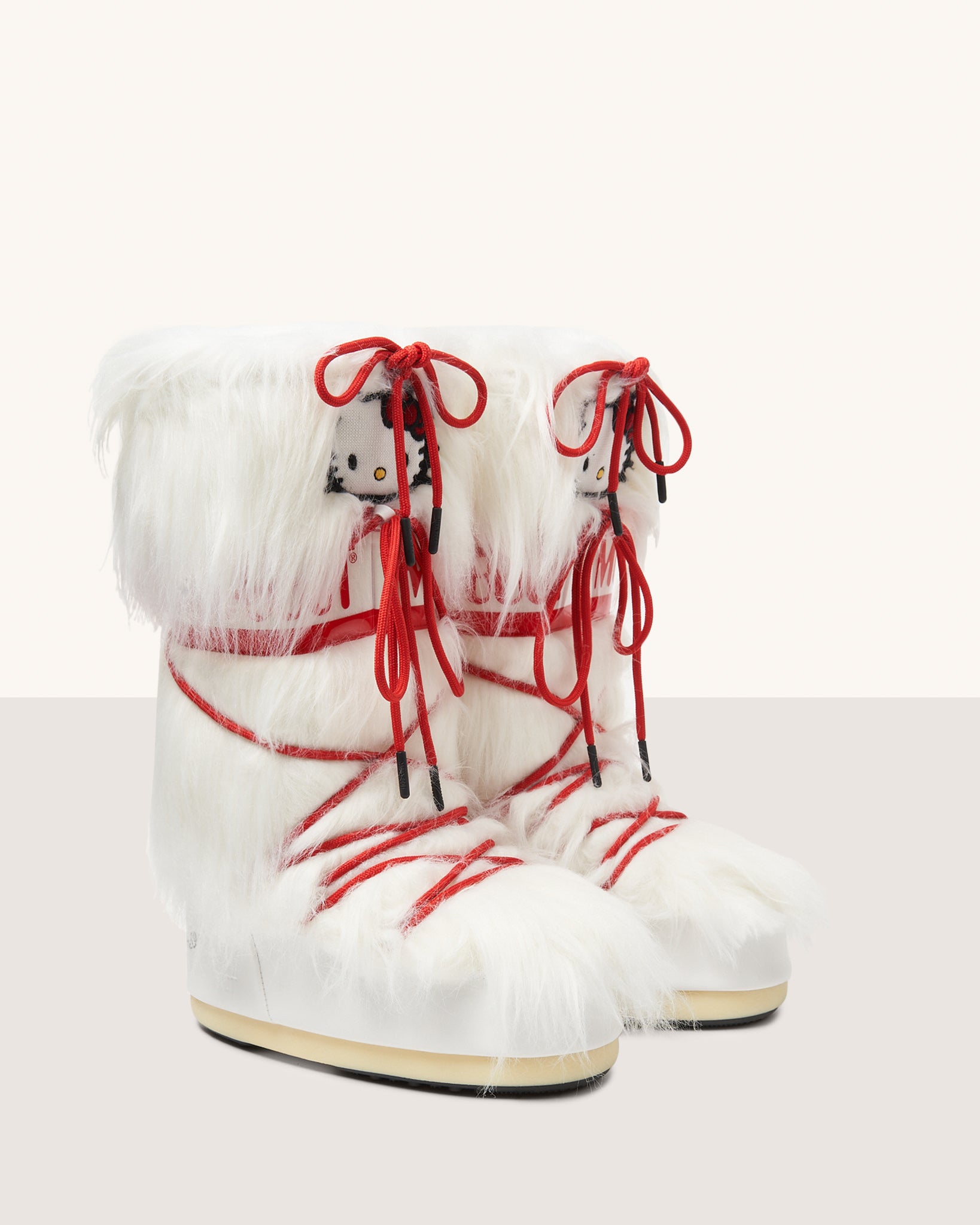 Iconic Moon Boot after-ski boots made exclusively for GCDS in Mongolian faux fur effect with knitted Hello Kitty patch on the front. Contrasting PVC Moon Boot logo band. Characteristic rubber sole, lace-up fastening and rounded toe. On the heel, stitched GCDS logo and Hello Kitty logo.