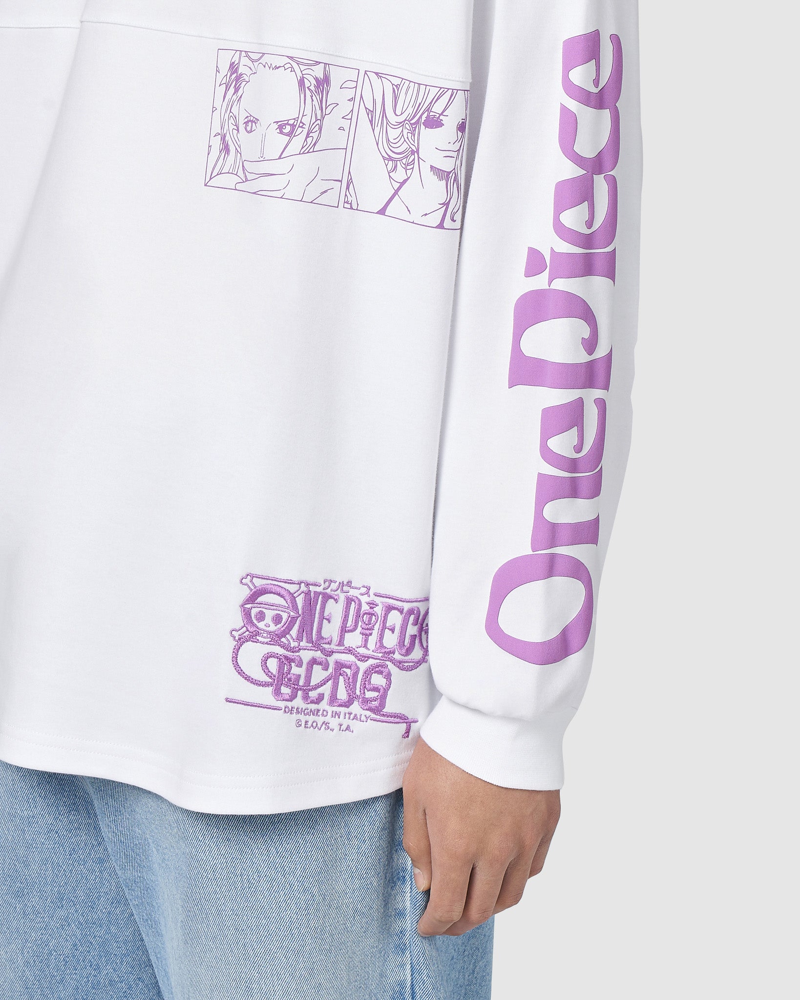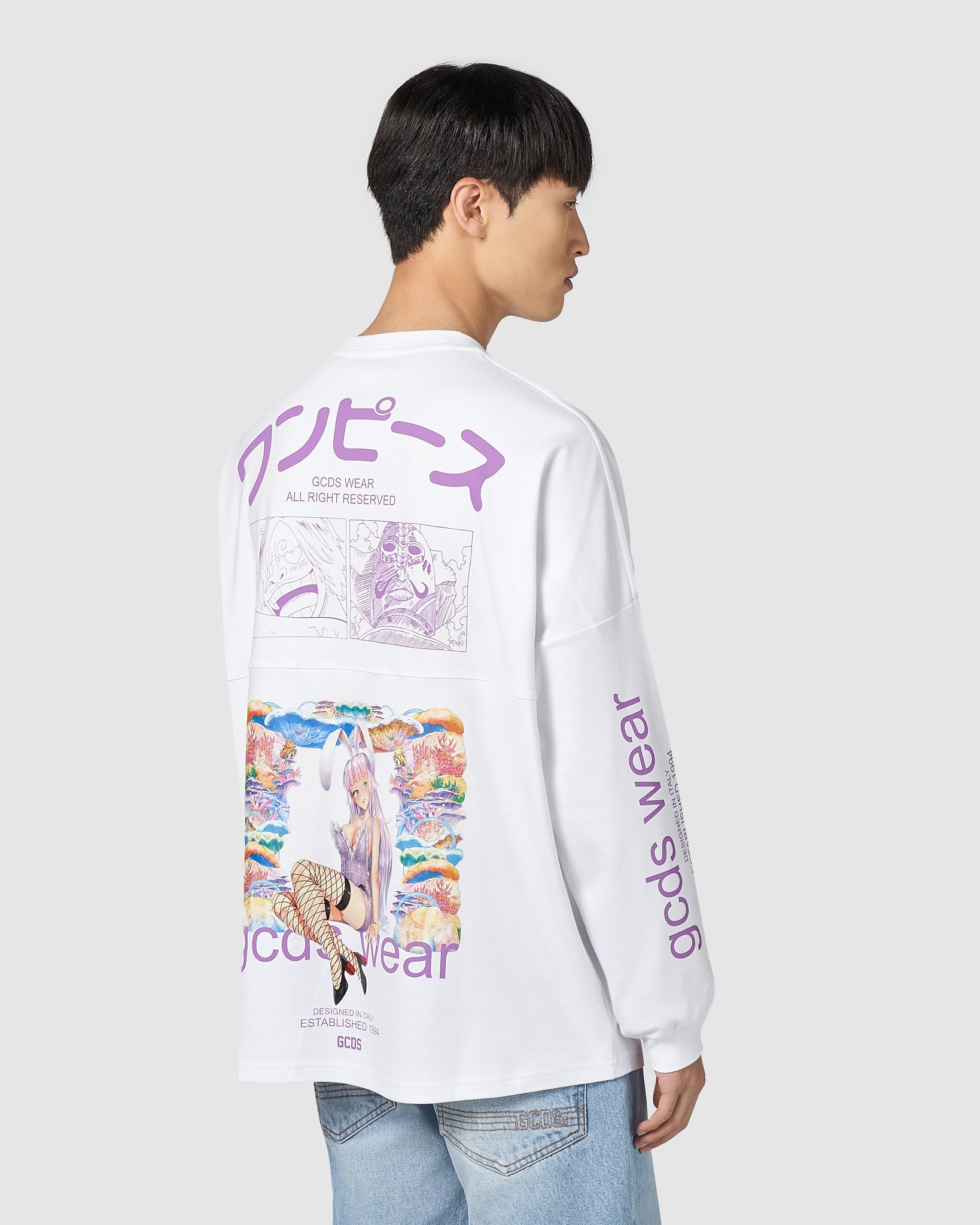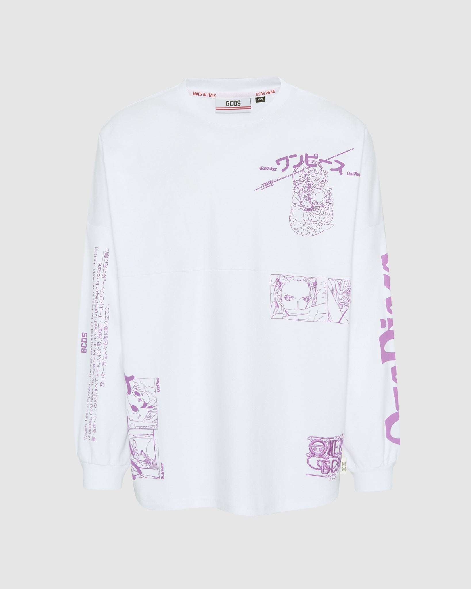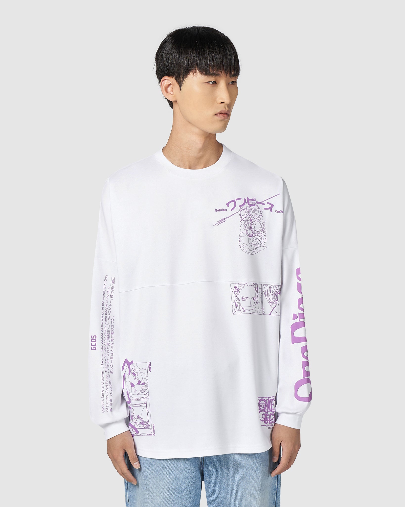 Long-sleeved GCDS T-shirt from the seasonal collab. On the front, silk-screen print and embroidered exclusive One Piece x GCDS logo with 3D effect. Sleeves with raised and silk-screen print. On the back, horizontal dart and double silk-screen and digital prints. Wide armhole.