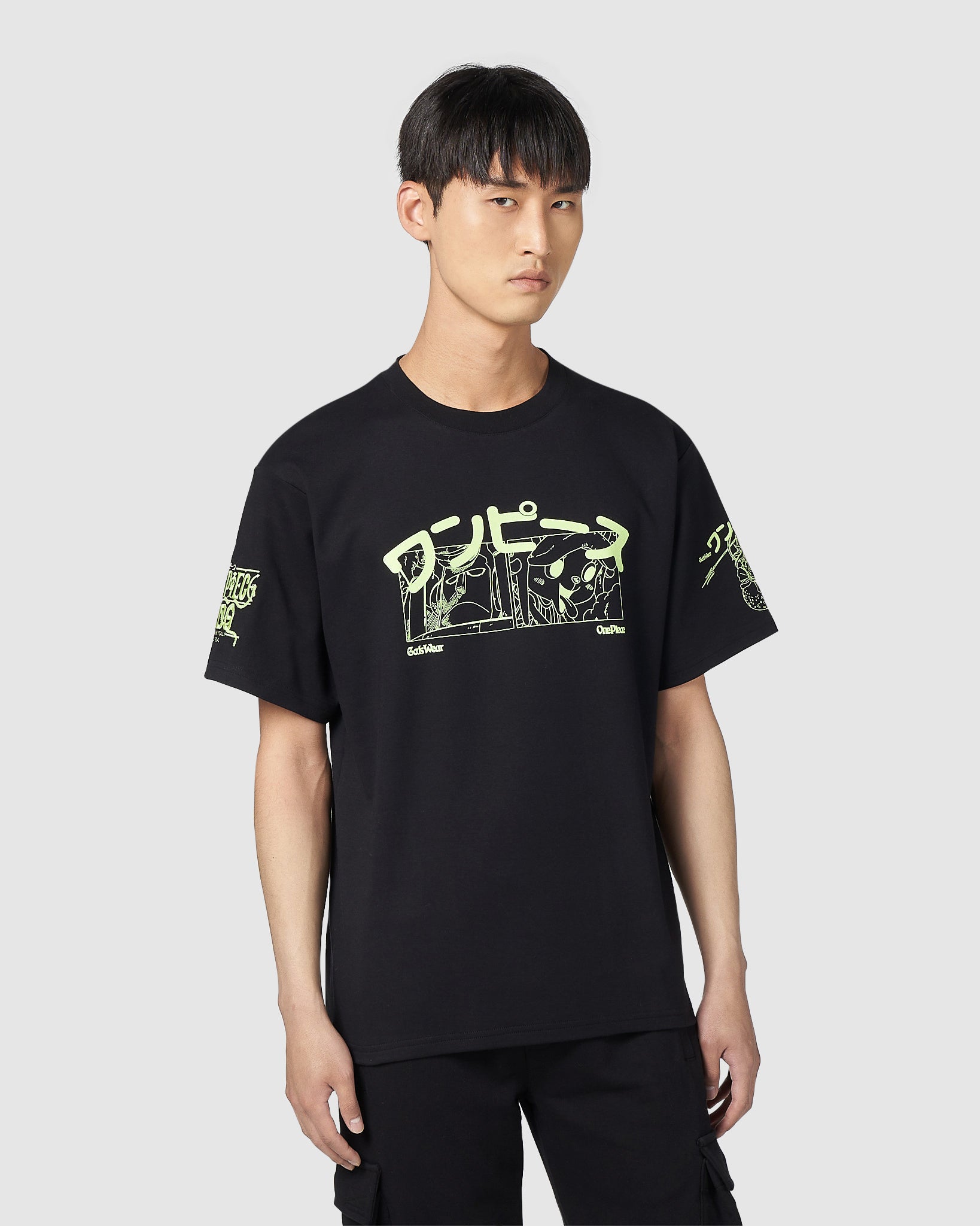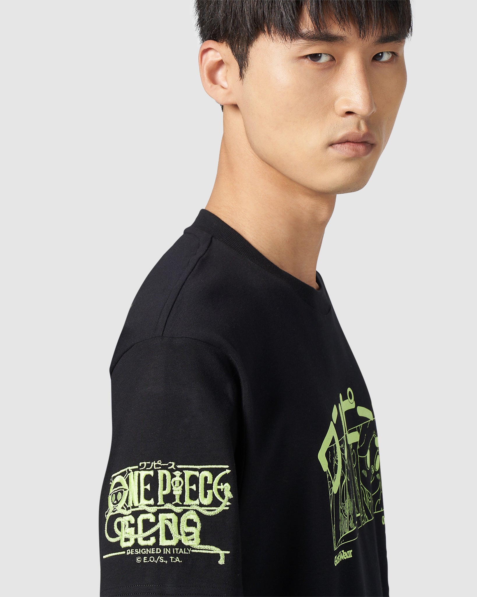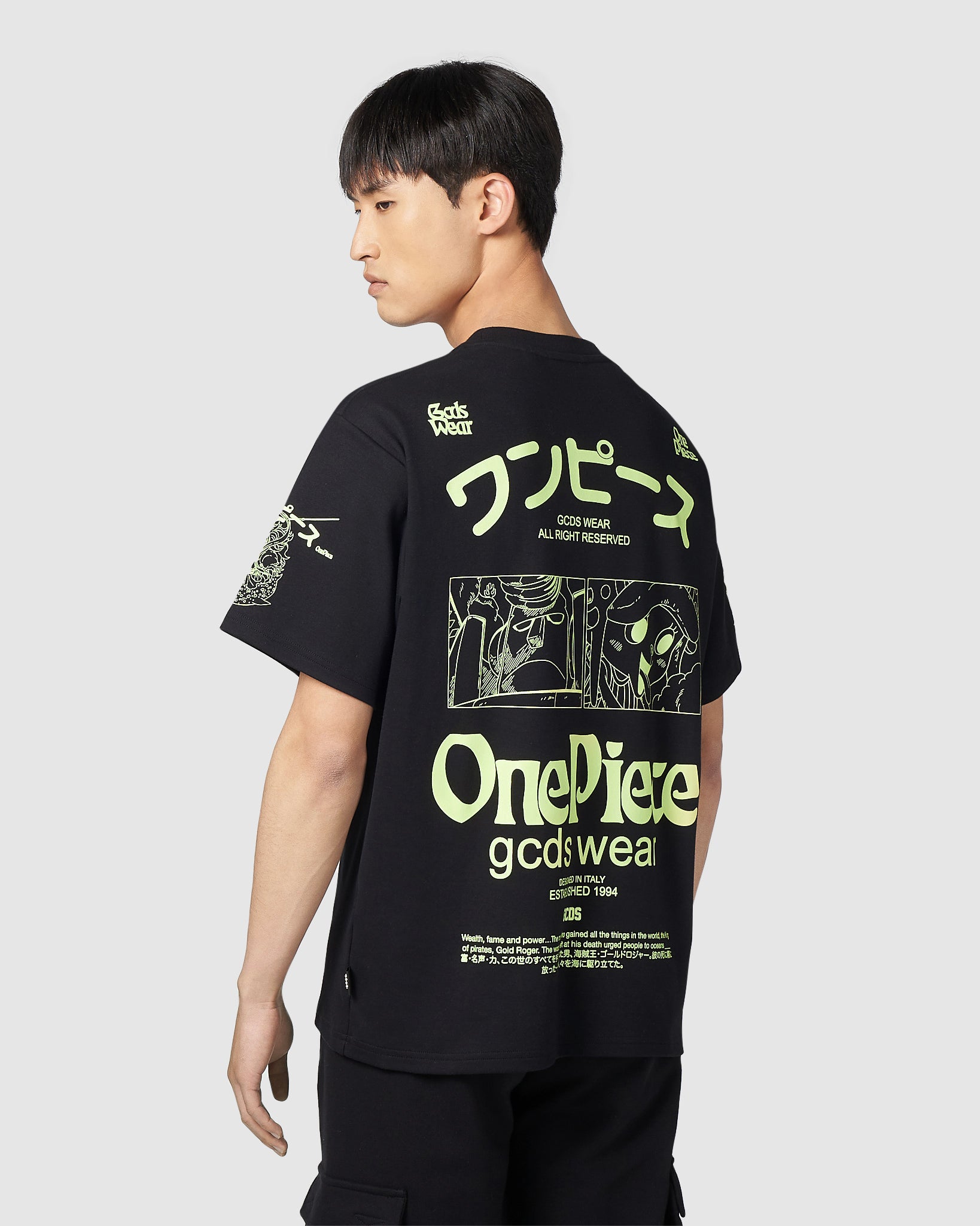 GCDS cotton T-shirt from the seasonal collab. Silk-screen print on the front, back and sleeves. On the right sleeve, exclusive One Piece x GCDS logo in 3D effect embroidery. Classic cut, regular fit.