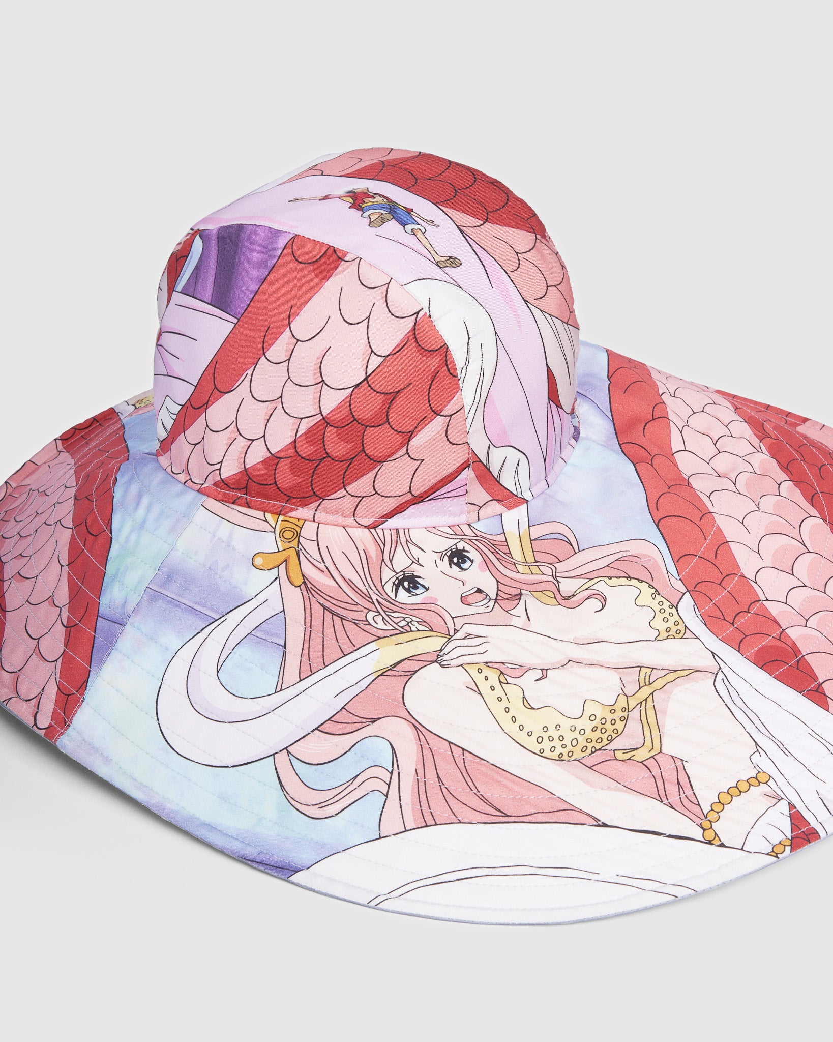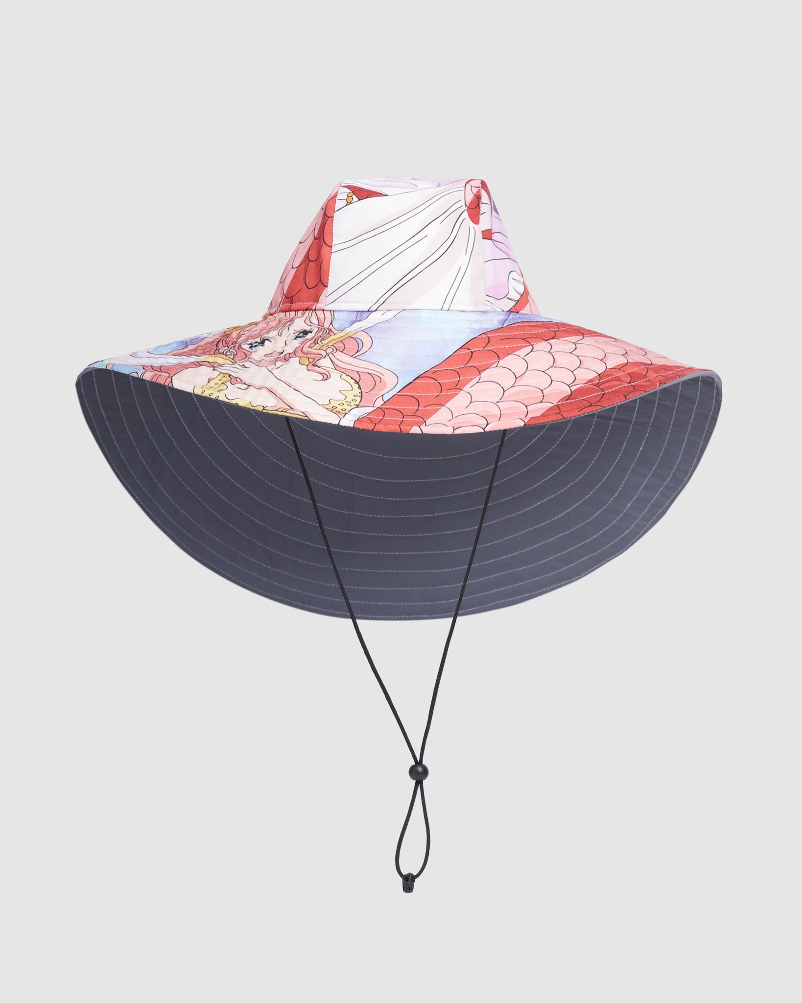 Wide-brimmed GCDS hat from the seasonal collab. Shirahoshi character print on the outside. Reflective fabric inside. Cord tie with PVC cord tie pull.