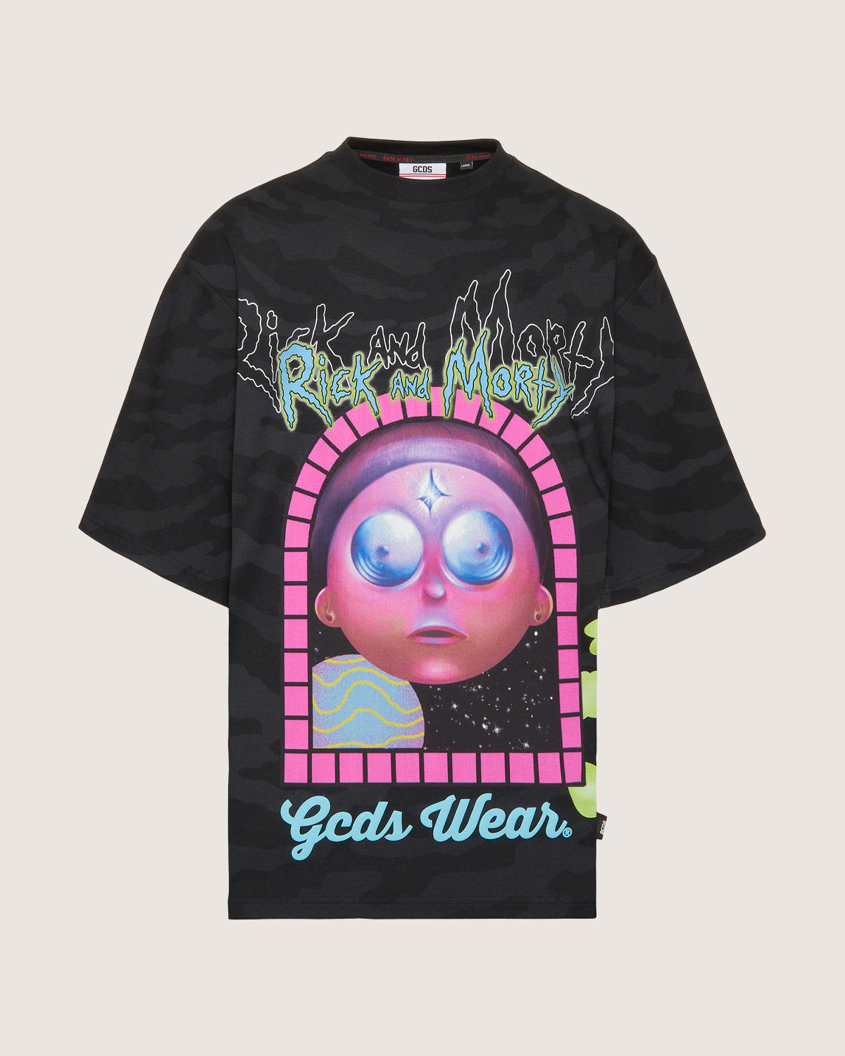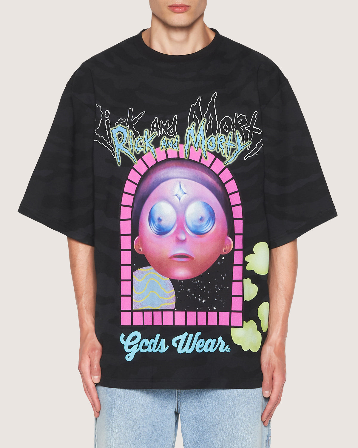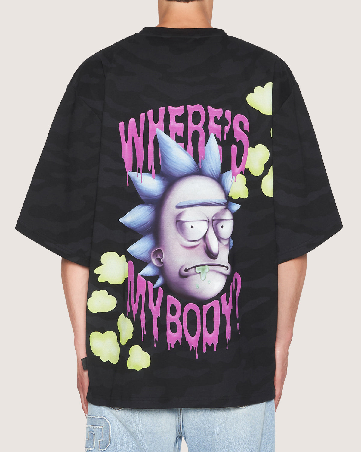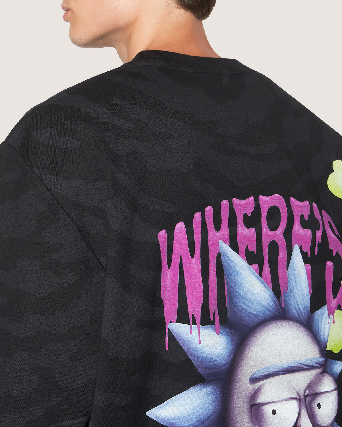 Oversized cotton t-shirt with Rick and Morty prints on front and back with allover camouflage.