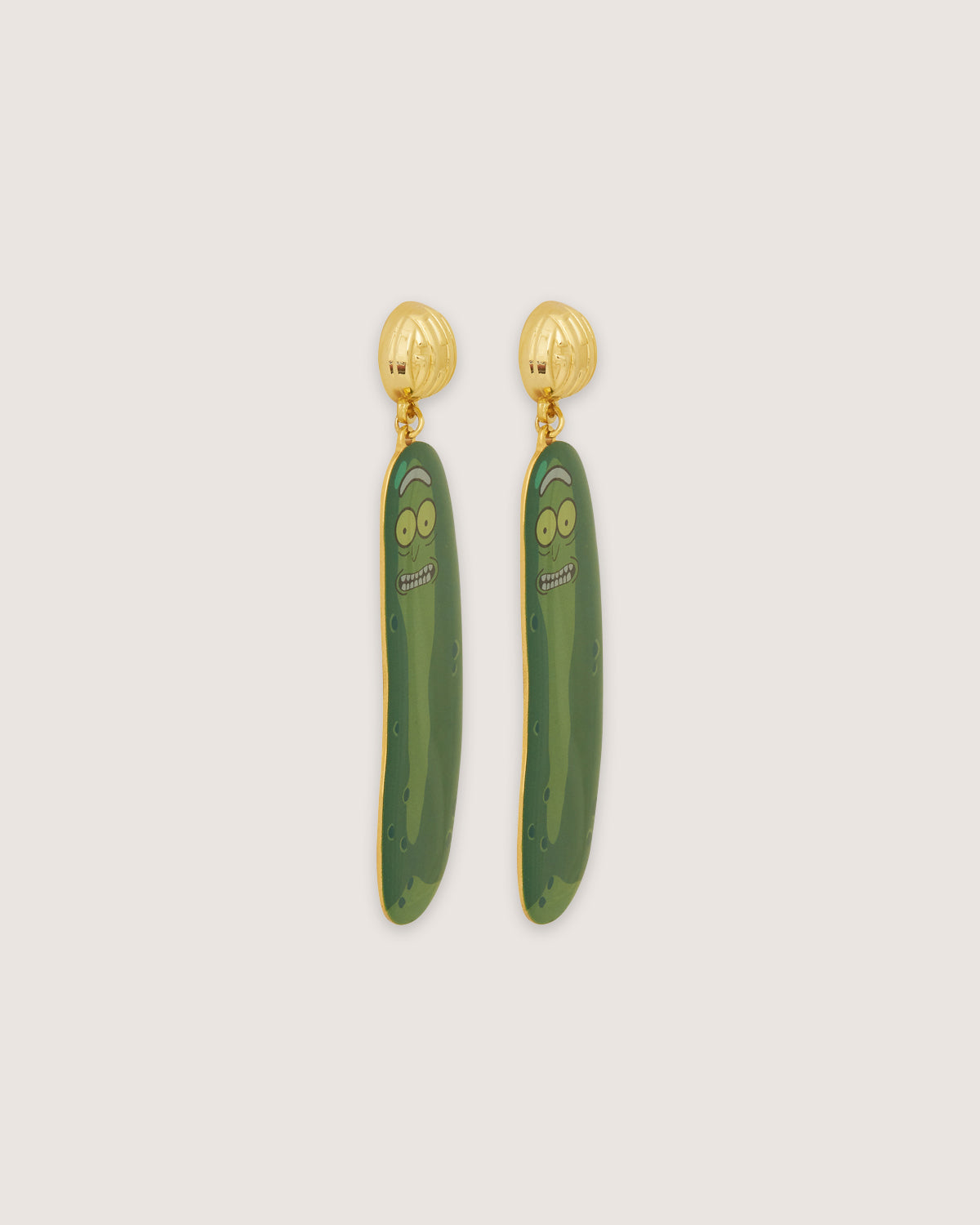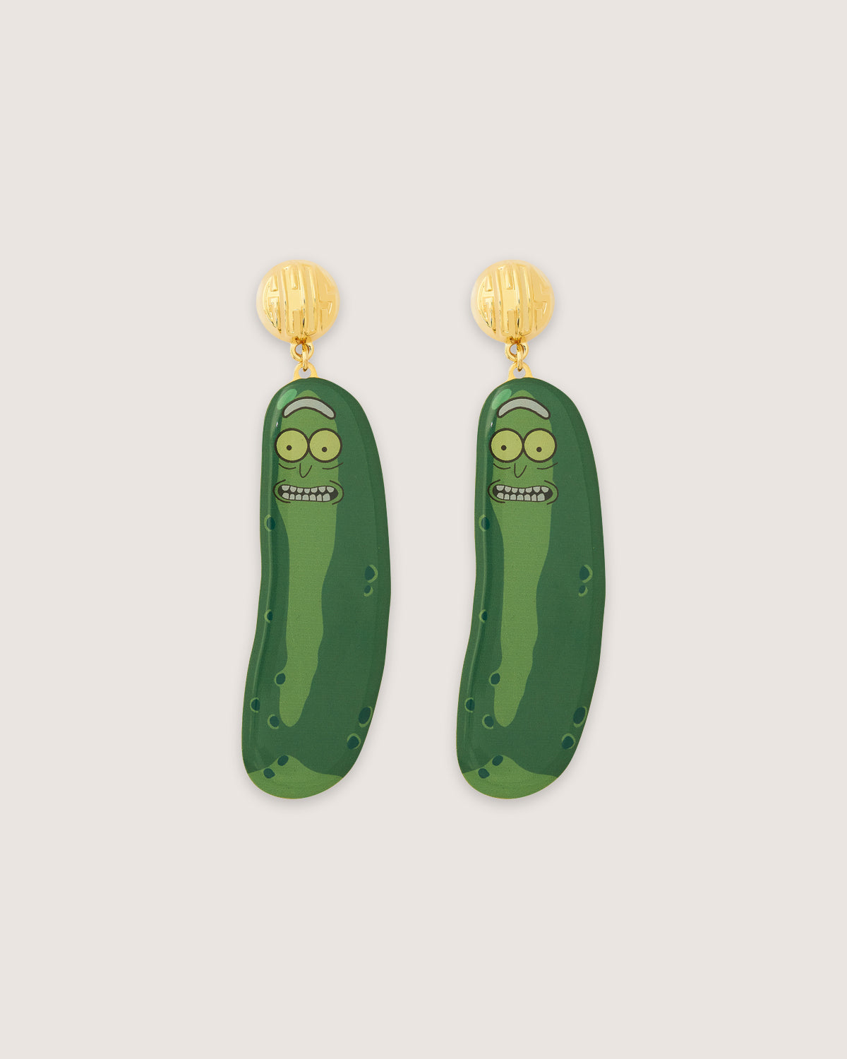 Handmade dangle earrings with Pickle Rick pendant, mounted on logo button.