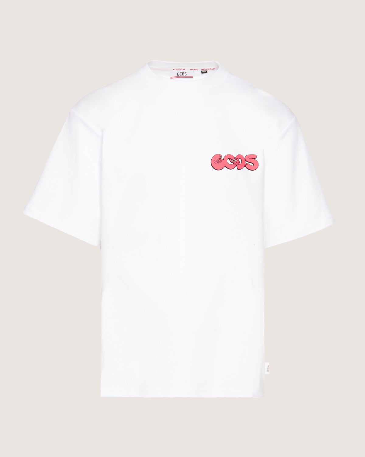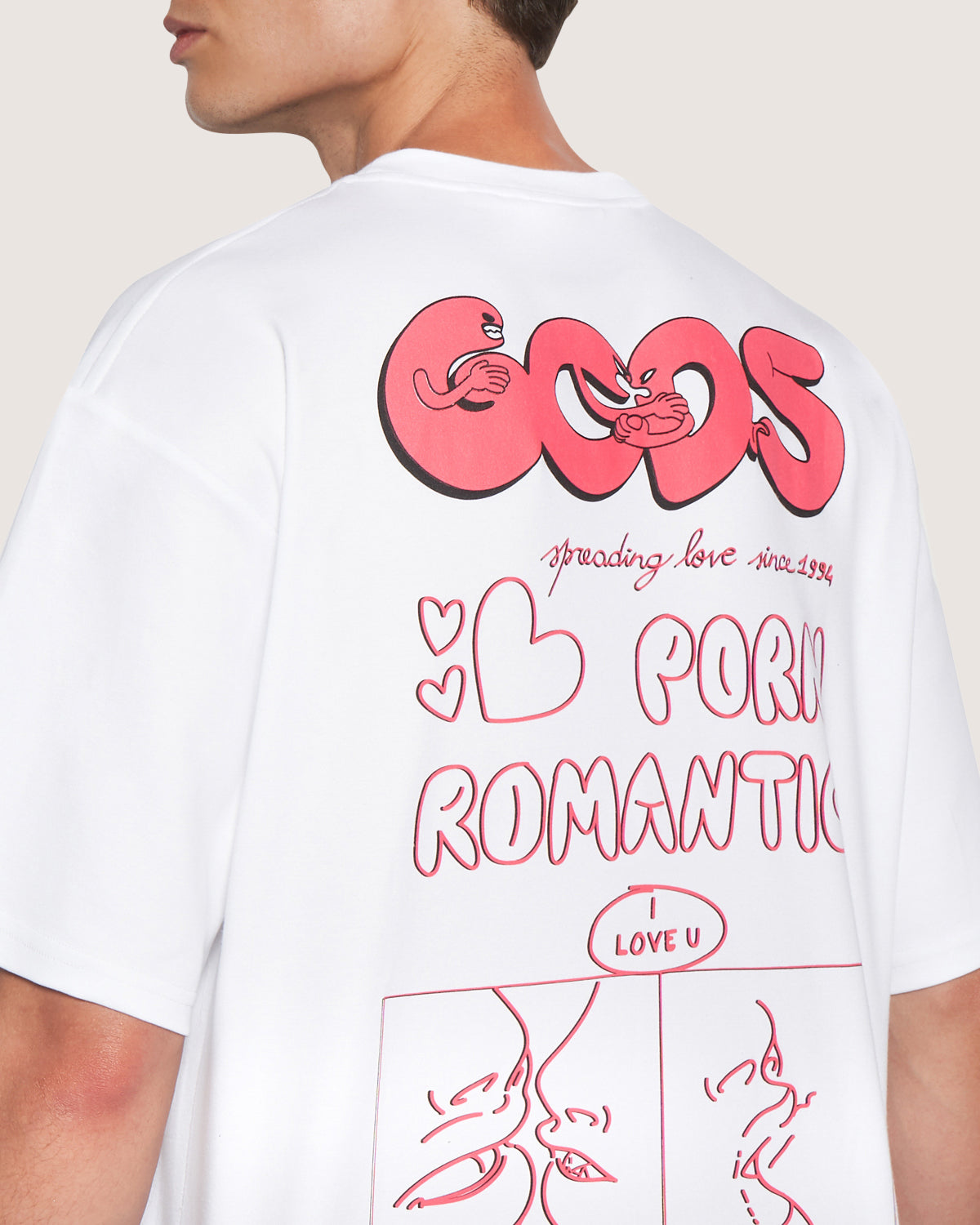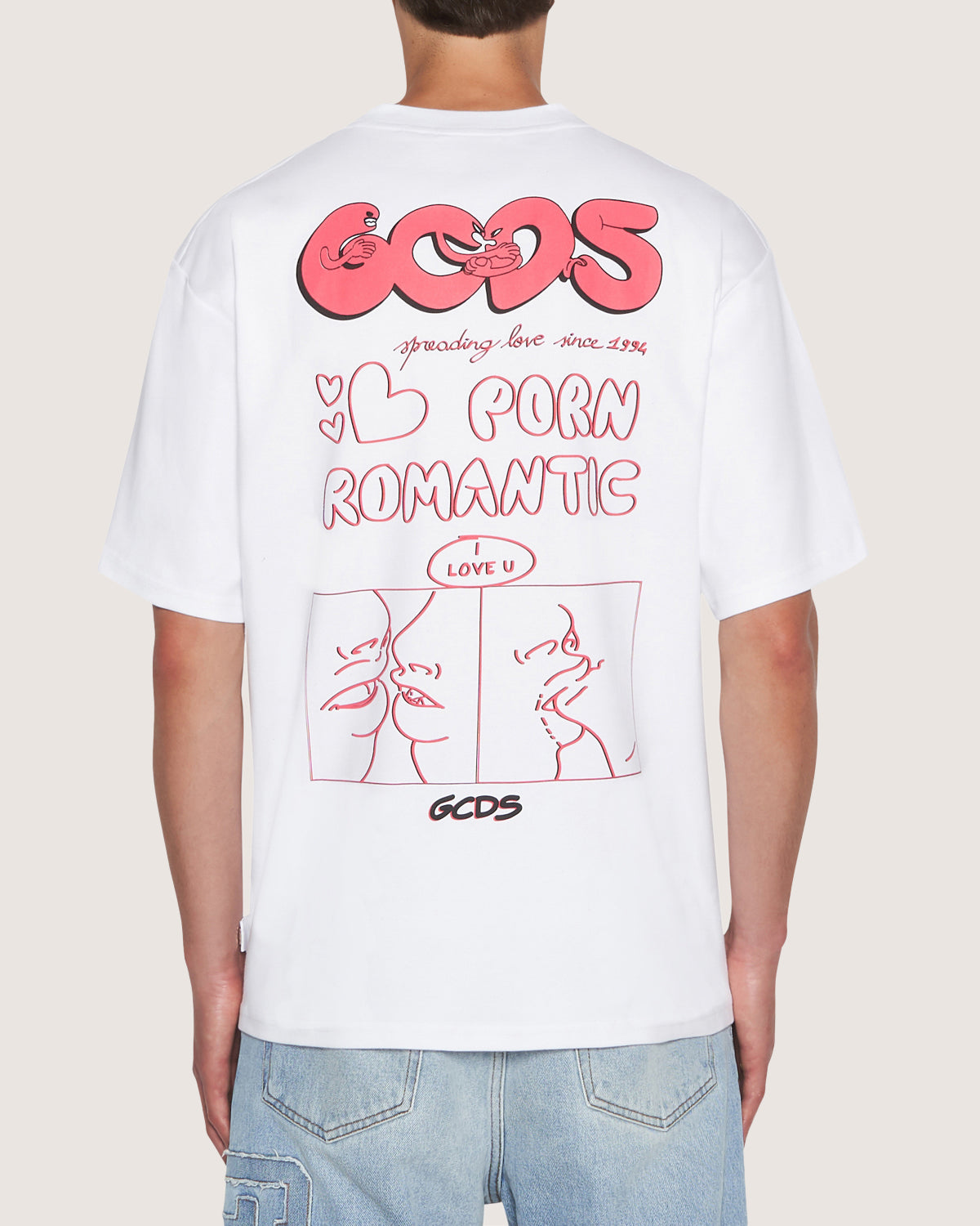 Cotton T-shirt with Porn Romantic print on the back and GCDS logo on the front.