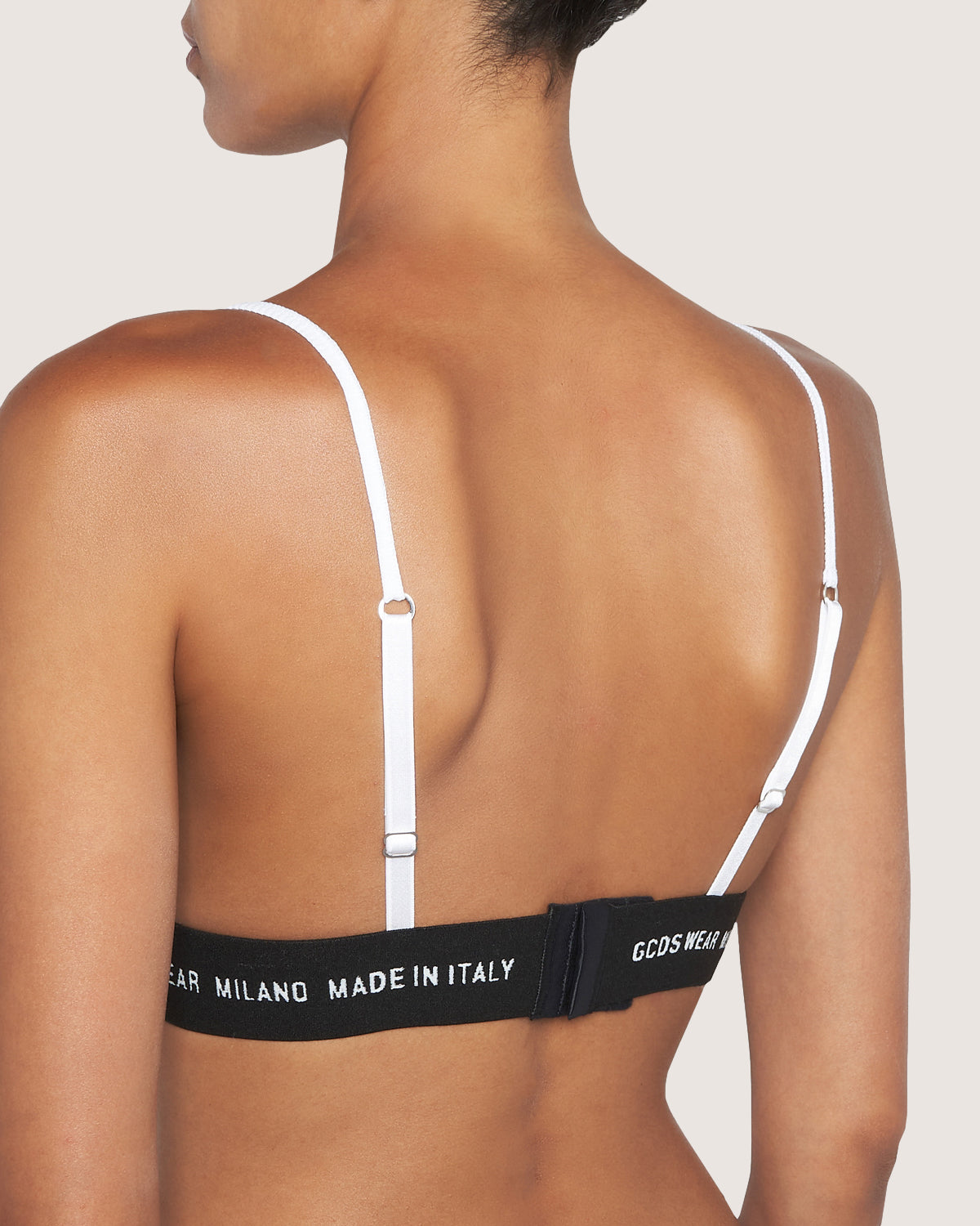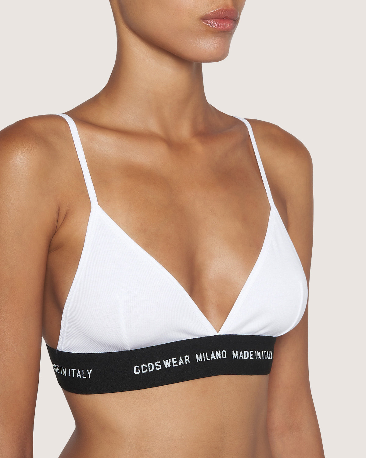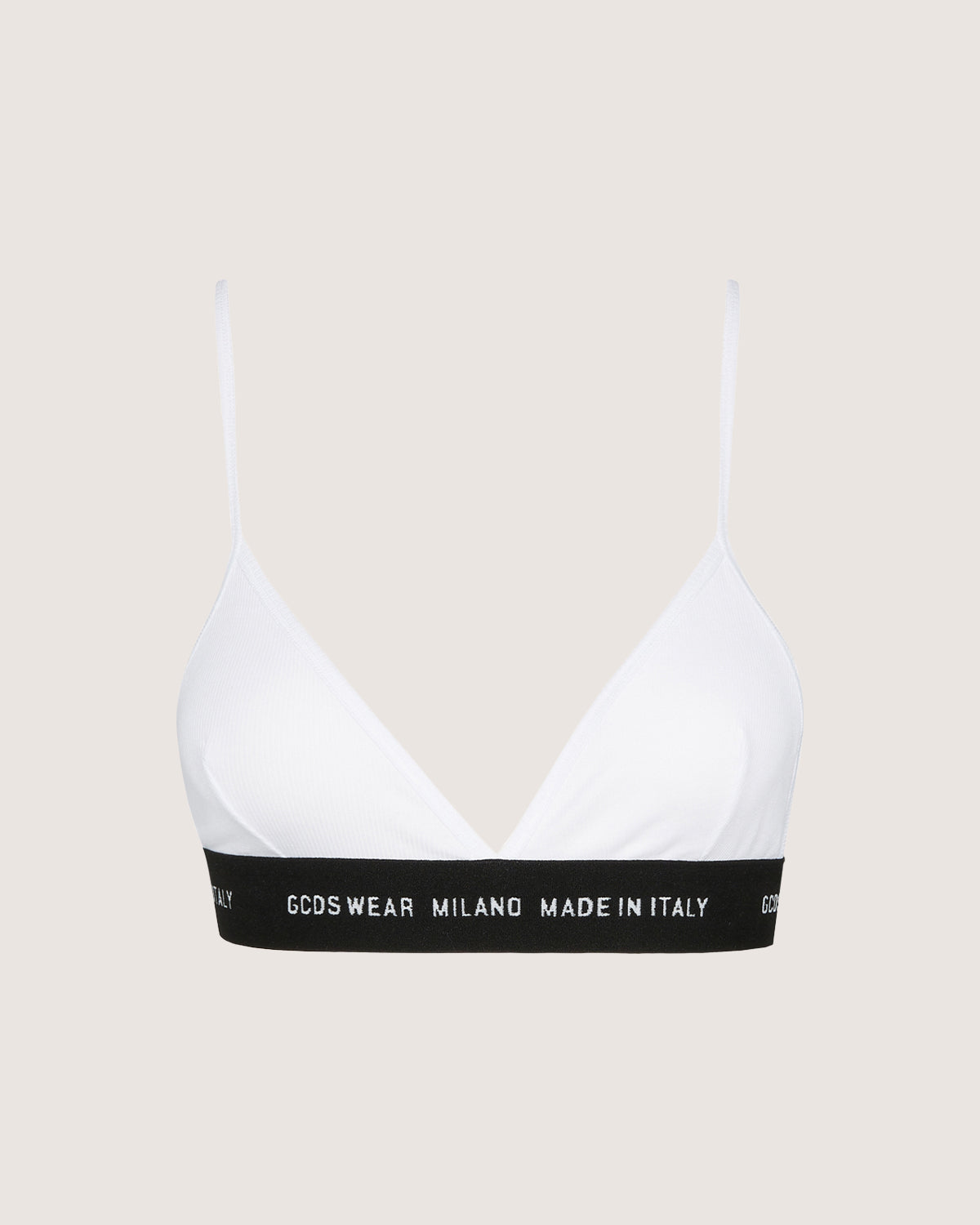 Triangular top in cotton rib knit with Gcds Wear logoed elastic at bottom.