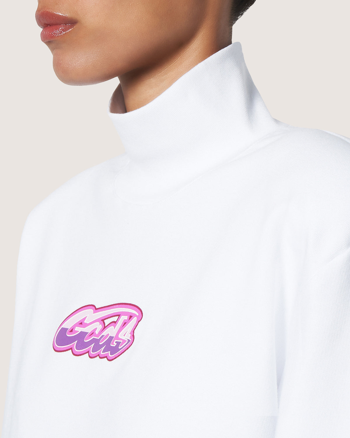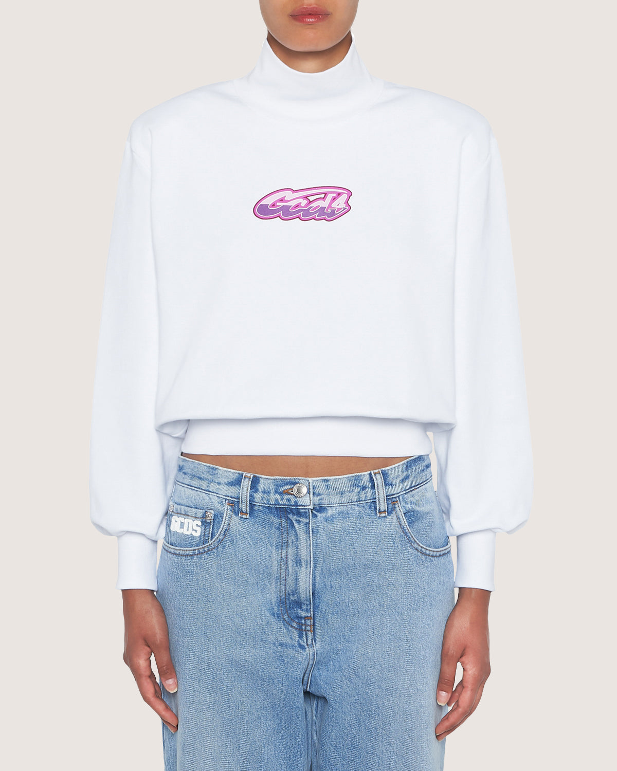 High neck cotton sweatshirt. Inserted shoulder straps and GCDS logo graphic print on the center front.