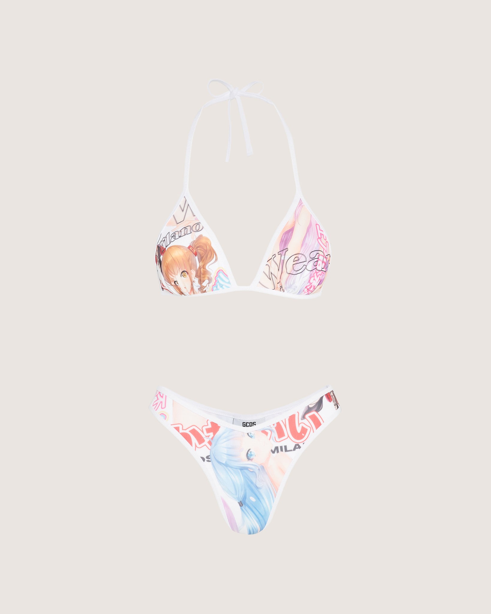 Printed lycra bikini with contrasting piping and ties. Triangle top and V-leg bottom on front.