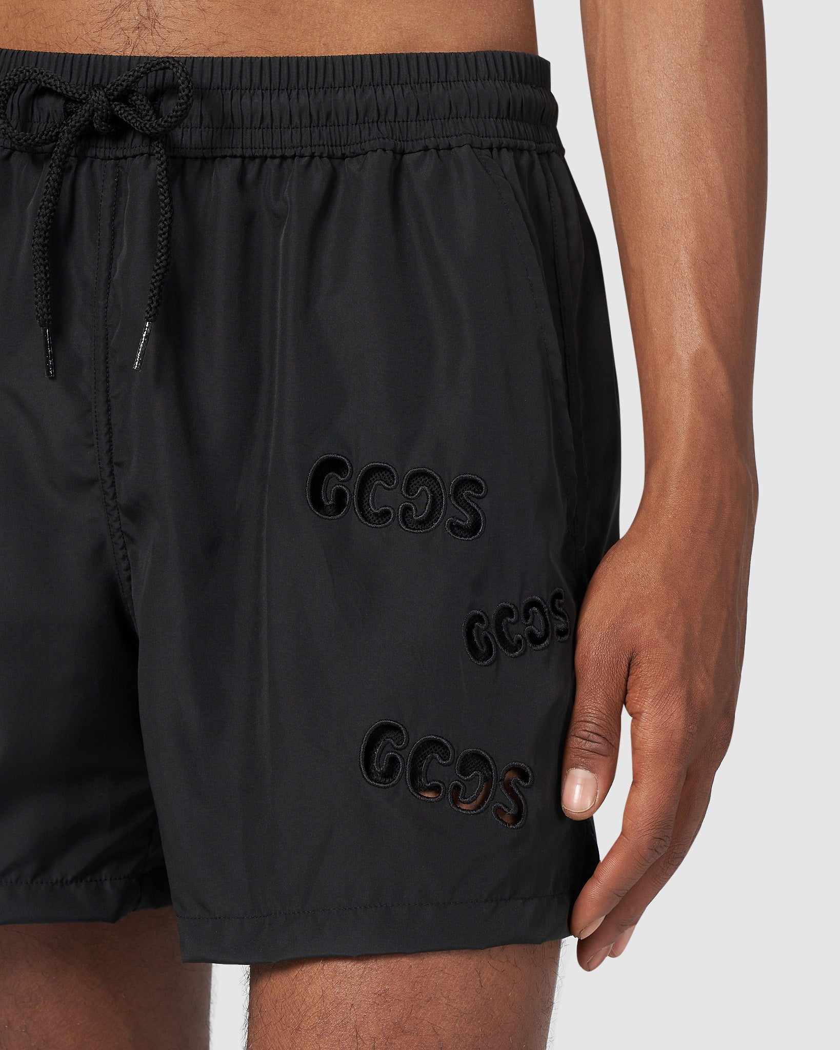 Nylon GCDS swim shorts with openwork embroidery on the left leg and side slits. Slash pockets. Elastic waistband and drawstring. Rear Velcro pocket.