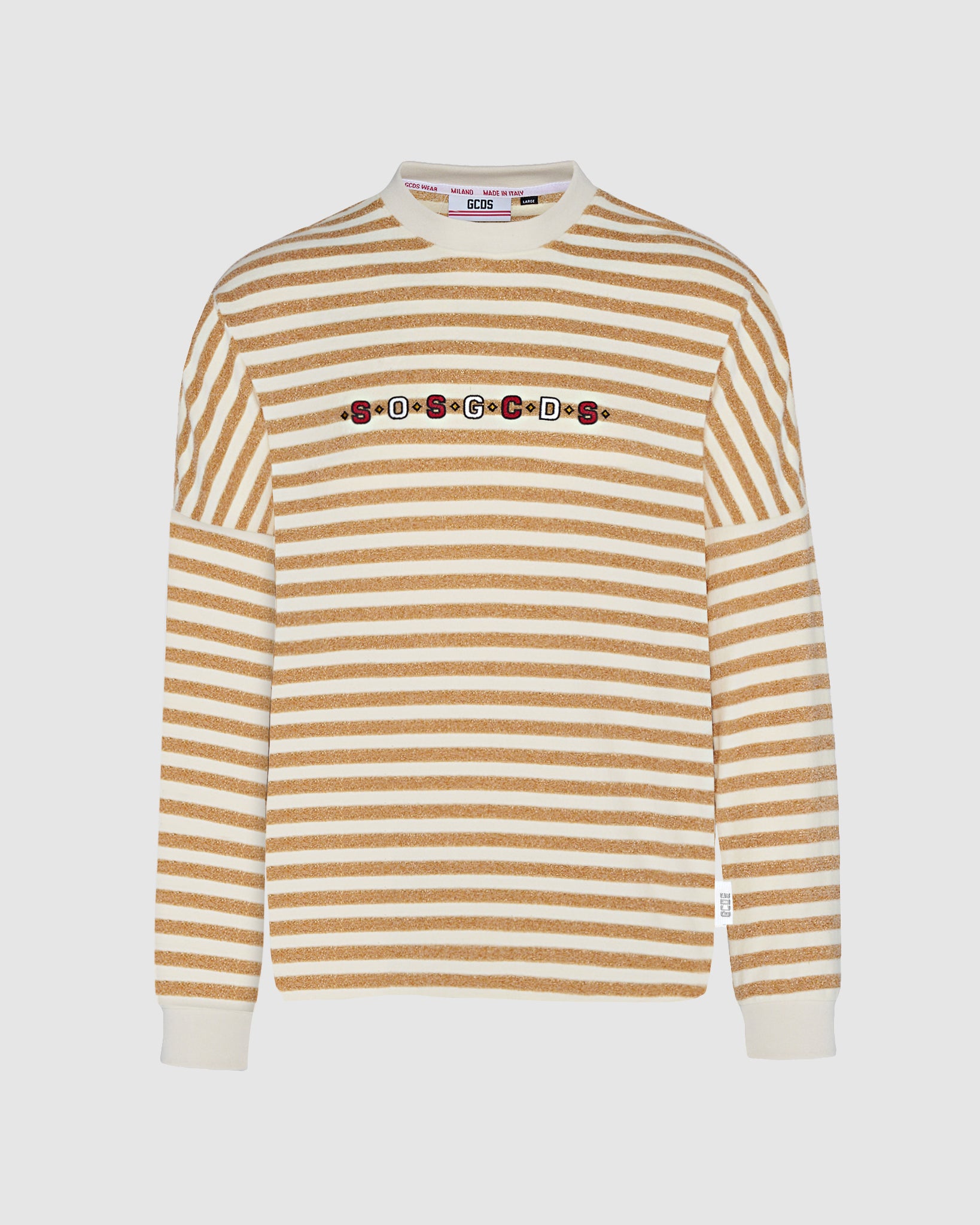 Long-sleeved GCDS terry cloth T-shirt with lurex striped design. On the front, central embroidery. GCDS Wear patch in jacquard fabric on the back. Wide armhole. Over-sized.