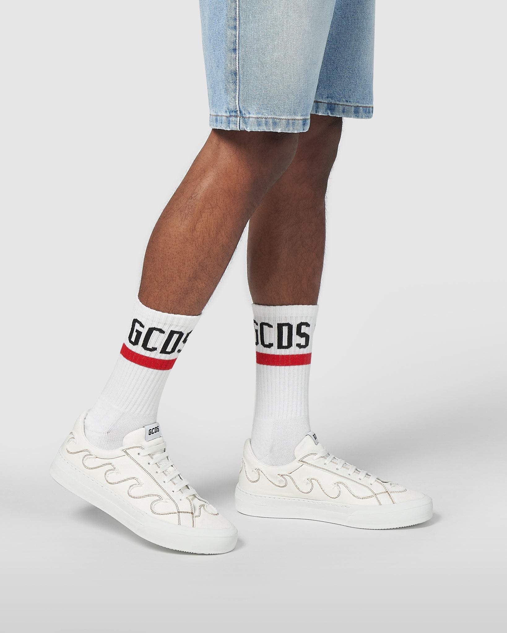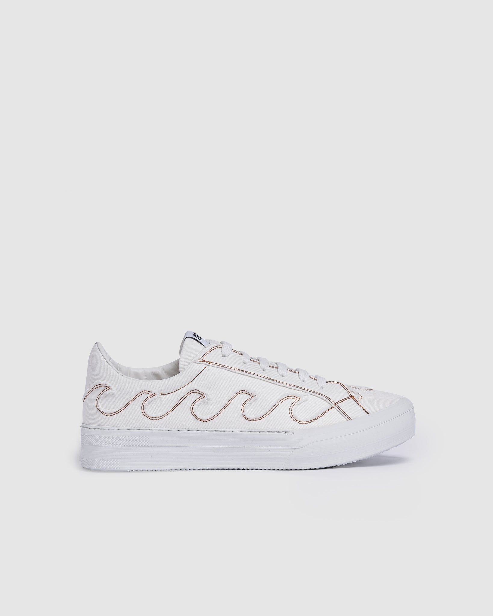 GCDS lace-up canvas sneakers featuring frayed Greek wave motif, stitched with tobacco colored topstitching all around the vamp. Casual rubber sole, with tone on tone box sole stitching.