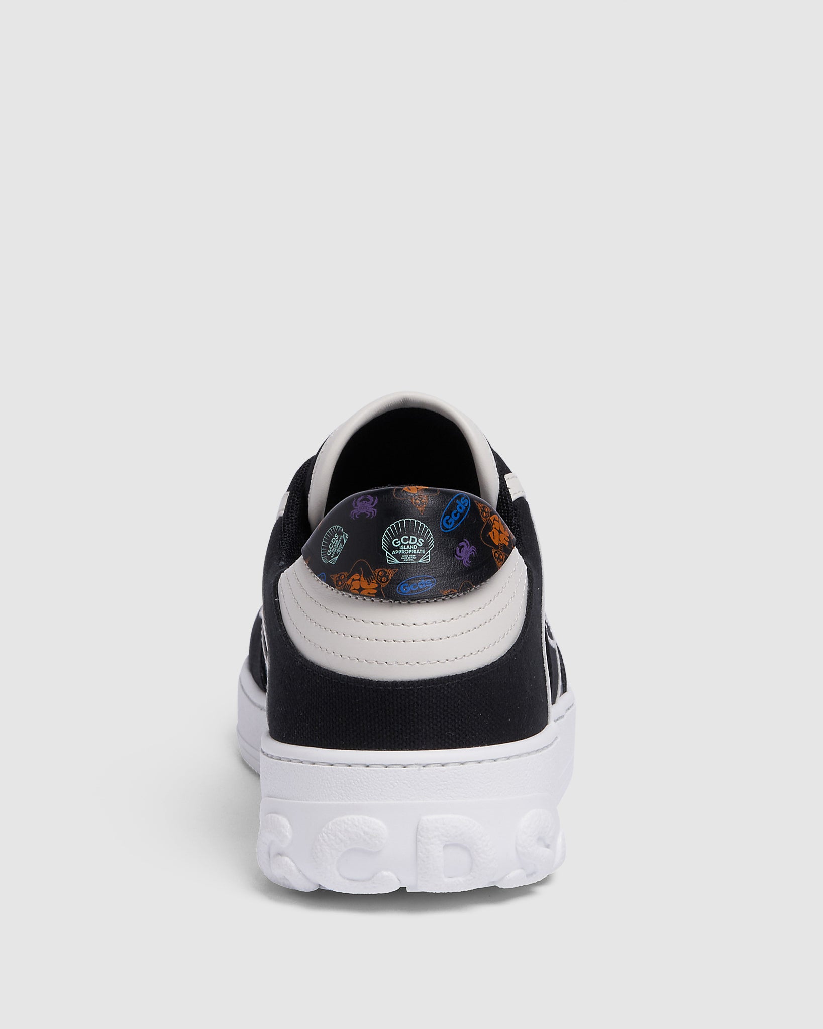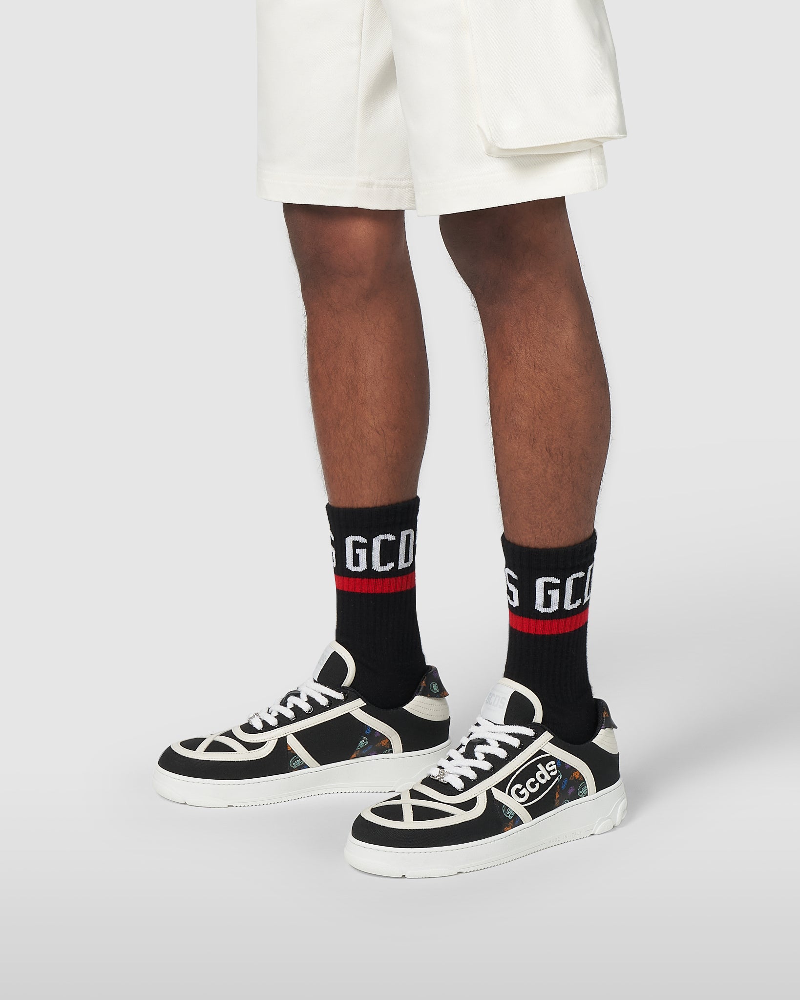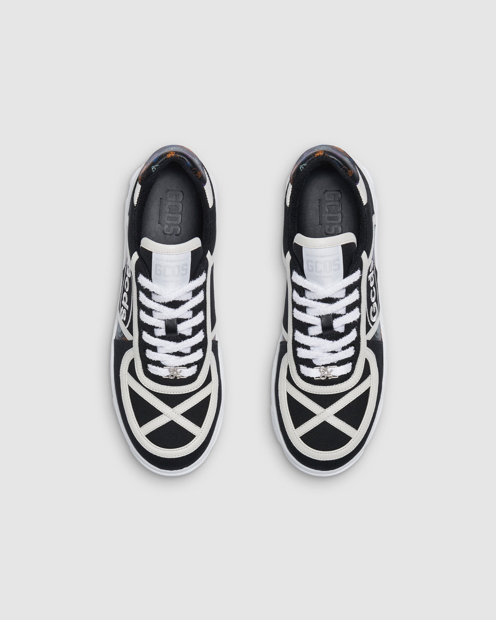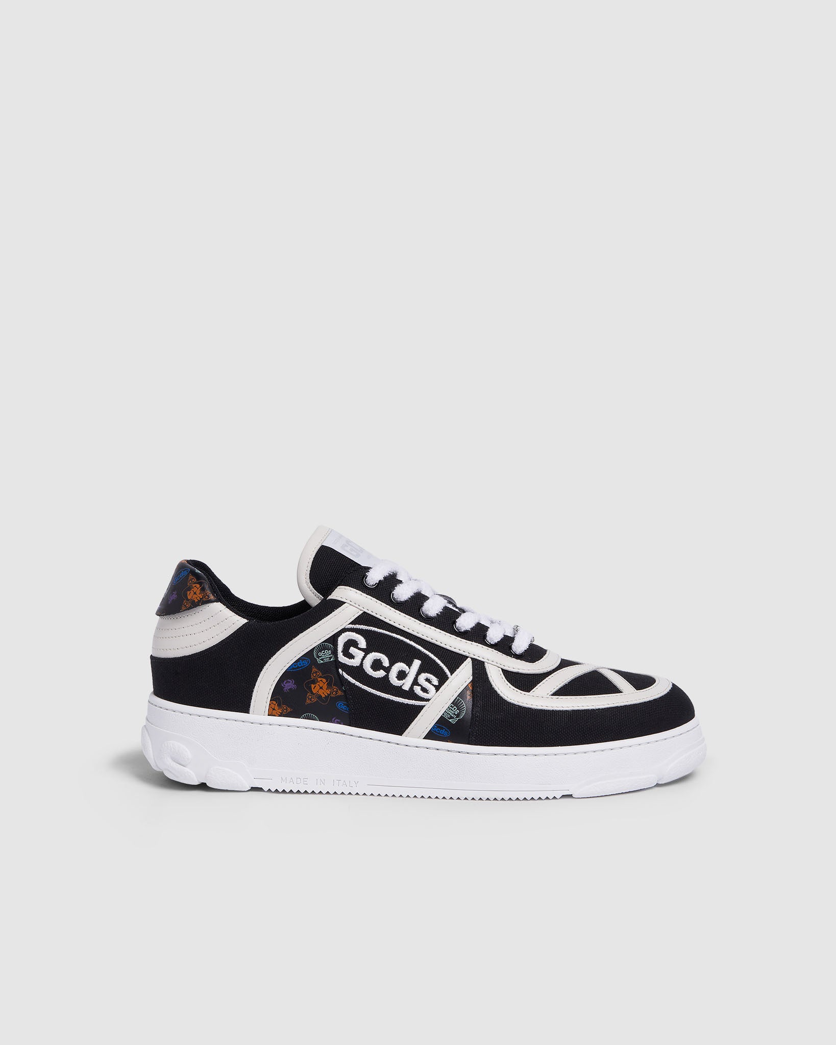 Basketball-inspired GCDS sneakers with a sports aesthetic. Vamp in canvas and leather printed with Shell motif, featuring prominent seams and contrast leather facing. Toebox with contrast leather X. On the side, seasonal GCDS logo embroidery. Nami box sole in the classic wave shape with logo on the outsole. Matching laces and Andy logo deubré.