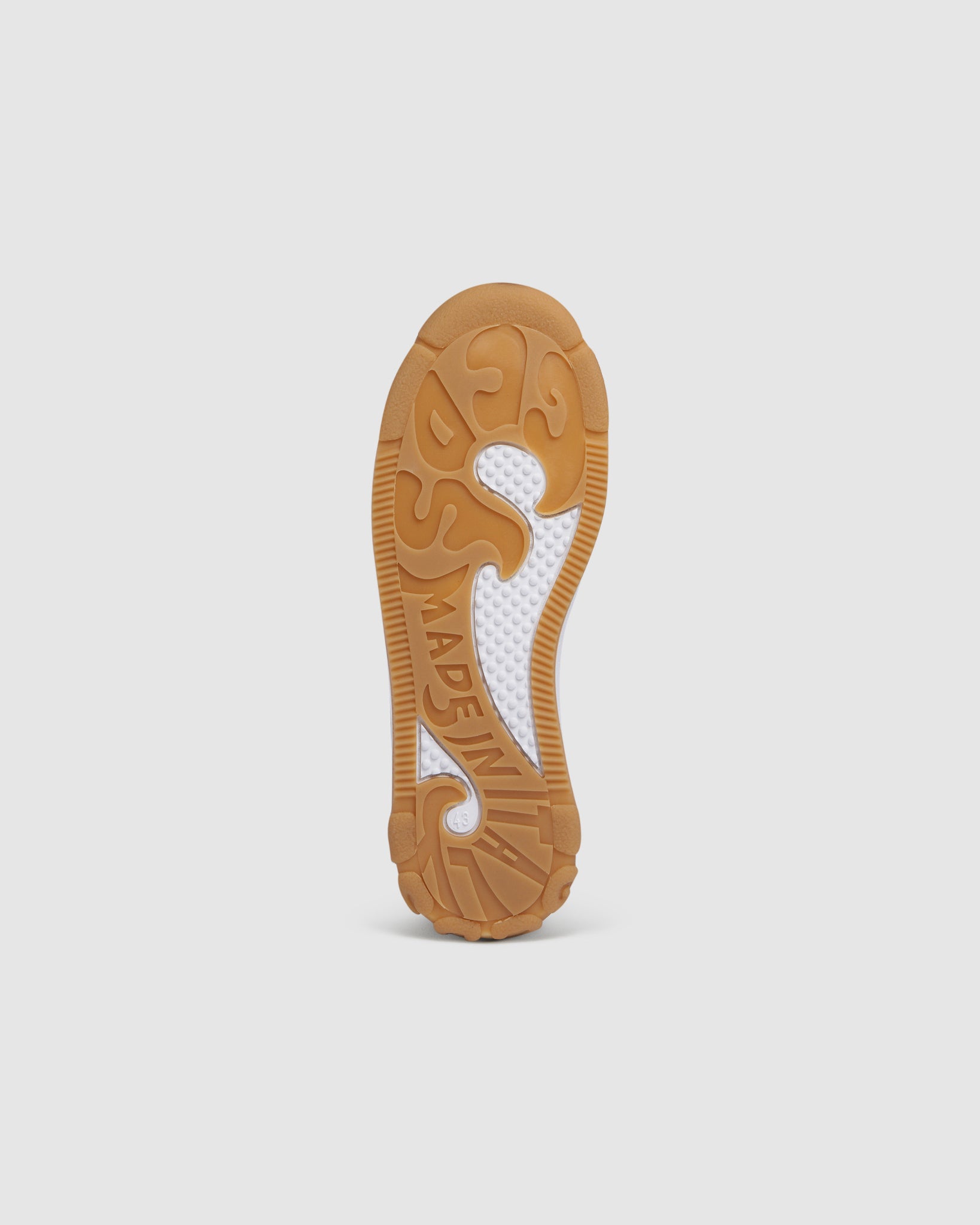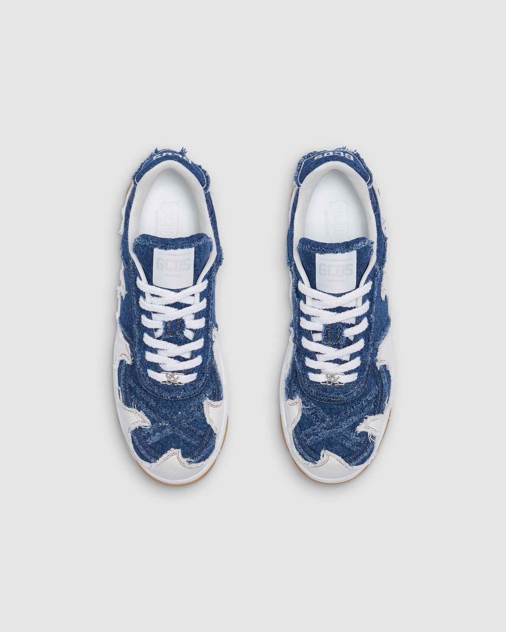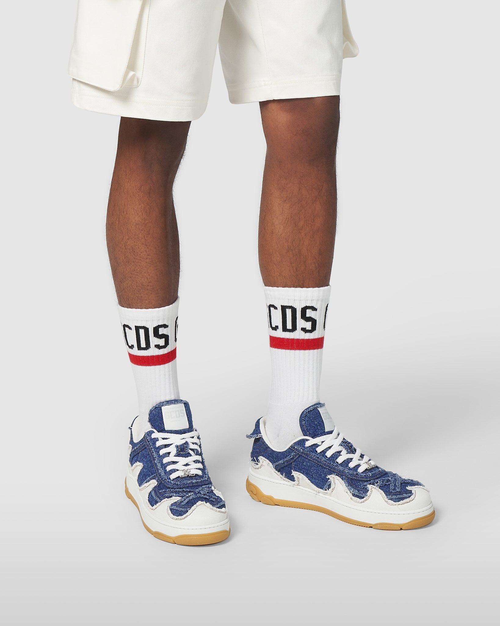 Basketball-inspired GCDS sneakers with a sports aesthetic. Vamp in light bleached effect stone washed frayed denim, featuring prominent seams and tobacco colored contrast topstitching. At the base of the vamp, wave motif in frayed canvas, appliquéd with tobacco colored topstitching. Toebox with denim X. Nami box sole in the classic wave shape with logo on the outsole. Matching laces and Andy logo deubré.