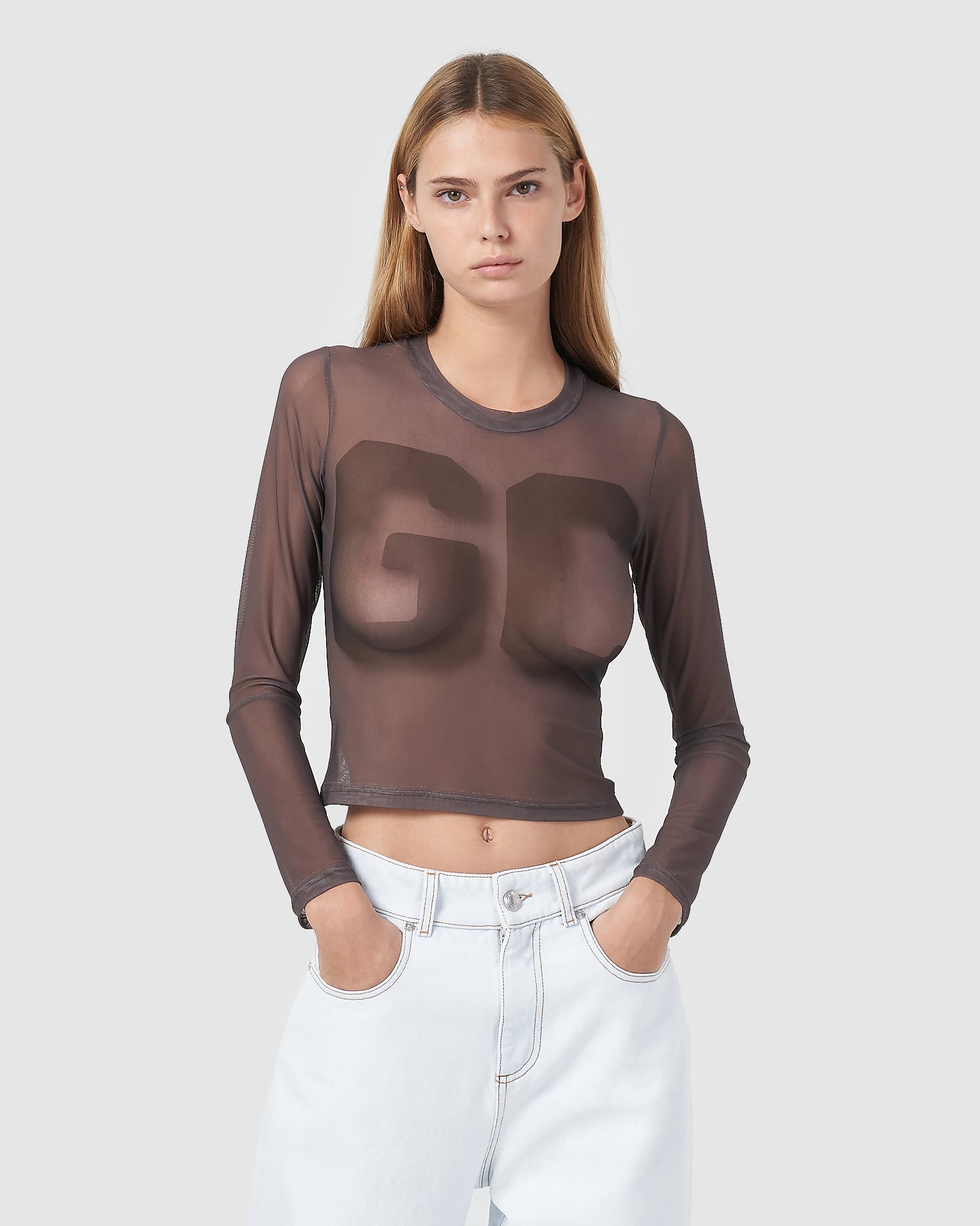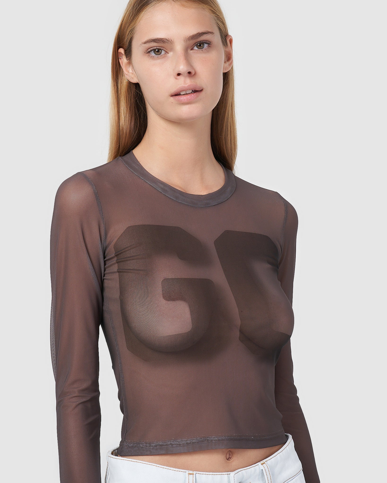 GCDS stretch tulle crew neck crop top with long sleeves. Maxi drop shadow effect logo print on the front and back. Logo patch in jacquard fabric on the center back.