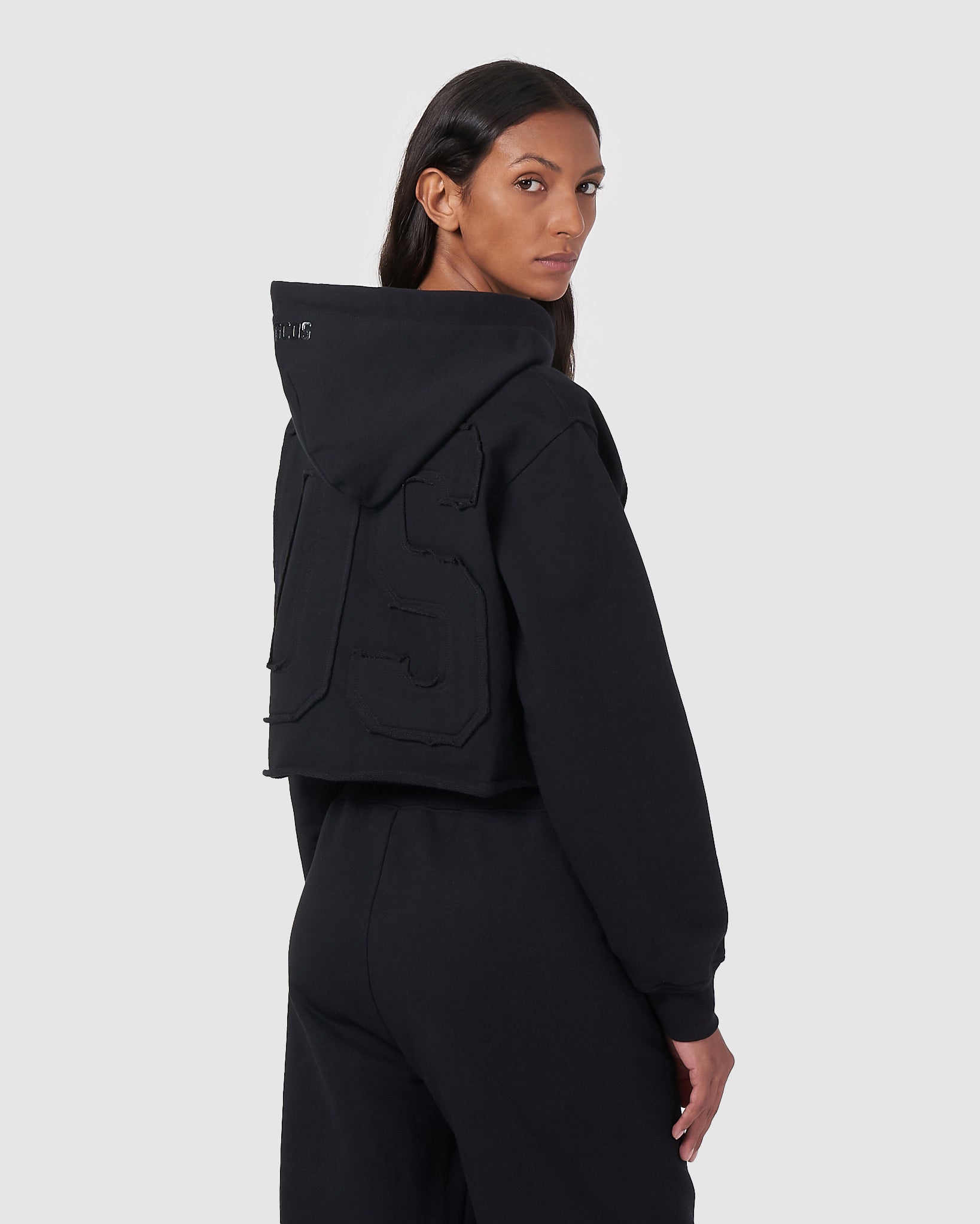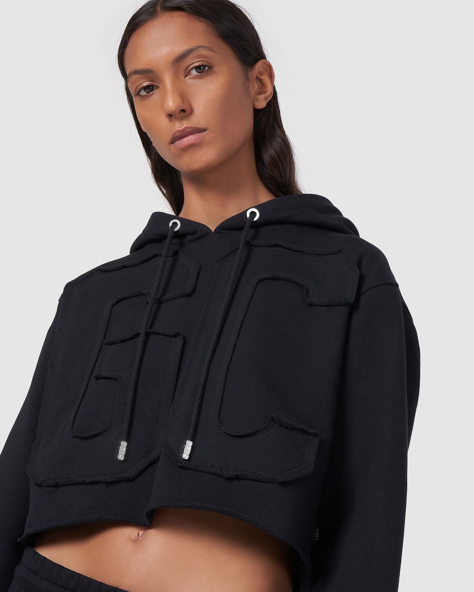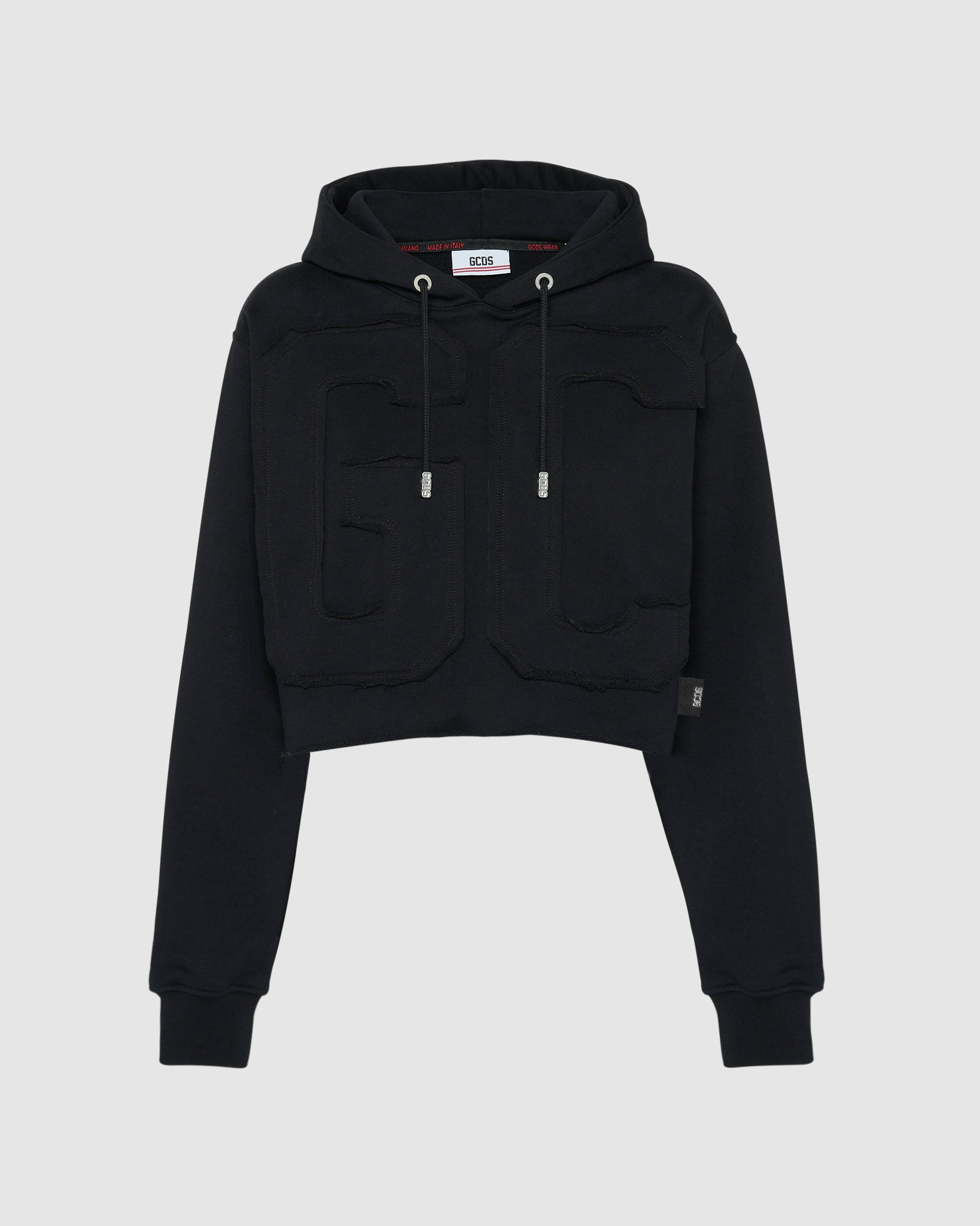 GCDS cropped long-sleeved sweatshirt with adjustable hood and raw-cut at the bottom. Frayed-cut logo lettering appliquéd with matching topstitching on the front and back. Logo print detail with polished 3D effect on the hood.