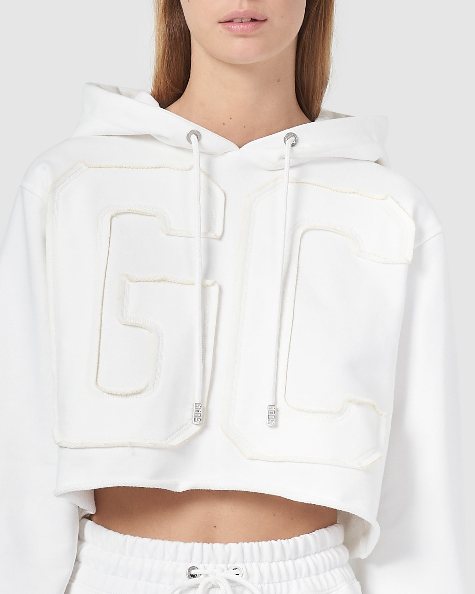 GCDS cropped long-sleeved sweatshirt with adjustable hood and raw-cut at the bottom. Frayed-cut logo lettering appliquéd with matching topstitching on the front and back. Logo print detail with polished 3D effect on the hood.