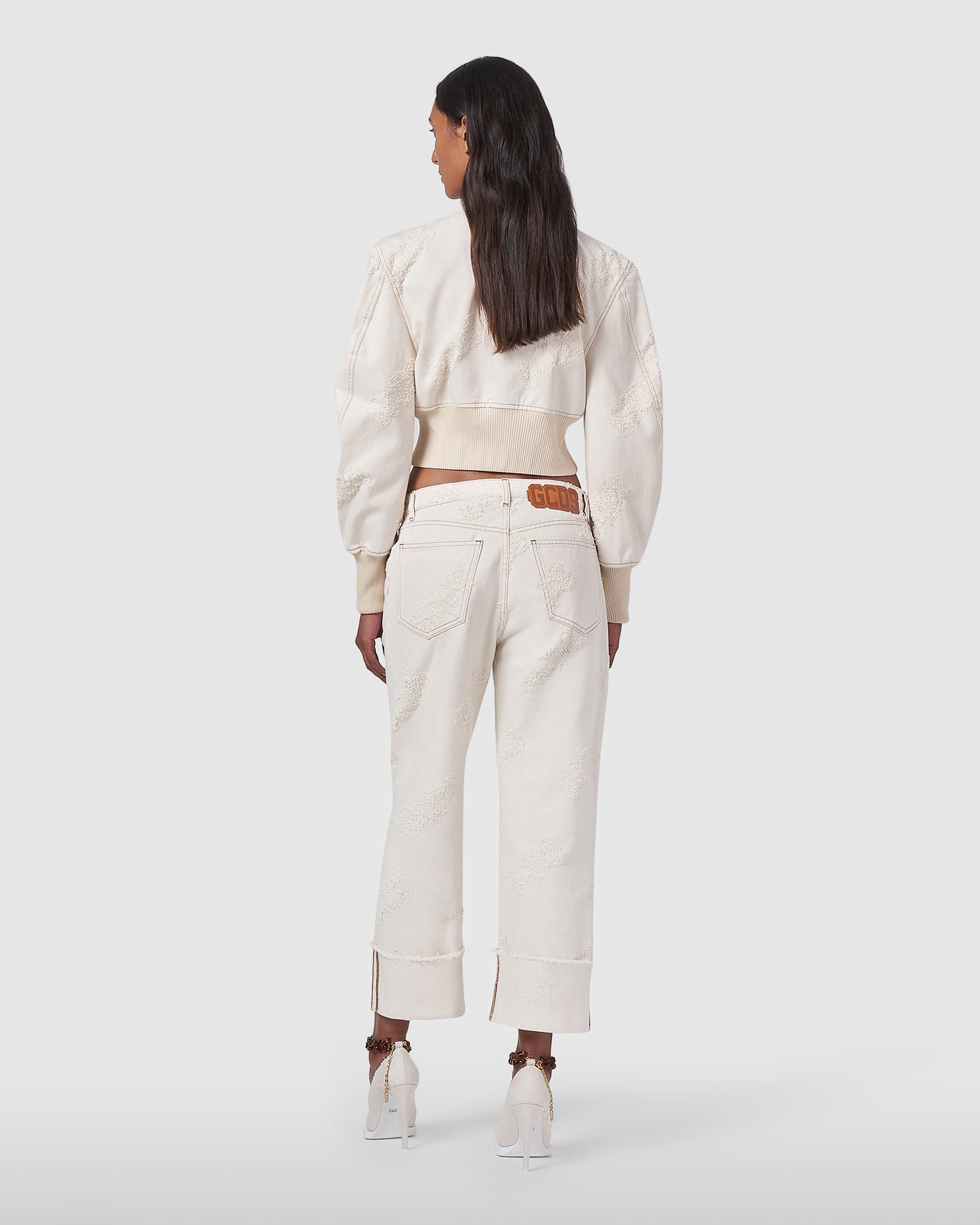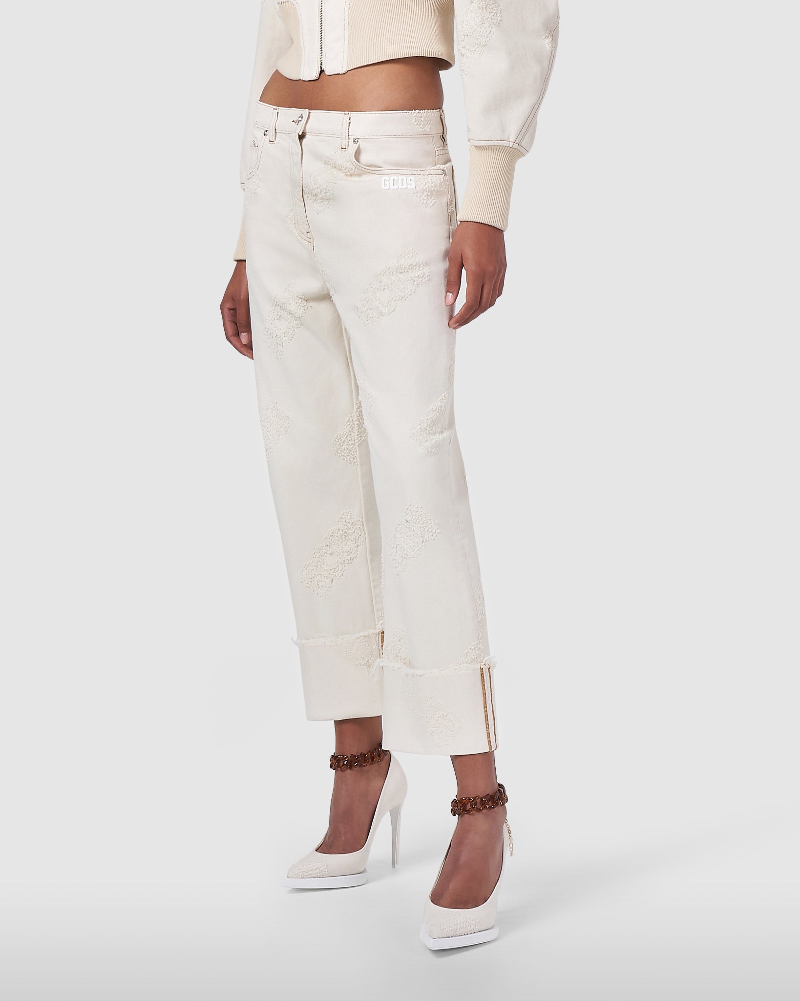 Low-waisted GCDS denim jeans with bouclé effect laser logo and contrasting tobacco-colored topstitching. Raw-cut at the bottom and turn-up with contrasting topstitching. Regular fit, loose leg cut.