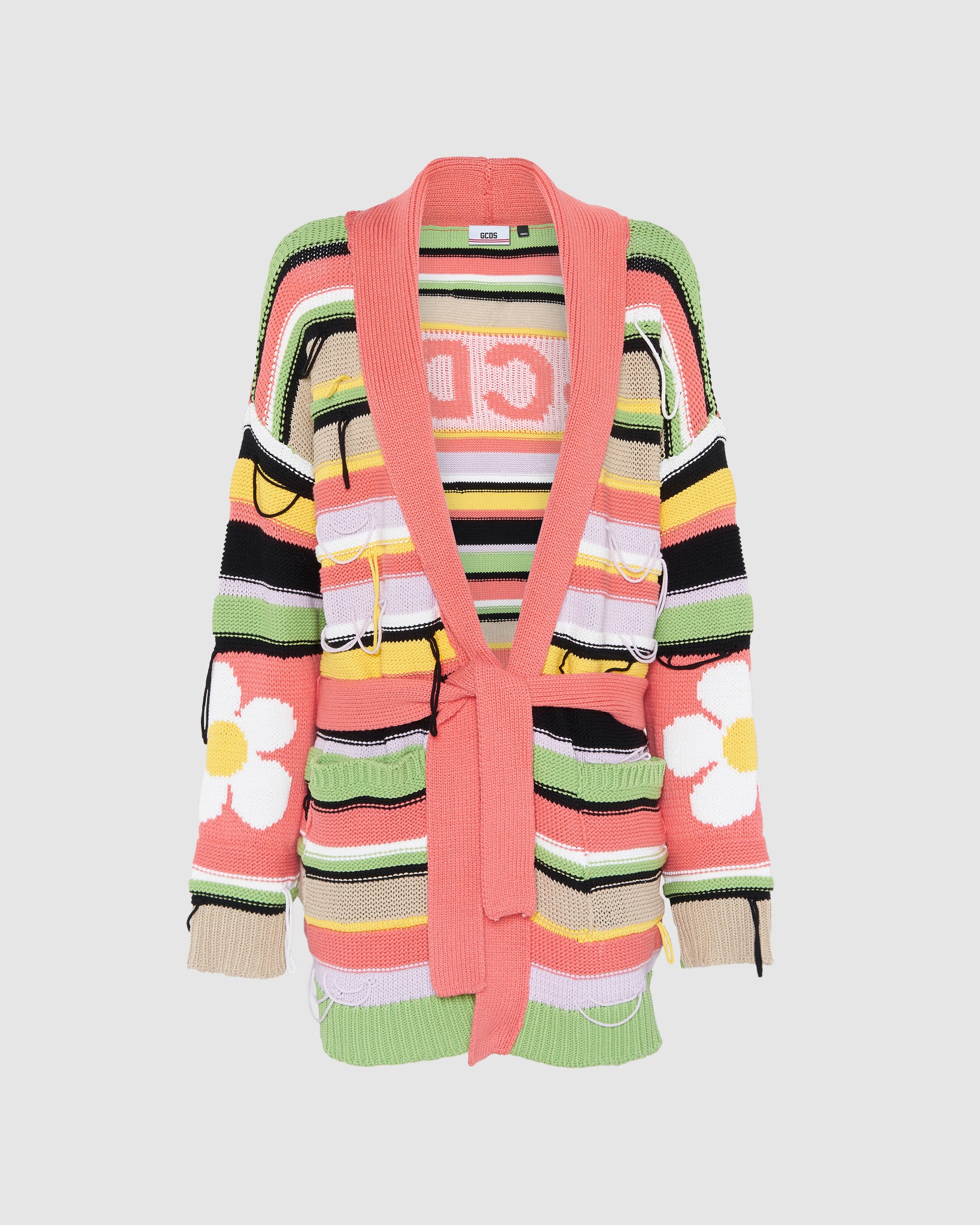 GCDS cardigan in chunky effect cotton blend with alternated plain knit, one plain, one purl, with imperfections and floating threads, characterized by daisies inlaid on the sleeves. Neck with wide lapels and band on the waist. Inlaid GCDS logo on the back. Over-sized.