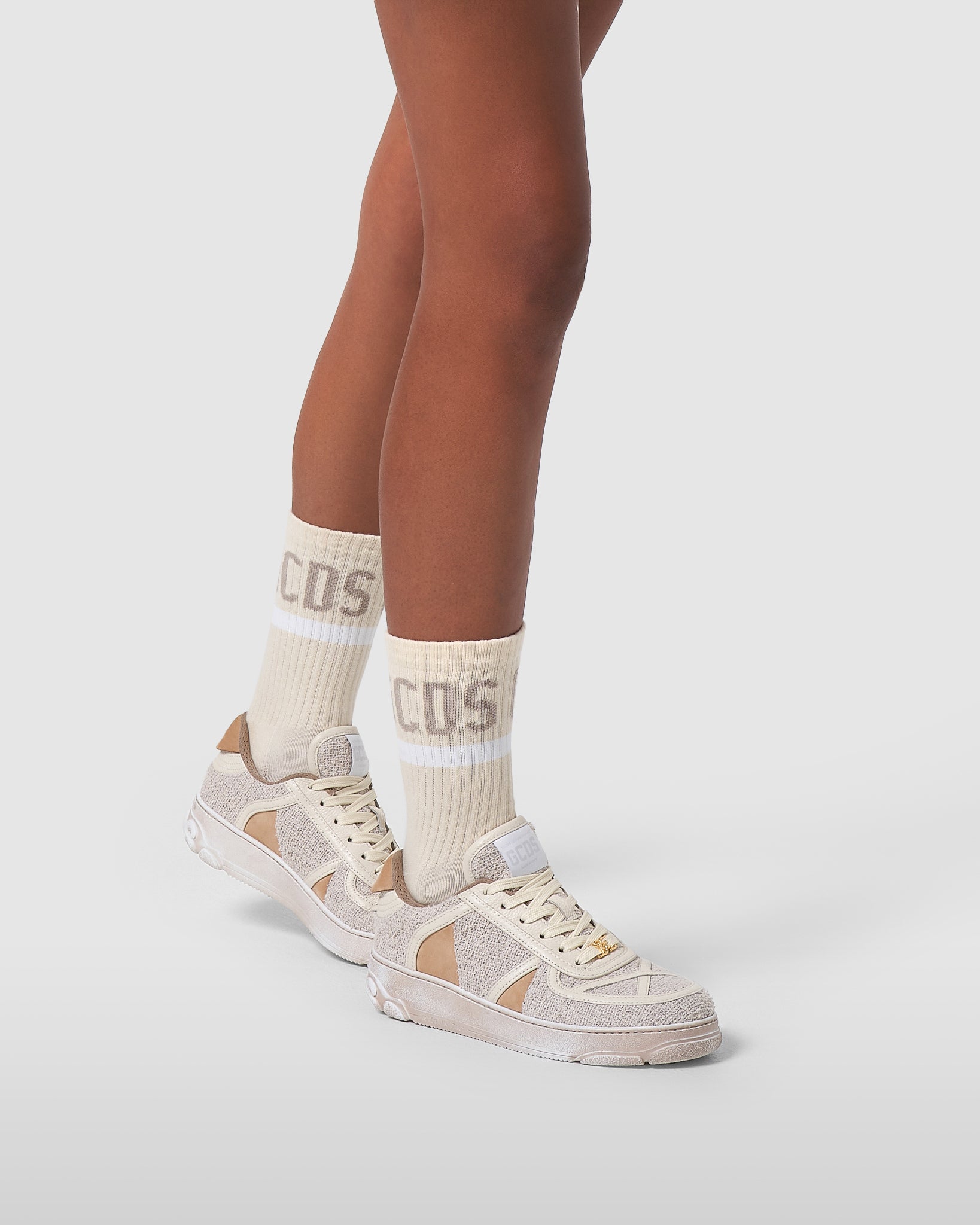 Basketball-inspired GCDS sneakers with a sports aesthetic. Bouclé, nubuck and calfskin leather vamp characterized by prominent matching leather cuts and seams. Toebox with matching leather X. Nami box sole in the classic wave shape with logo on the outsole. Matching laces and Andy logo deubré. Distressed effect sole.