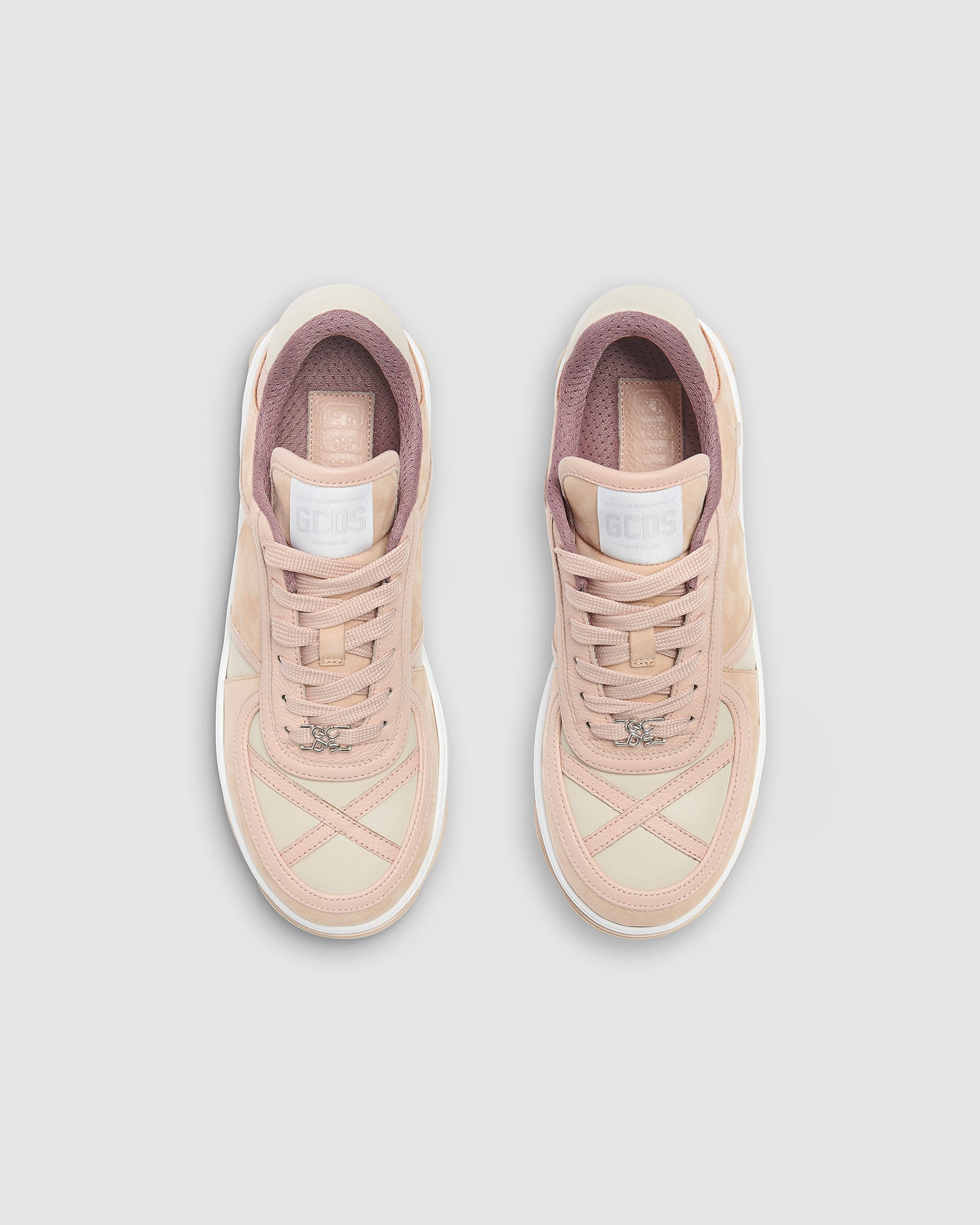Basketball-inspired GCDS sneakers with a sports aesthetic. White calfskin leather vamp with different grains characterized by prominent cuts. Toebox with matching leather. Nami box sole in the classic wave shape with logo on the outsole. Matching laces and Andy logo deubré.