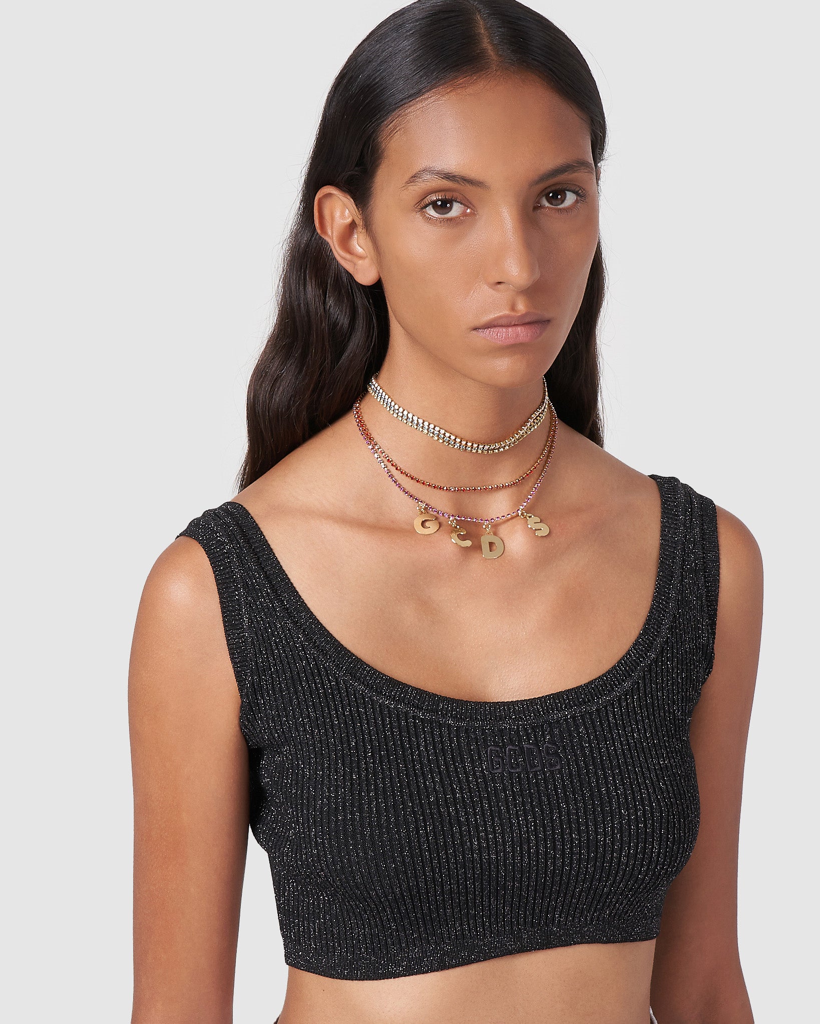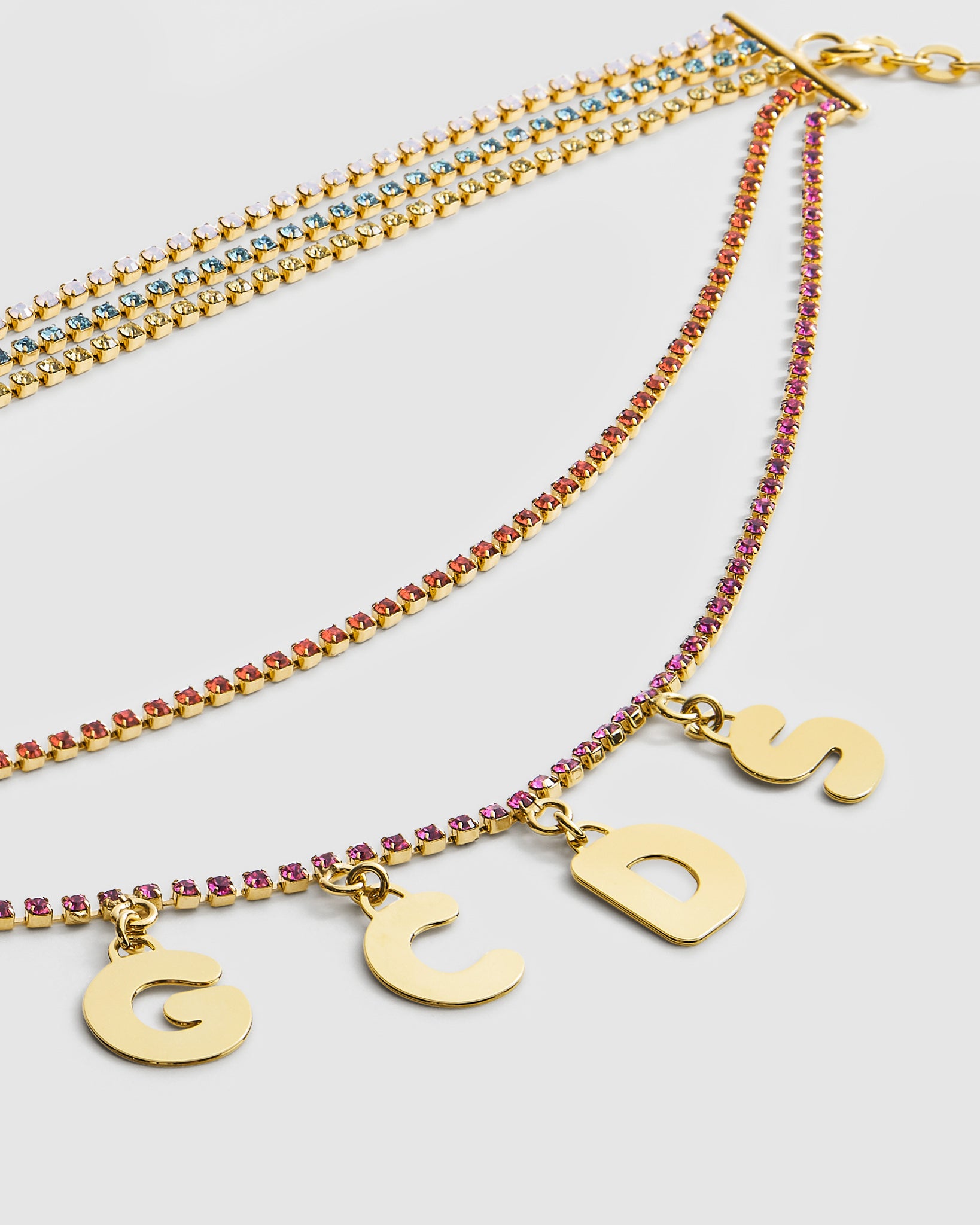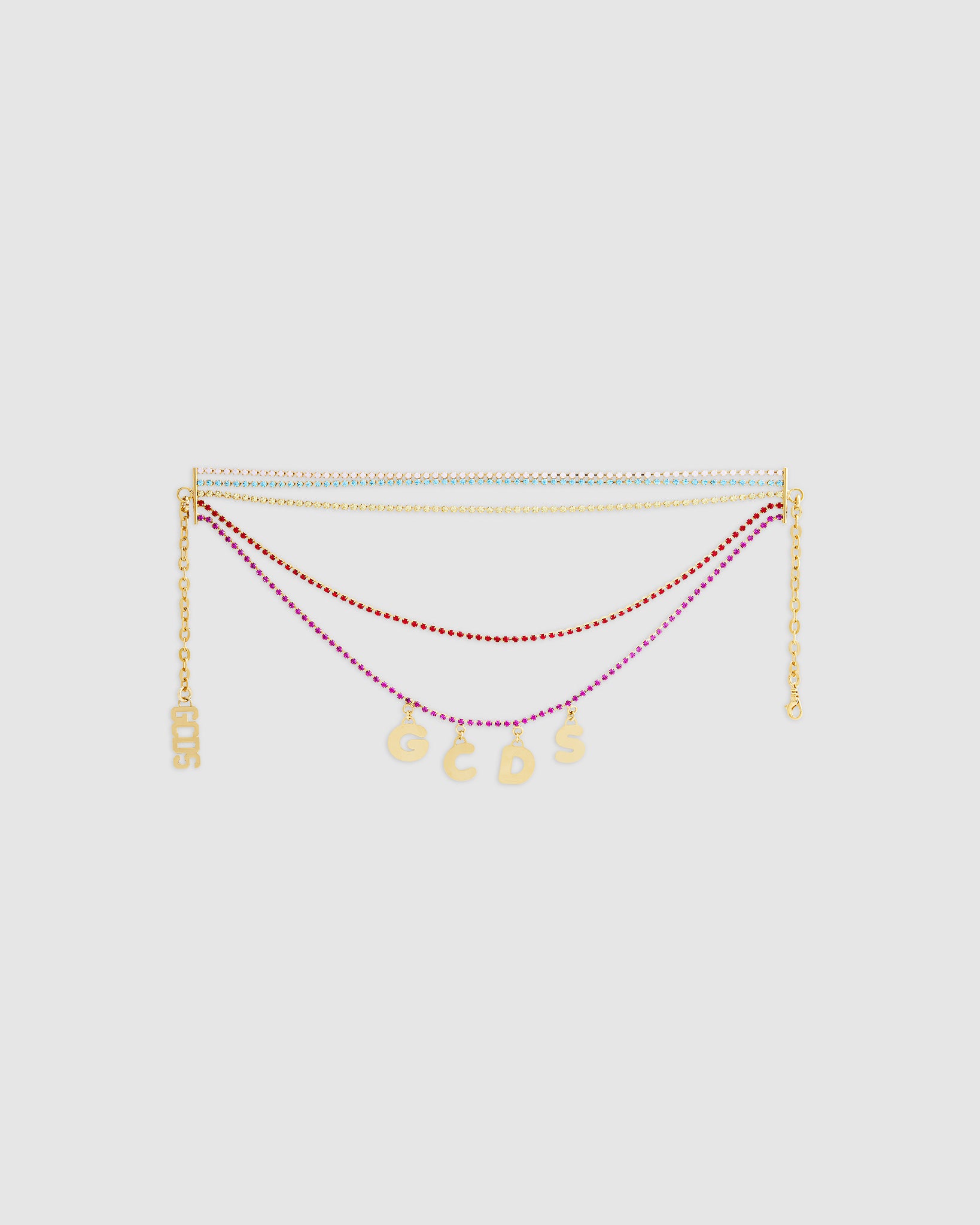 GCDS waterfall choker made with a mix of different colored rhinestone chains. Logo lettering charms. Snap hook closure embellished with hanging polished gold finish GCDS logo.
