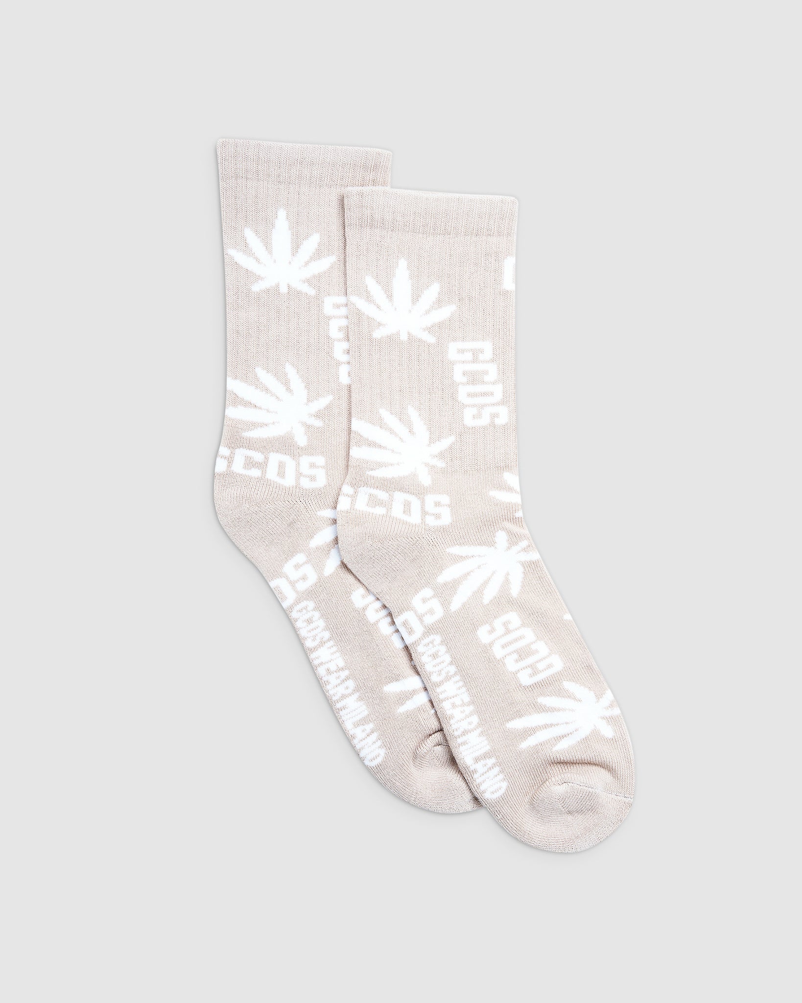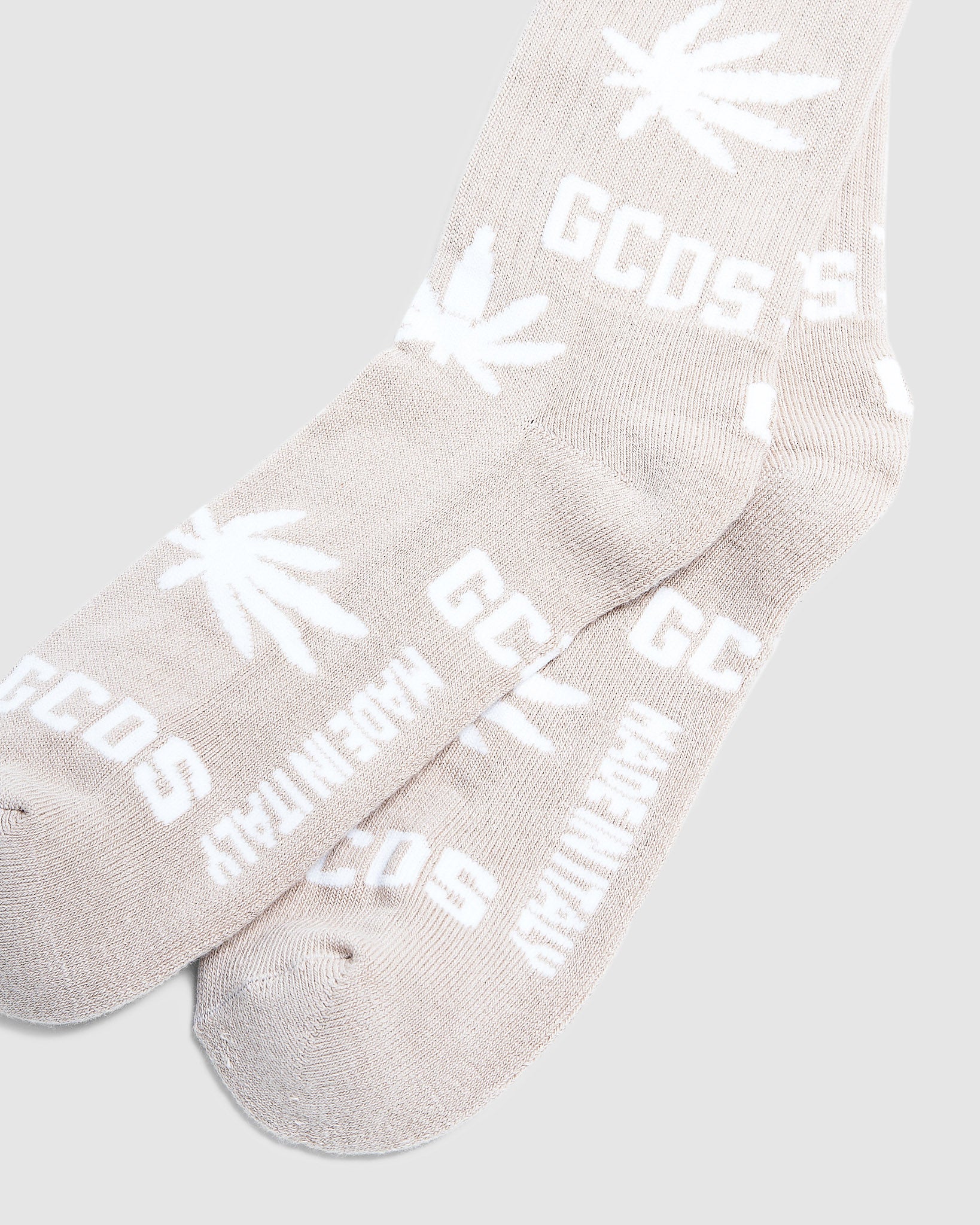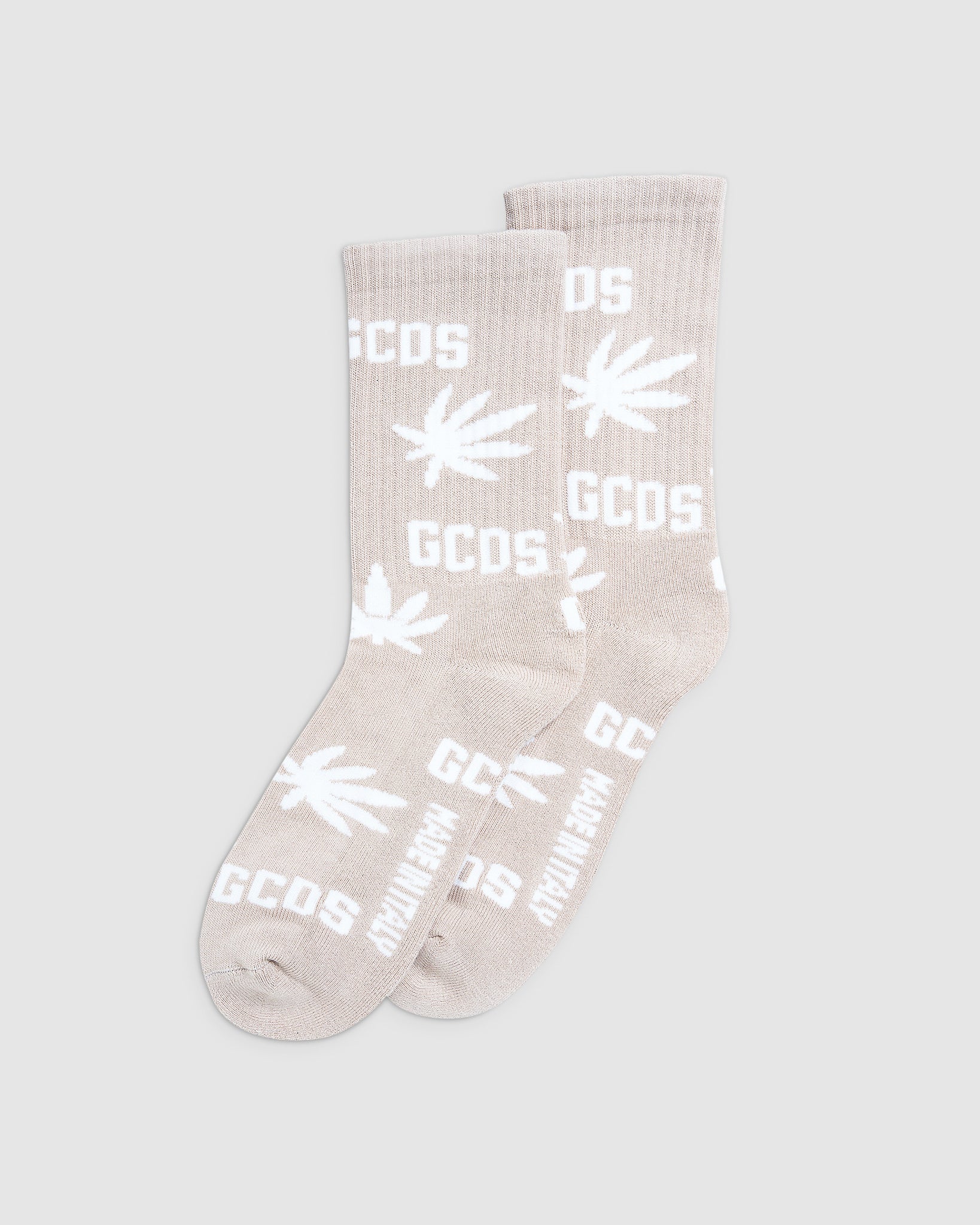 GCDS socks in rib knit cotton blend with all-over marijuana leaf motif pattern and logo. “Made in Italy” graphic on the sole.