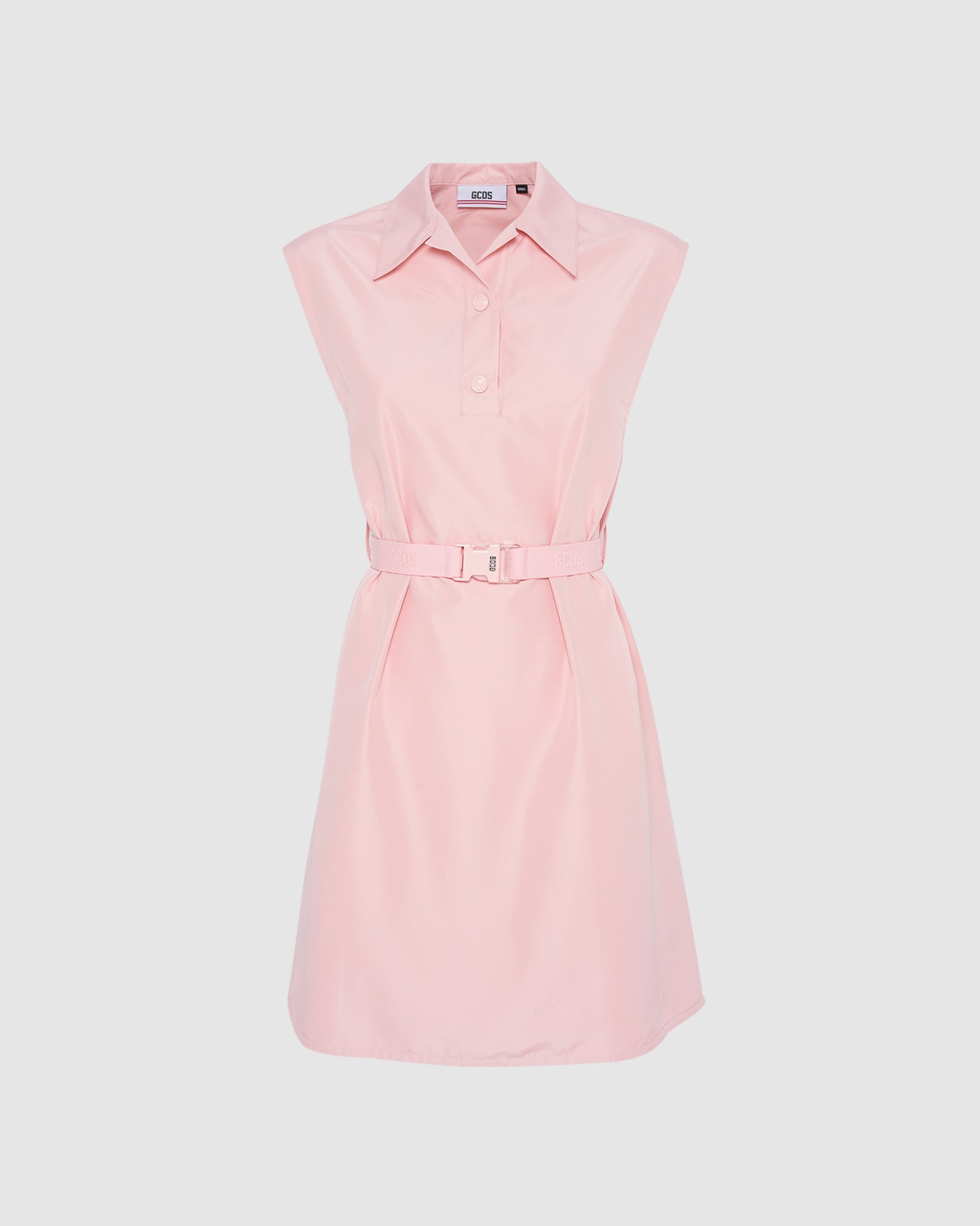 GCDS sleeveless nylon dress with collar and two-button closure. Loops on the waist and matching elastic logo waistband characterized by snap buckle with matching polished finish and polished nickel logo plate. On the back, GCDS Wear logo print. Soft silhouette.