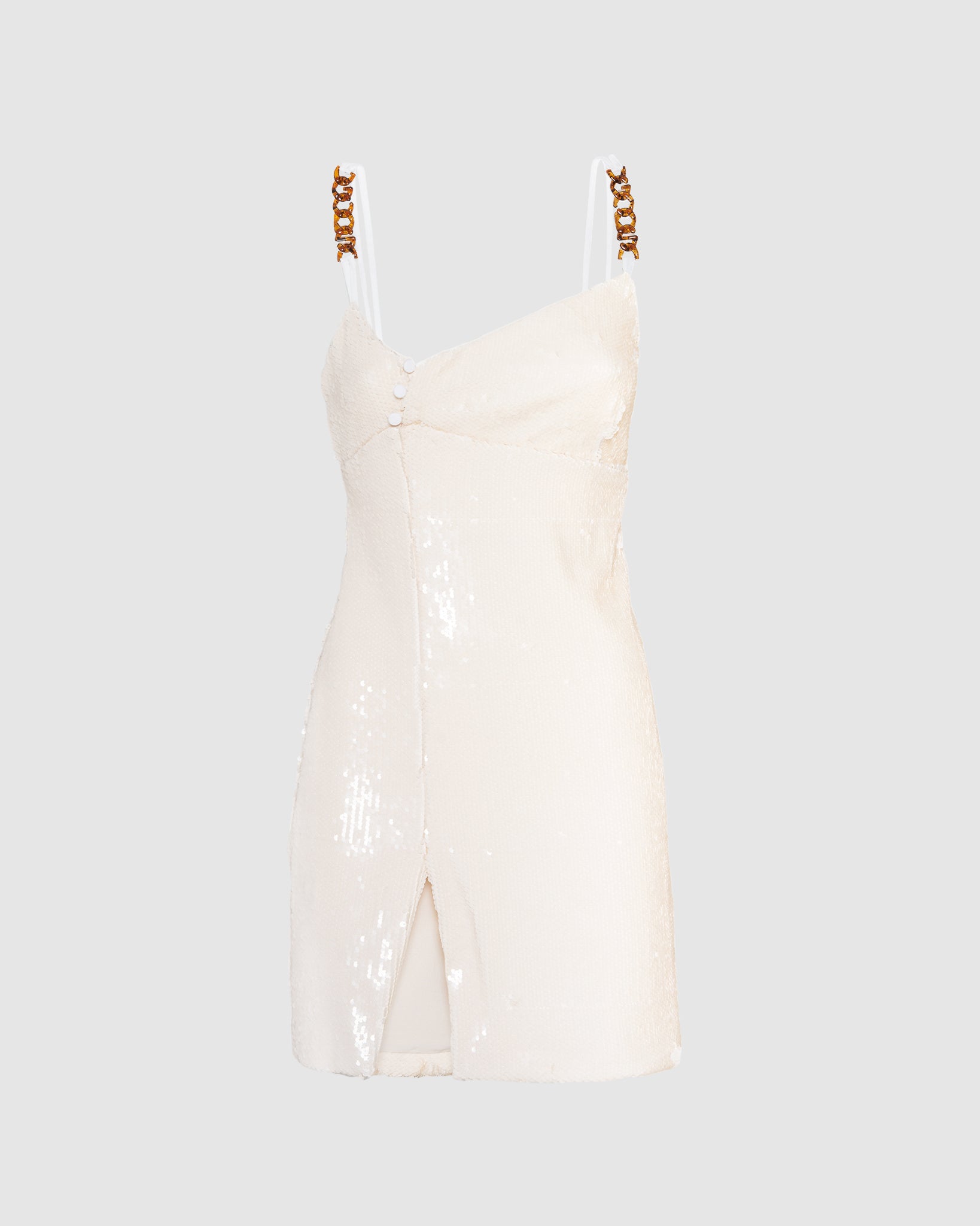 GCDS mini dress in sequined fabric with an asymmetrical neckline and double shoulder strap with a tortoiseshell acetate GCDS chain insert. Three covered buttons on the front and a slit at the bottom. Invisible zipper on the left hip.