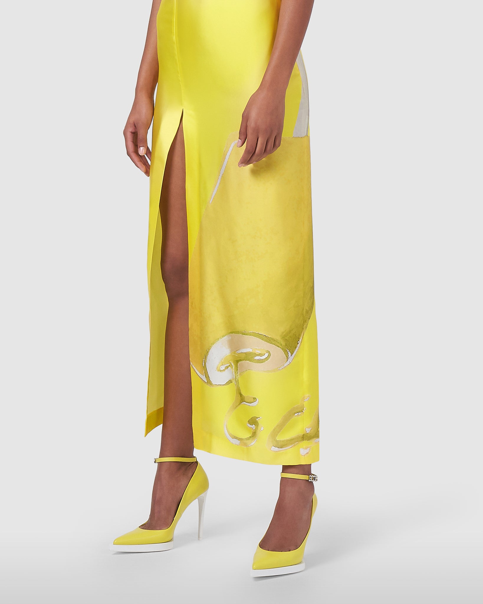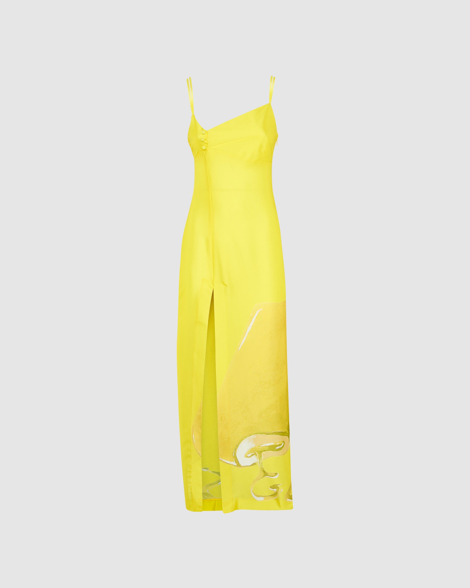 GCDS long printed polyester dress with an asymmetrical neckline and double shoulder straps. On the front, three covered buttons. Wide slit. Ice Cream print on the bottom. Invisible zipper on the left hip.